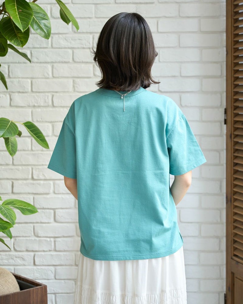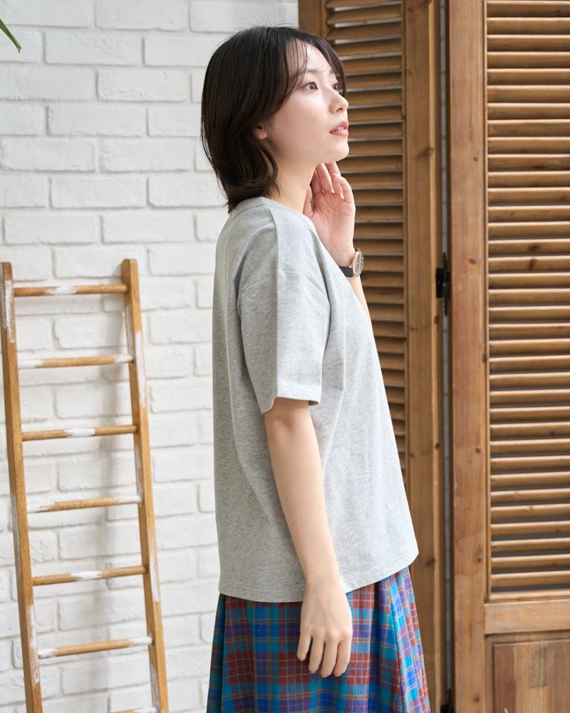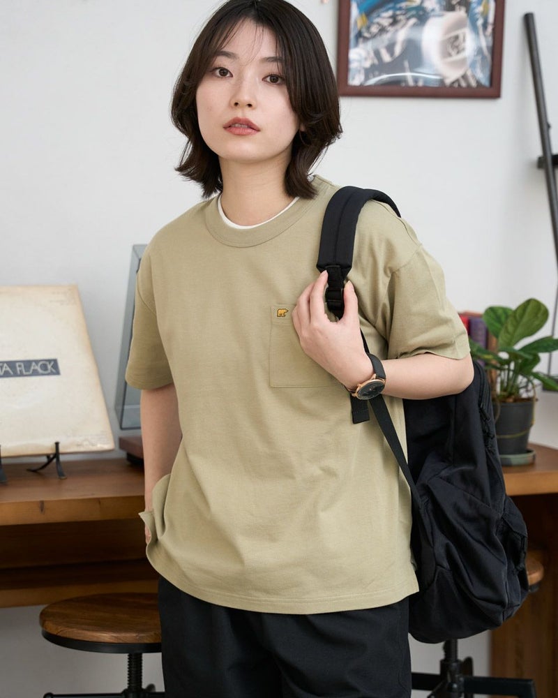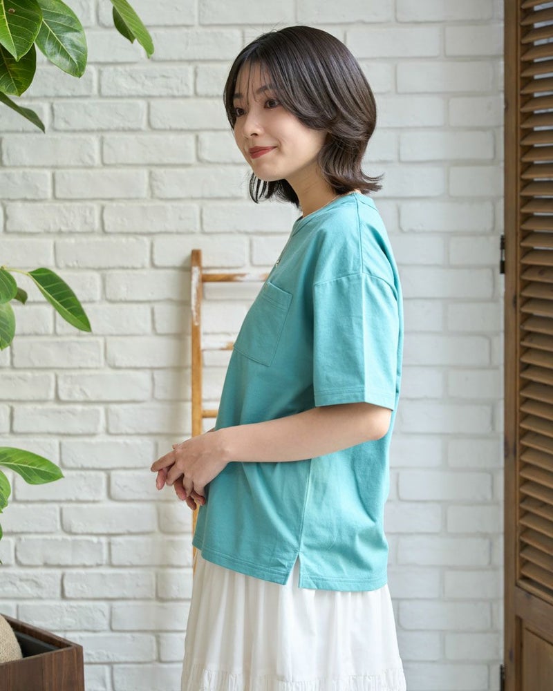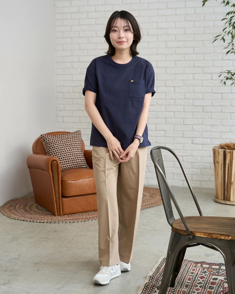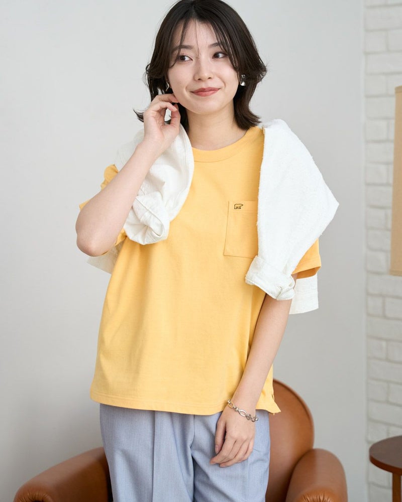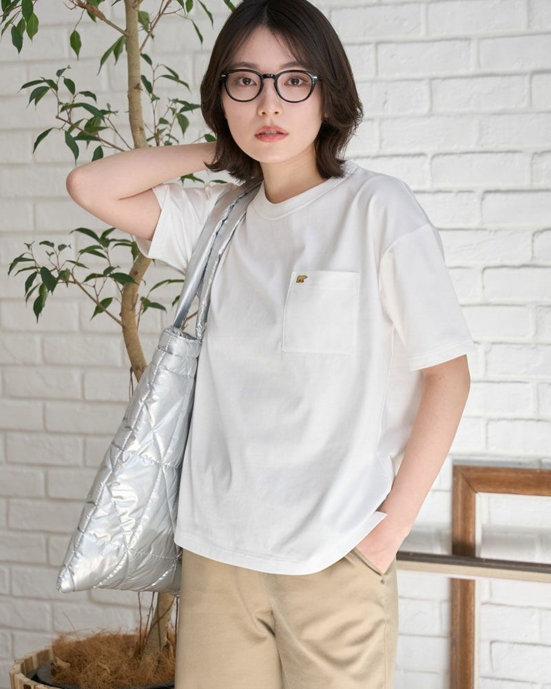 接触冷感・吸水速乾性機能付き。滑らかな肌触りが特長のGB天竺を使用したTシャツです。襟ぐりは強度のあるフライスを使用、バインダー始末にすることでヨレにくいのが特徴です。左胸ポケットにゴールデンベア刺繍付き。ドロップショルダーの五分袖で全体にゆったりとした分量感です。 モデル身長: 162 cm 着用サイズ: M サイズ Golden Bear WOMEN カットソー (WOMEN) 同デザイン大きい(3L,4Lサイズ)はこちら キッズサイズはこちら メンズサイズはこちら 家族コーディネートアイテムはこちら 【着用アイテム】467U1701 リブ付きガウチョパンツ 467U2703 シャーリングスカート 468U2750 ストレートストレッチパンツ 467RD011 キルトトートバッグ