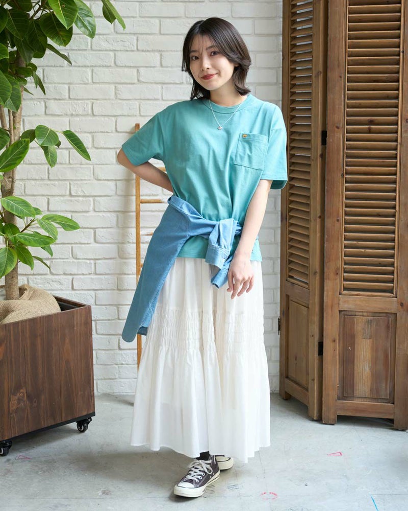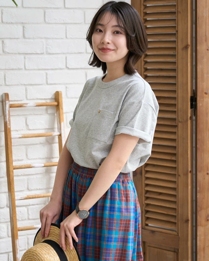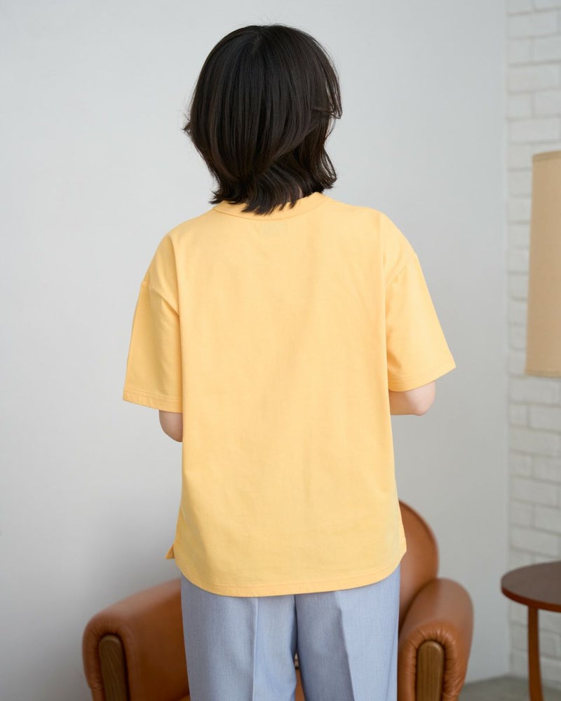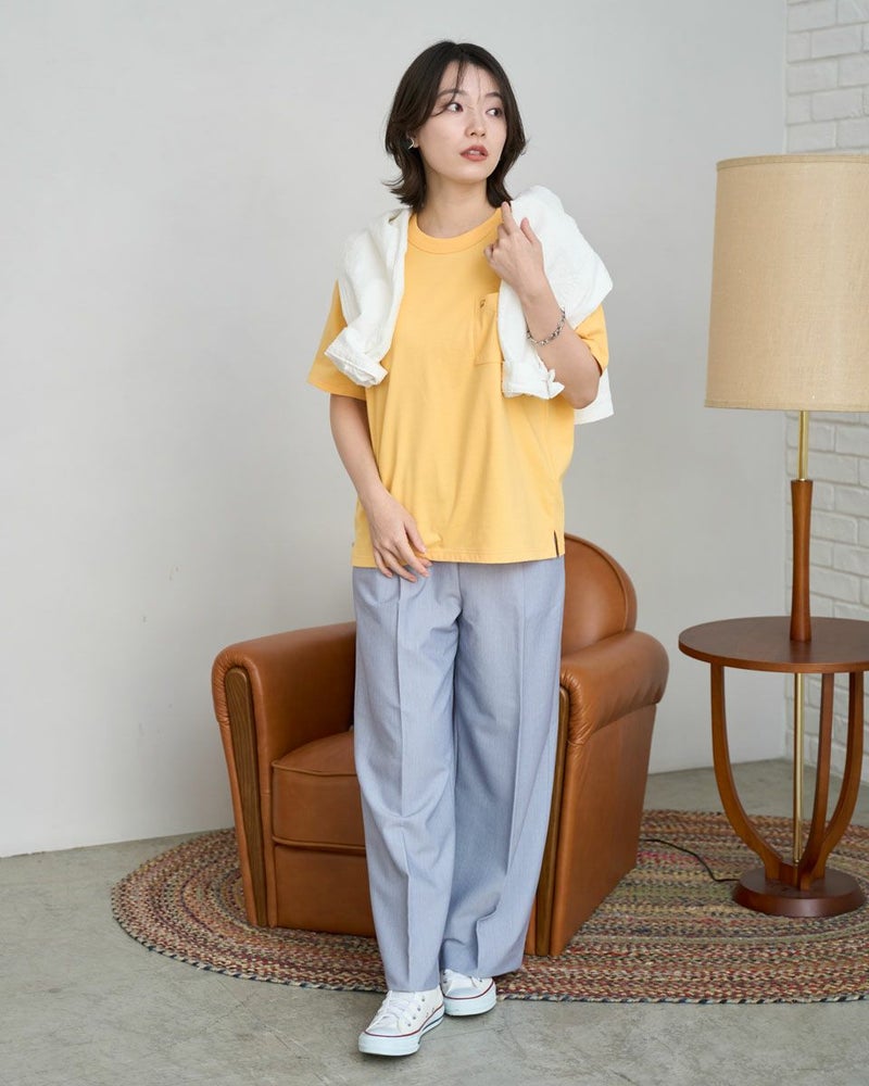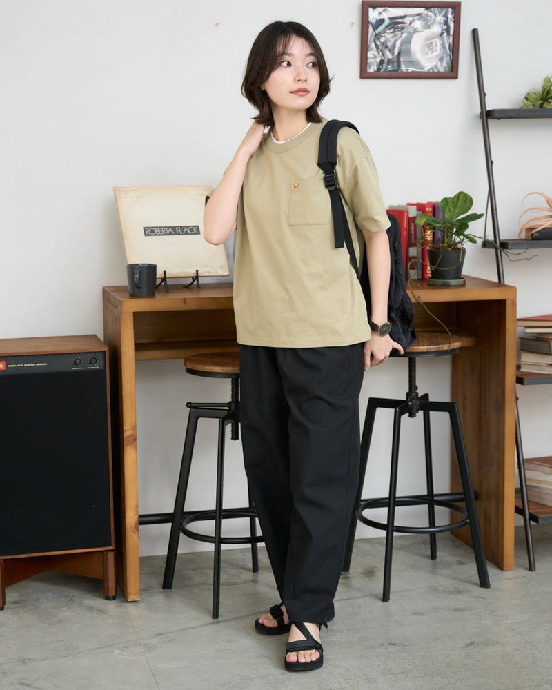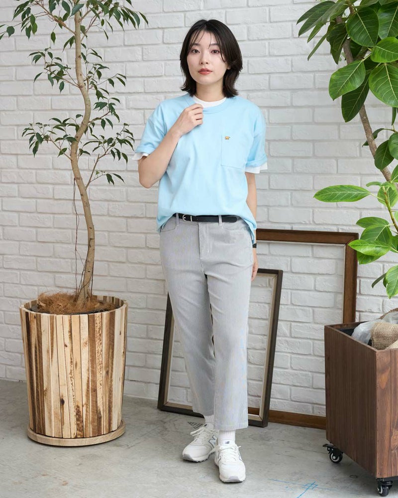 接触冷感・吸水速乾性機能付き。滑らかな肌触りが特長のGB天竺を使用したTシャツです。襟ぐりは強度のあるフライスを使用、バインダー始末にすることでヨレにくいのが特徴です。左胸ポケットにゴールデンベア刺繍付き。ドロップショルダーの五分袖で全体にゆったりとした分量感です。 モデル身長: 162 cm 着用サイズ: M サイズ Golden Bear WOMEN カットソー (WOMEN) 同デザイン大きい(3L,4Lサイズ)はこちら キッズサイズはこちら メンズサイズはこちら 家族コーディネートアイテムはこちら 【着用アイテム】467U1701 リブ付きガウチョパンツ 467U2703 シャーリングスカート 468U2750 ストレートストレッチパンツ 467RD011 キルトトートバッグ