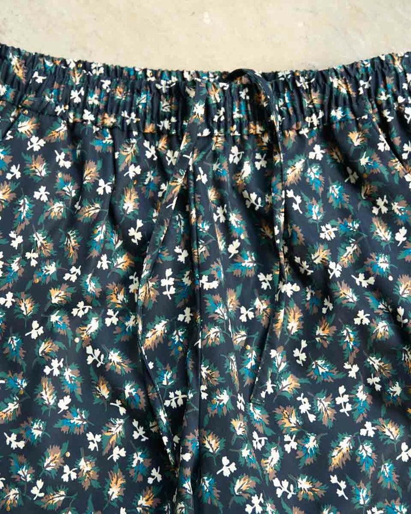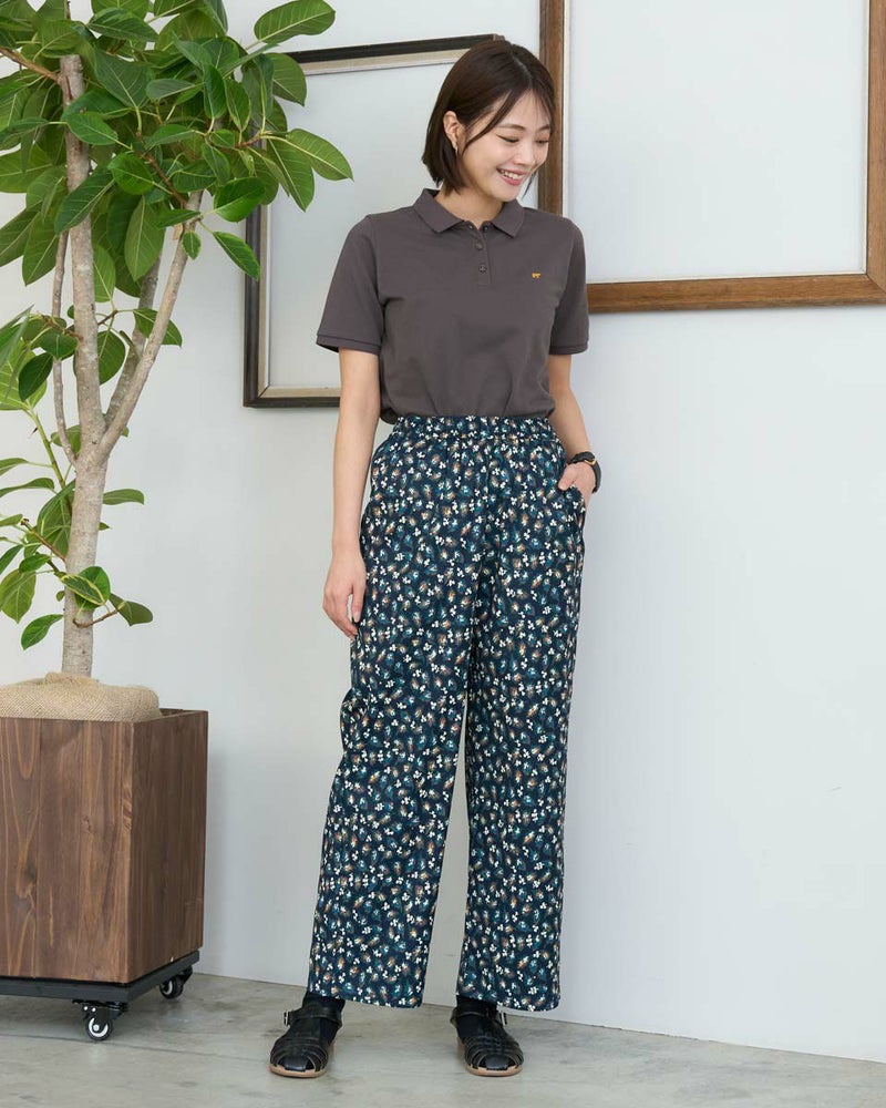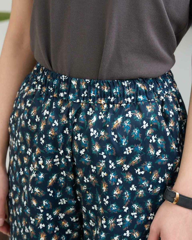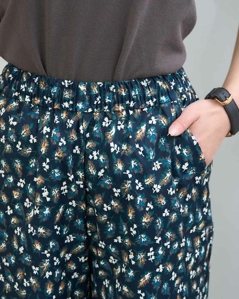 さらっとした素材感のプリントパンツです。ウエスト総ゴムではきごこちが良くリラックス感のあるセミワイドパンツです。プリント生地にはさりげないアクセントとしてゴールドの水玉プリントをのせています。シンプルトップスとの相性抜群です。