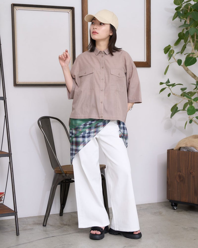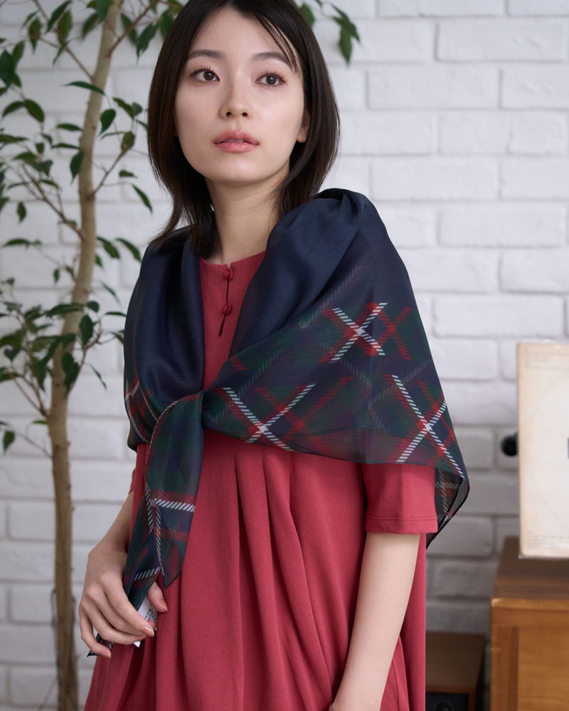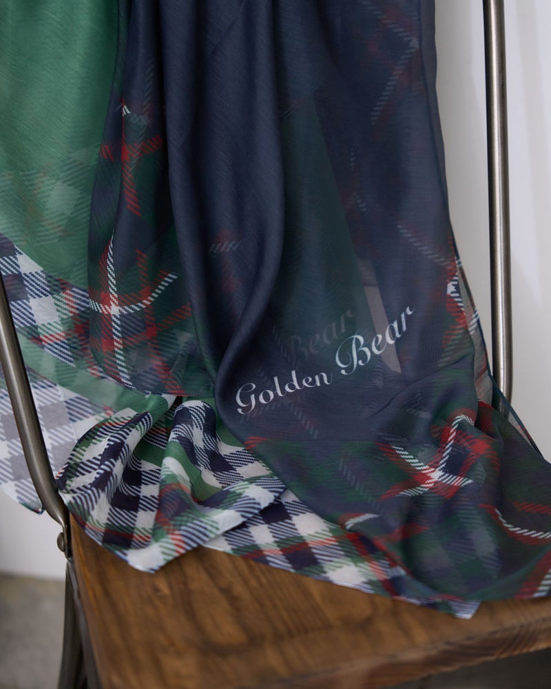 透け感のシフォン素材にGBチェック柄をプリントしました。ふわりと揺れる軽やかさで顔まわりを華やかにします。冷房対策としてバッグに忍ばせてもシワになりにくい優秀アイテムです。 Golden Bear WOMEN アクセサリー (WOMEN) 【着用アイテム】467U4312 フラップポケットシャツ 467U4413 タックカットソー 468U4751 ワイドデニムパンツ