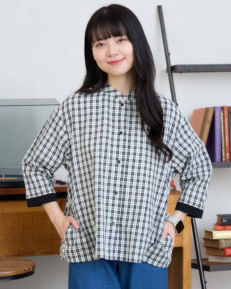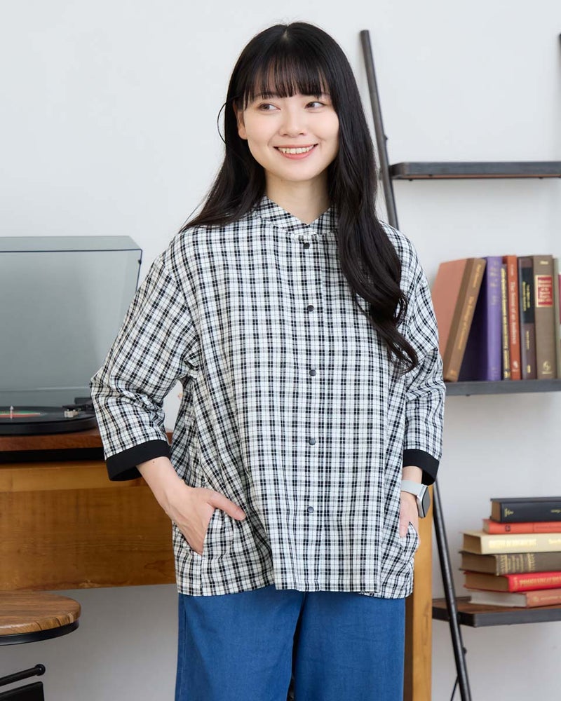 綿麻素材を使用した、アウター感覚の羽織シャツです。Tシャツの上にラフに羽織るのはもちろん、ボタンを留めて一枚着としても様になります。細かなチェック柄に、襟の形や袖口のリブなど細部にこだわったデザインが魅力。これからの季節の羽織りとして、カジュアルスタイルにさらりと馴染む万能な一着です。