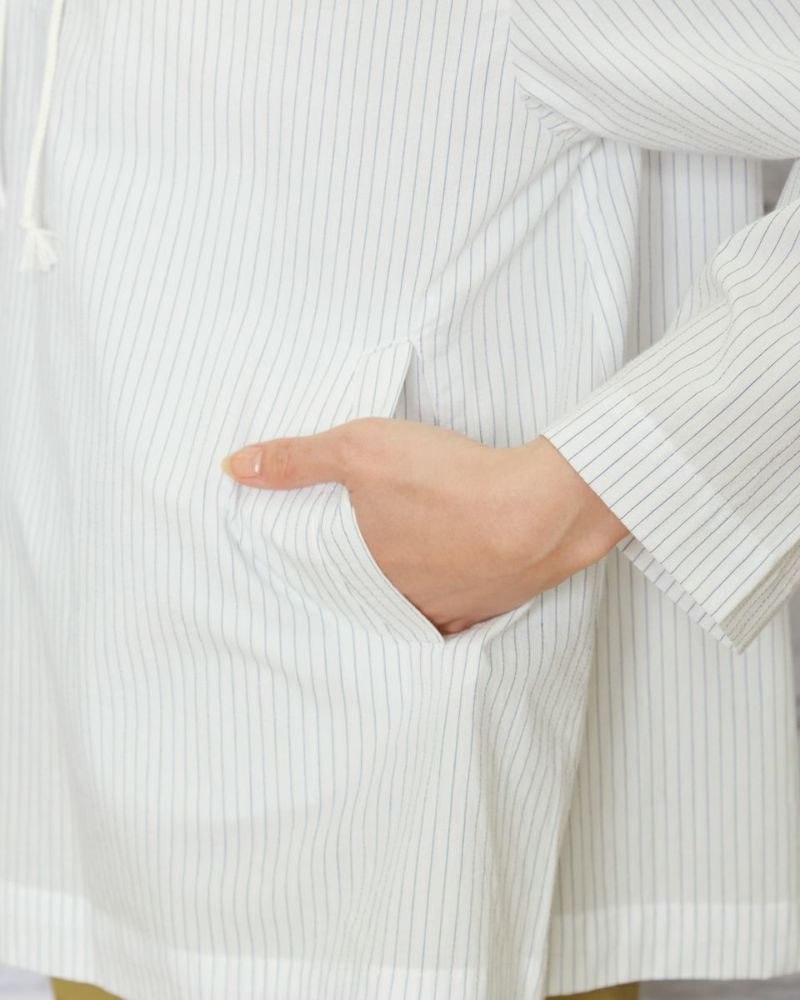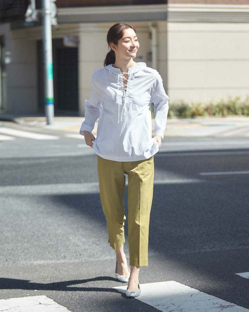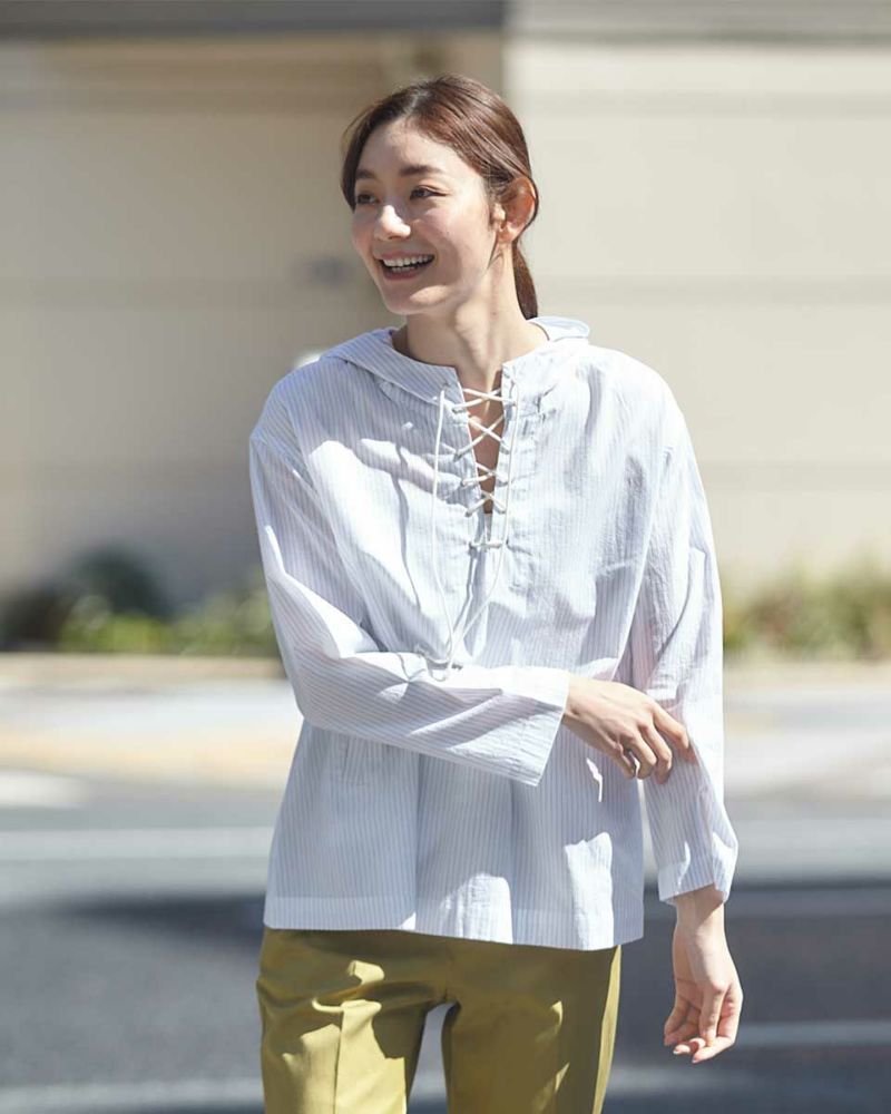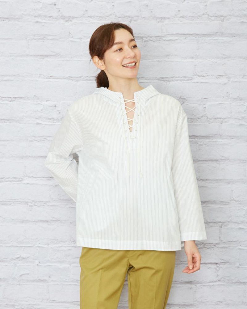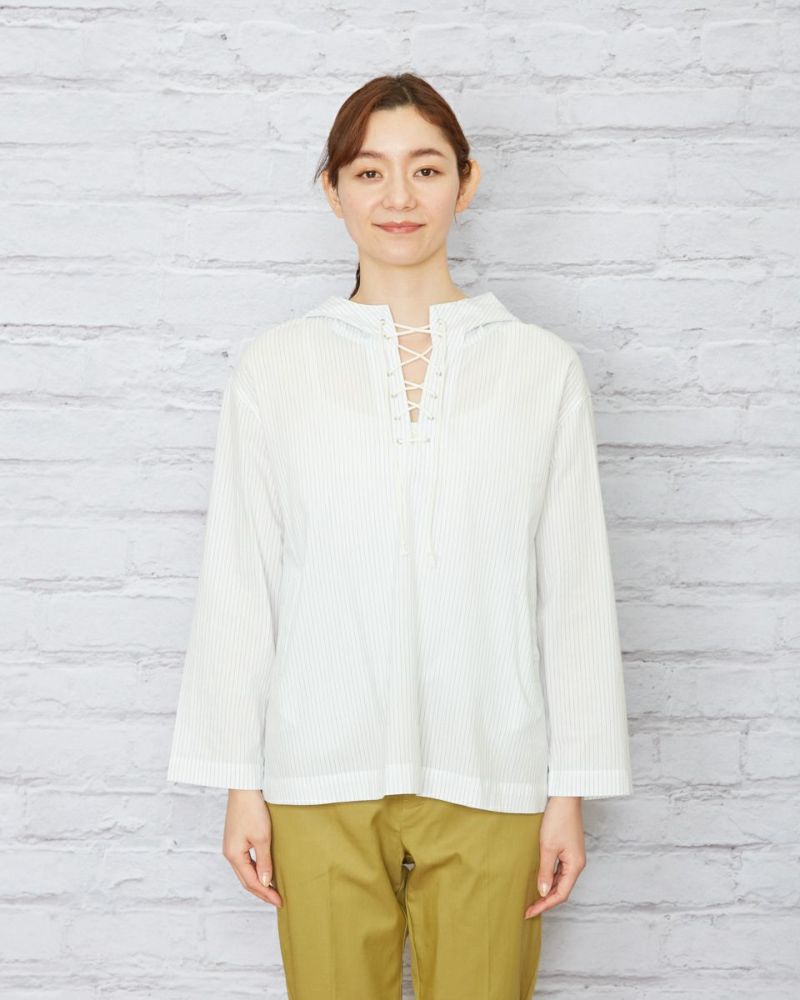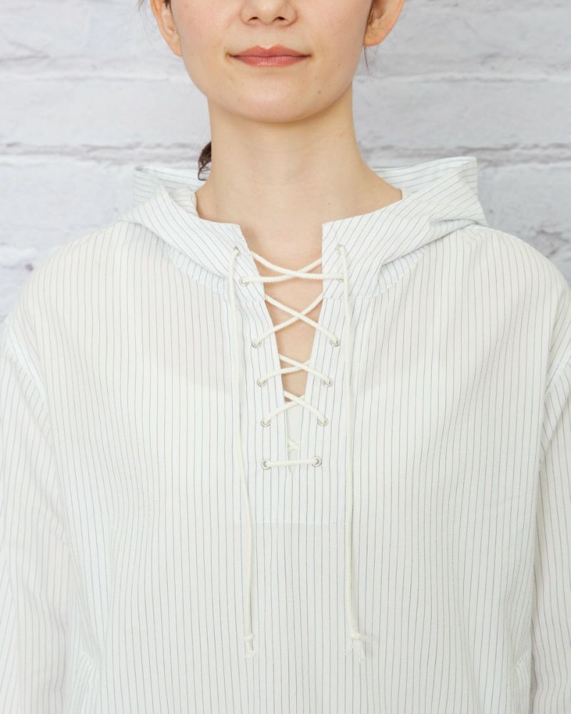 ヤッケをイメージした被りのブラウスで、フードとフロントの編み上げがポイント。