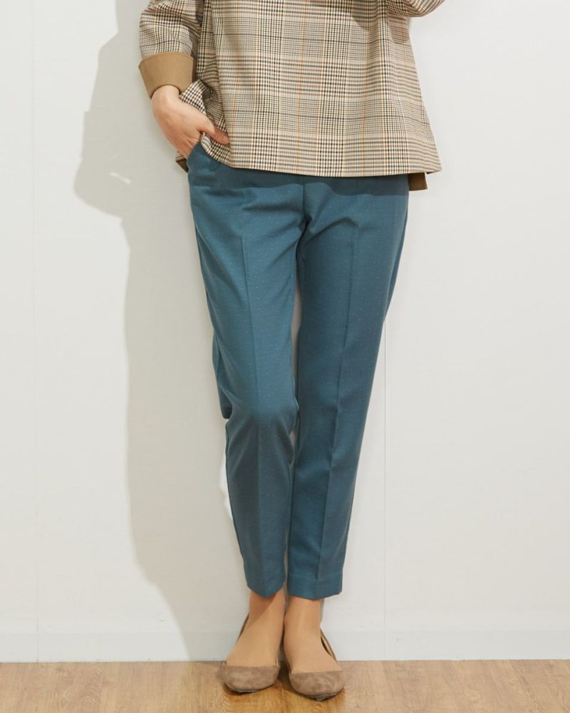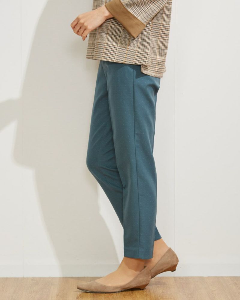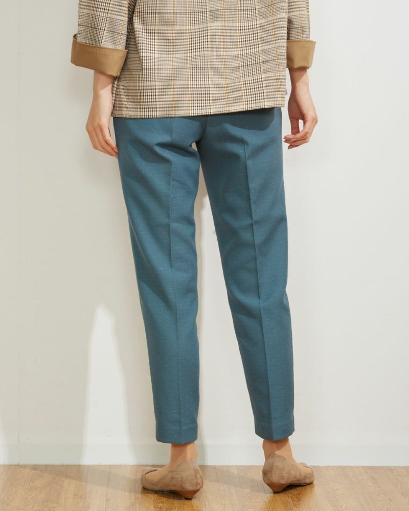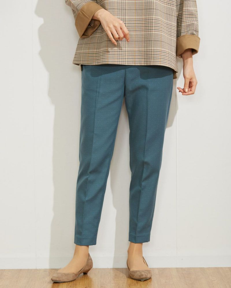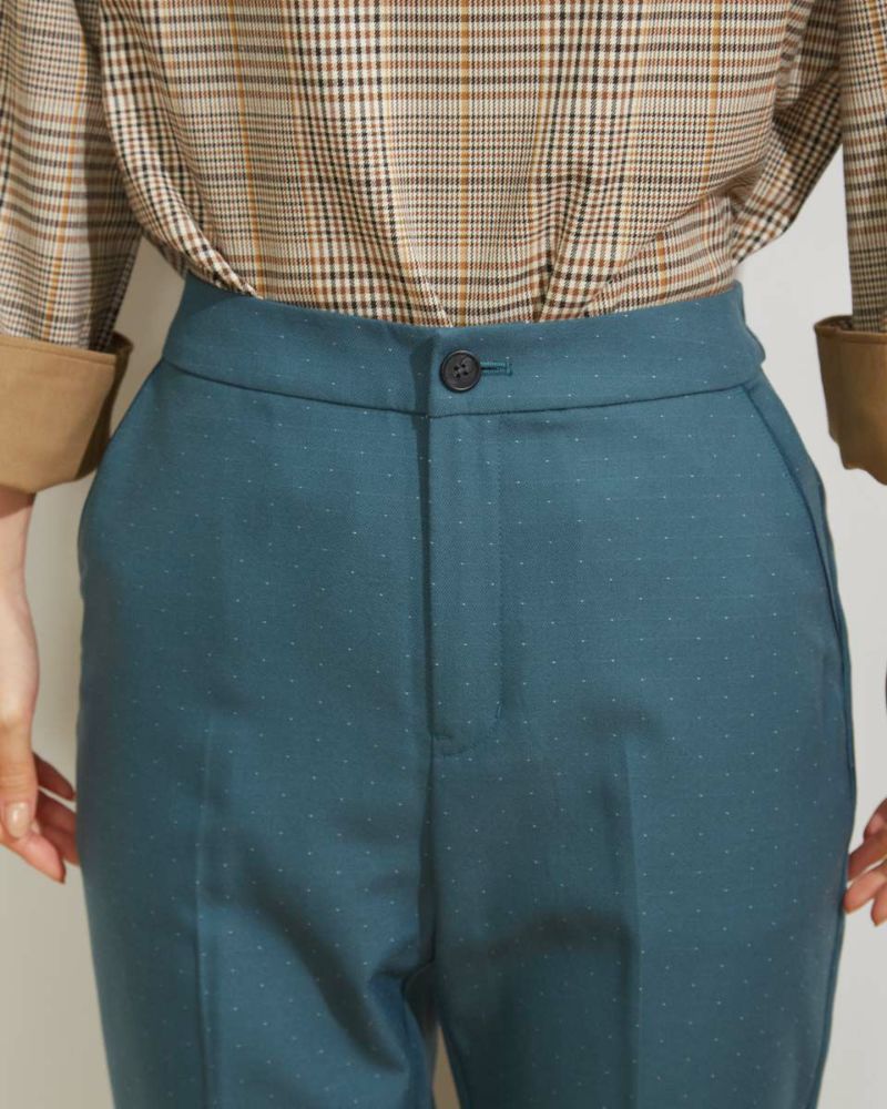 ほのかな張りコシと微光沢が活きたツイル目に、等しく点を打ったような柄を織り込んだドビー生地を使用。シンプルな柄構成は控え目ながら上品さが漂う1本。裾に向かって筒幅を少し狭くしたスティック調のパンツは、センタープレスやポケットのパイピングでより綺麗な印象に。オフィスの他、年末のお食事会など少しかしこまった場面での着用もおすすめ。パーカーや468HE660のニットでドレスダウンする着こなしも可愛いです。