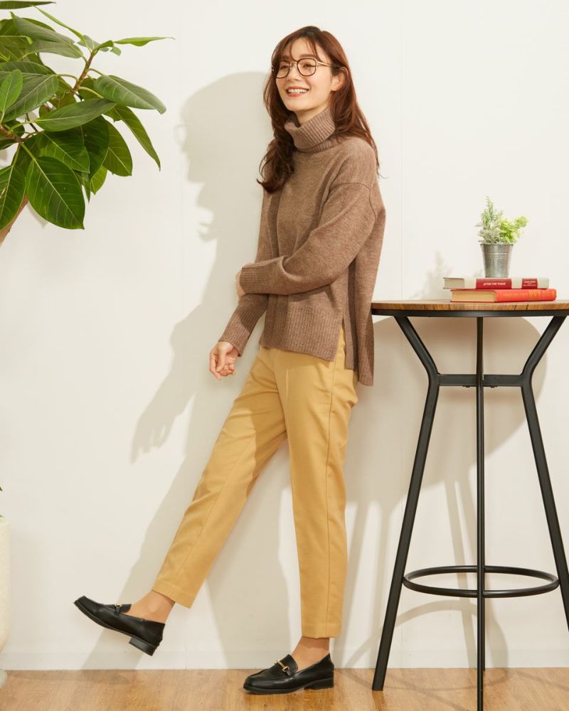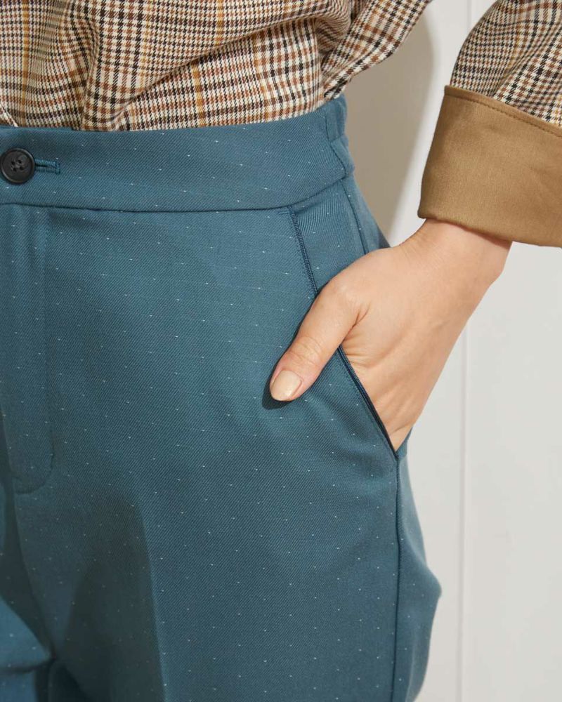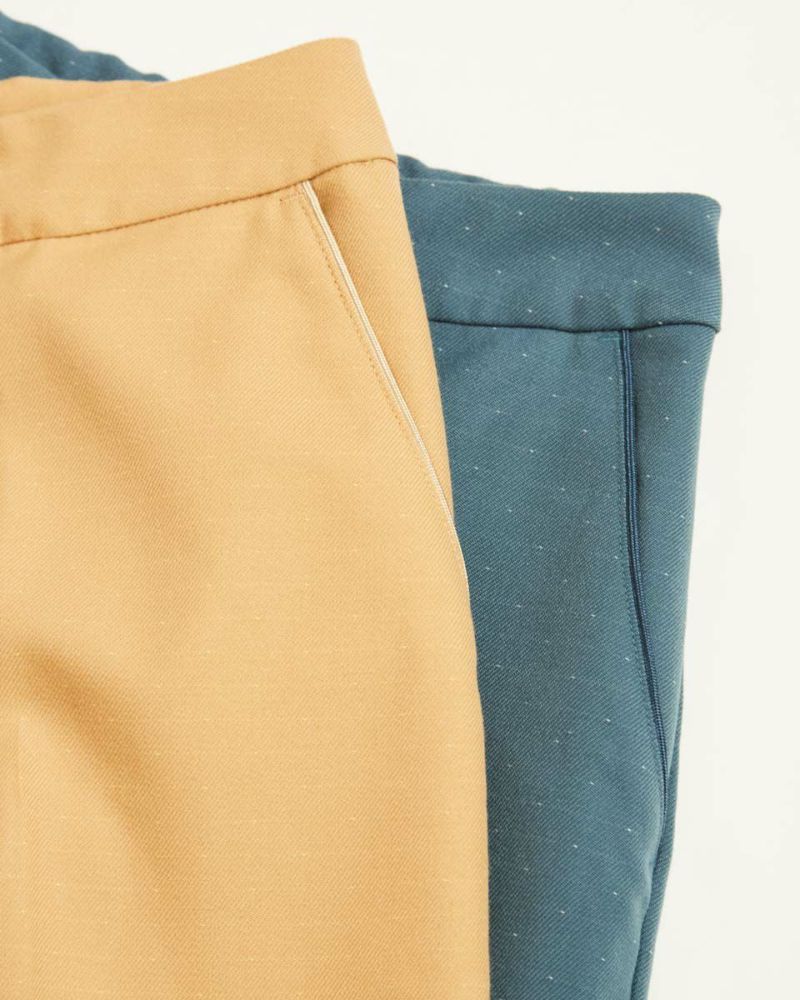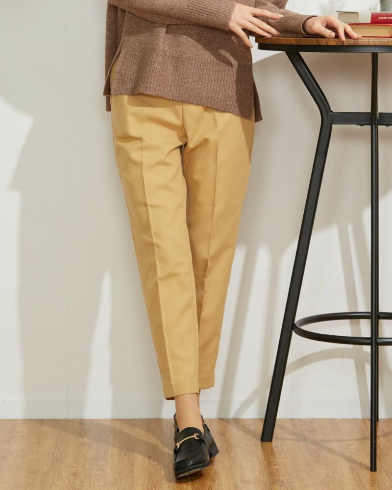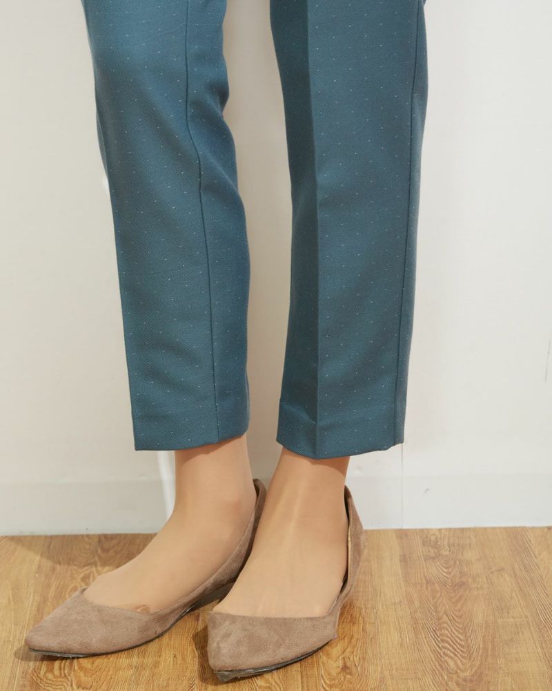 ほのかな張りコシと微光沢が活きたツイル目に、等しく点を打ったような柄を織り込んだドビー生地を使用。シンプルな柄構成は控え目ながら上品さが漂う1本。裾に向かって筒幅を少し狭くしたスティック調のパンツは、センタープレスやポケットのパイピングでより綺麗な印象に。オフィスの他、年末のお食事会など少しかしこまった場面での着用もおすすめ。パーカーや468HE660のニットでドレスダウンする着こなしも可愛いです。