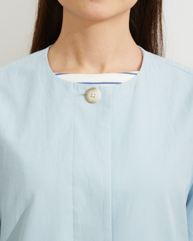ほのかな艶とコシのある綿ナイロンを使った春コート。裏地も付いているためインナーを着込んでも着脱しやすく、新生活の始まる4月頃までしっかりと活躍してくれる1着。小さめの襟ぐりとタックで膨らむ袖口が可愛らしく、裾に向かって幅を出したAラインのシルエットやベルト先に付けたメタルのコードエンドでよりフェミニンな印象に仕上げています。ノーカラーのためフードやオフタートルなど襟にボリュームのあるアイテムと合わせやすく、トレンドのボウタイブラウスとのスタイリングもおすすめ。背中のヨークと膝丈がきちんと感を演出しオフィスシーンでもお召しいただけます。