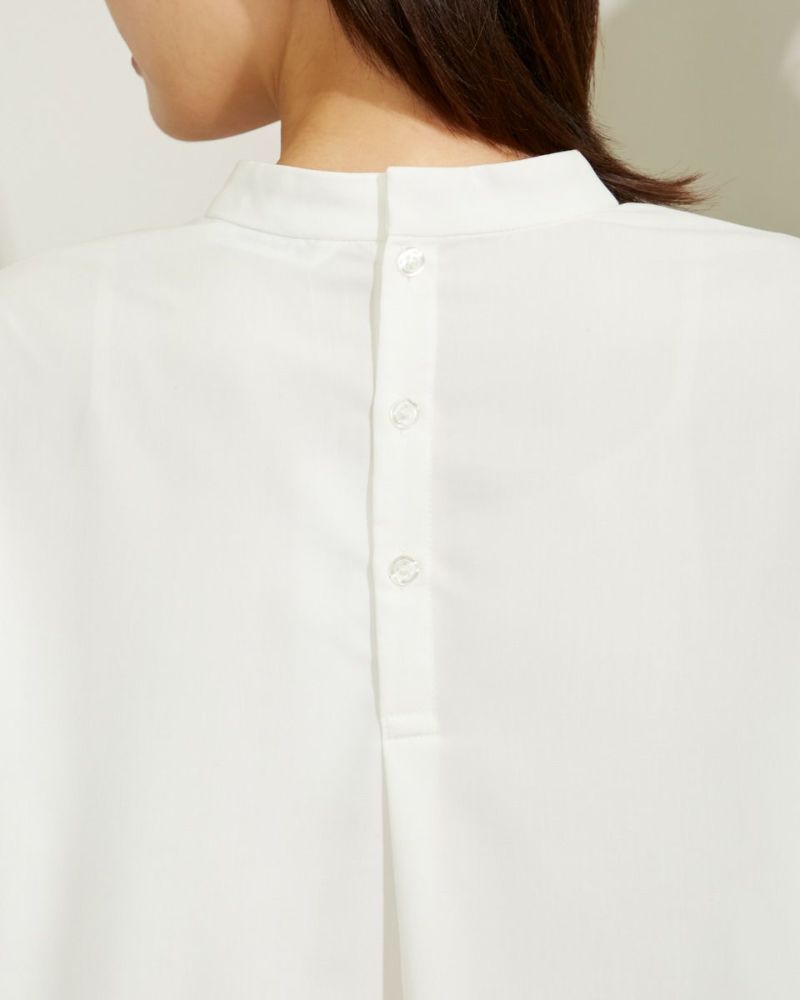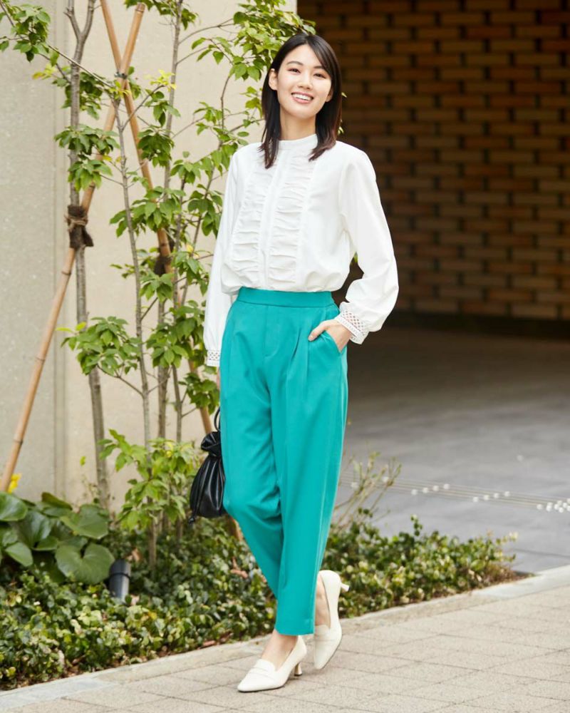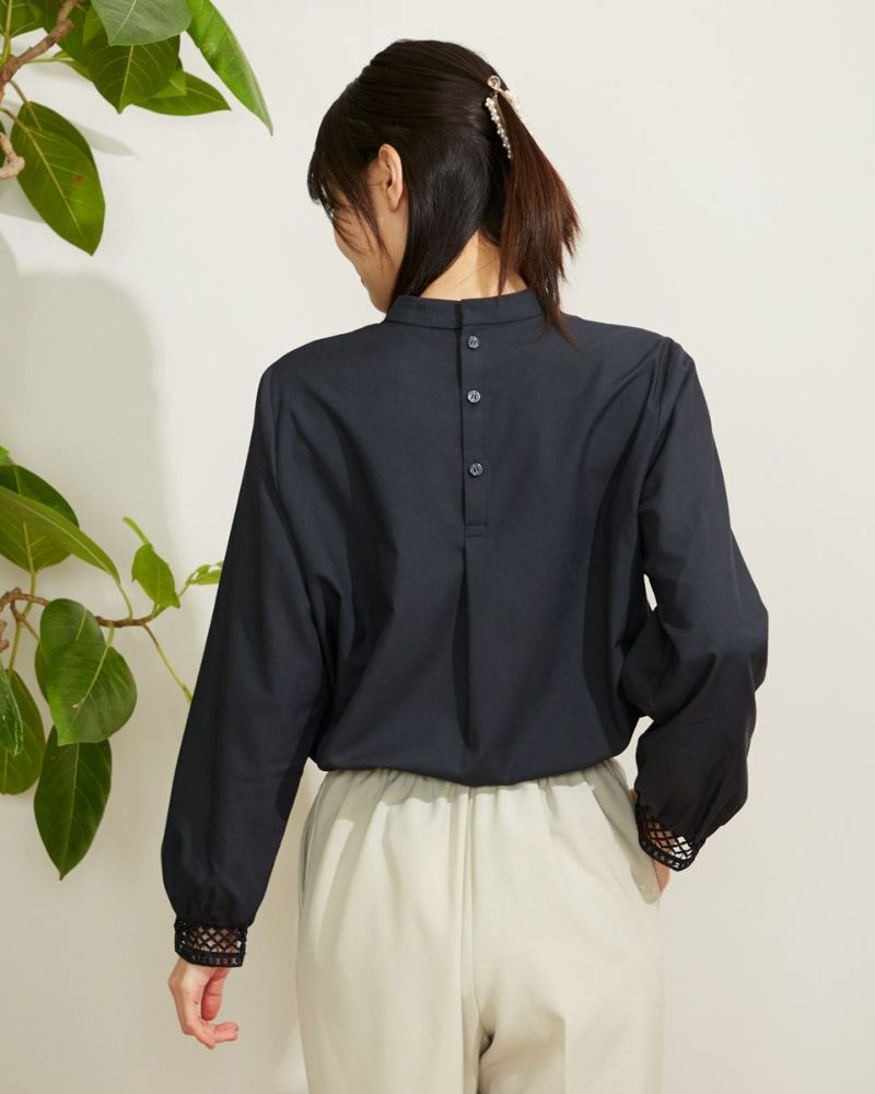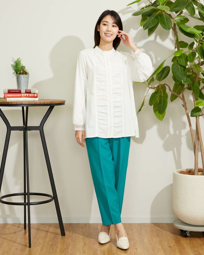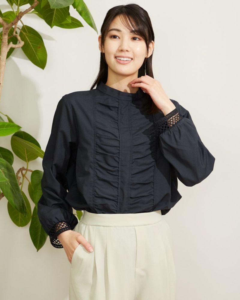 清潔感のある細かいツイル目はほのかに光沢も有り、しなやか。前身頃にキャザーをタテ方向に寄せたディティールが華やかでオフィスや習い事にお薦めのブラウス。5cmほどのレースを付けた袖口もフェミニンなポイントになっています。他のアイテムと合わせやすいカラー展開で、ジャンパースカートやジレとのコーディネートも素敵です。ブラウス自体に華やかさがあるためアクセサリー要らずでコーディネートも決まるため忙しい朝の身支度にも便利です。