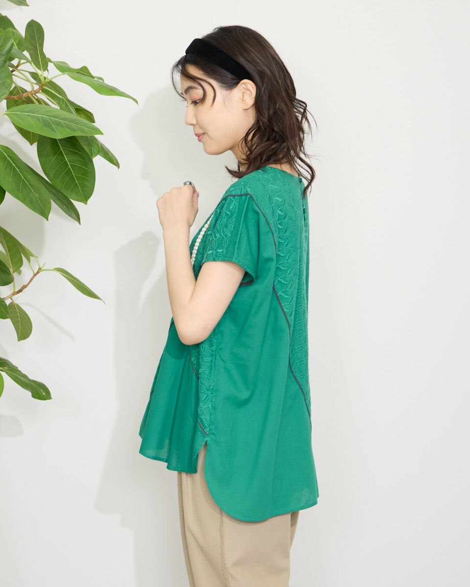生地表面の細やかな凹凸がナチュラルで優しいコットンの生地です。伸びやかなツルが印象的な草花を表現した刺しゅうを施し、無地とブロッキングしたデザインブラウスです。暑い日差しに負けない黒と強いグリーンのボディは、晩夏まで使えメタルやビーズのアクセサリーと好相性。ボトムスを変化させオン・オフでお召しいただけます。 モデル身長: 166 cm 着用サイズ: M サイズ Golden Bear White Label (WOMEN) ブラウス (WOMEN) 【着用アイテム】468QA751 イージーパンツ 468QB751 ベイカー風イージーパンツ