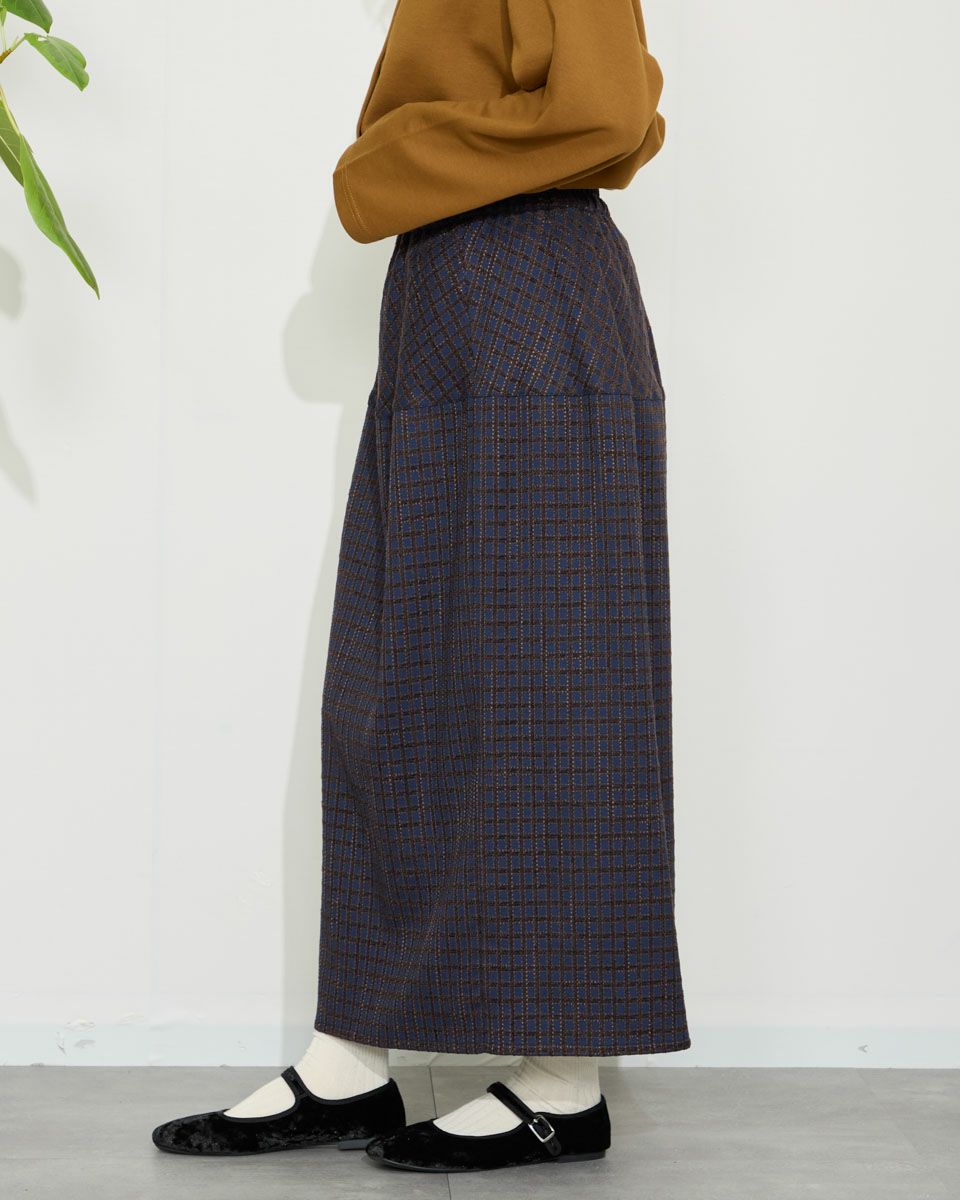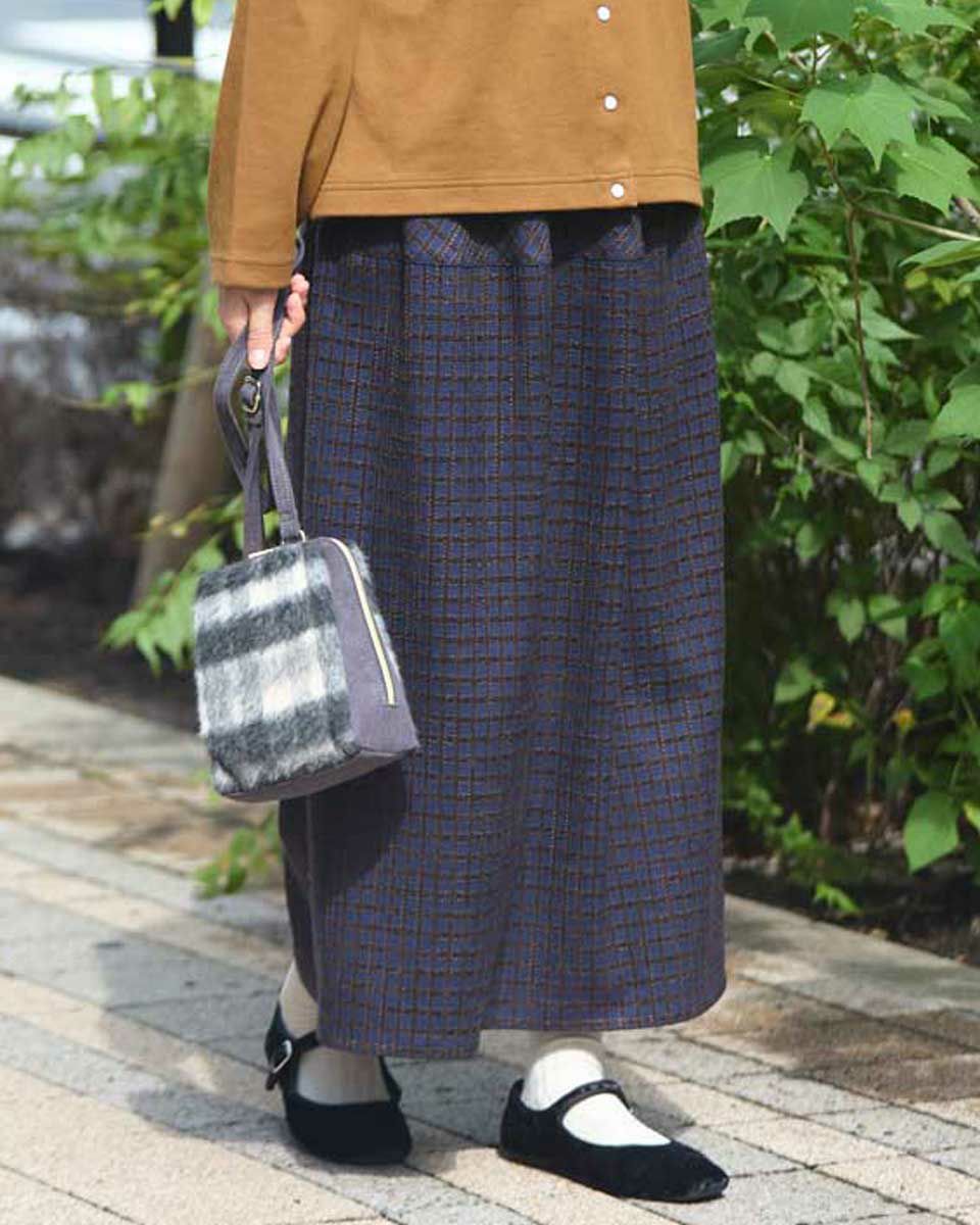 丸みを帯びたシルエットが裾に向かってすぼまっていくバルーン型のスカート。格子柄で可愛さのある生地ですがミモレ丈で足を隠した姿が聡明な品の良さも感じる1着になっています。着脱に便利な総ゴム仕立て。裏地が付いているのでタイツとの摩擦も無くお召しいただけます。8mmほどの格子部分にはプクプクとした凹凸が可愛いモール糸を使っているため温かみも感じ表情豊かな風合いが魅力になっています。トップスはスウェットでカジュアルダウンすると可愛いです。パンプスやブーツとの相性も抜群です。 モデル身長: 166 cm 着用サイズ: M サイズ Golden Bear White Label (WOMEN) ボトムス (WOMEN) 【着用アイテム】467QC402 ロゴTシャツ 467QC430 カット羽織り 467QD434 スタジアムジャンパー 468QD751 スカート 467QC002 ショルダーバッグ
