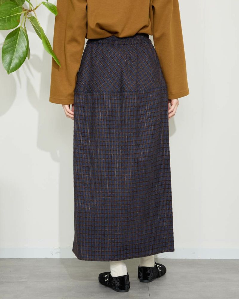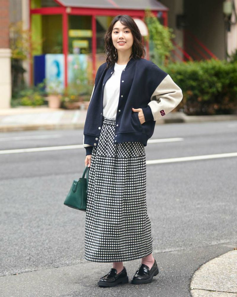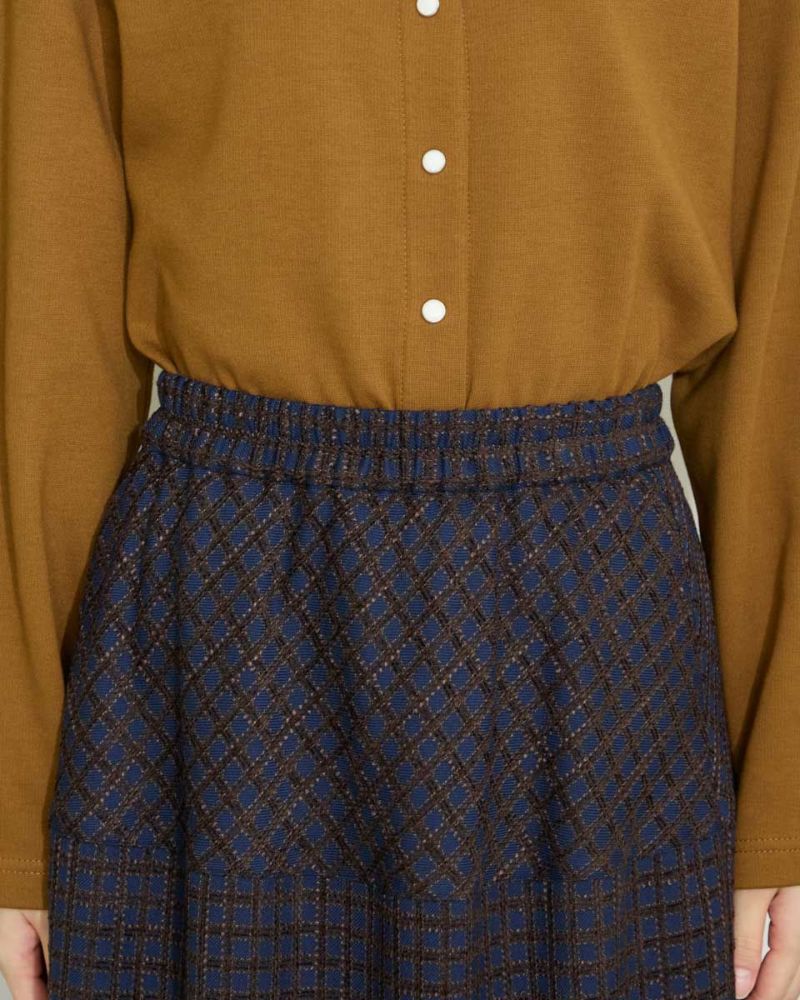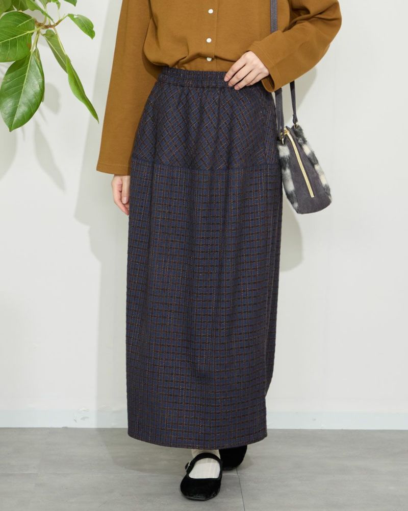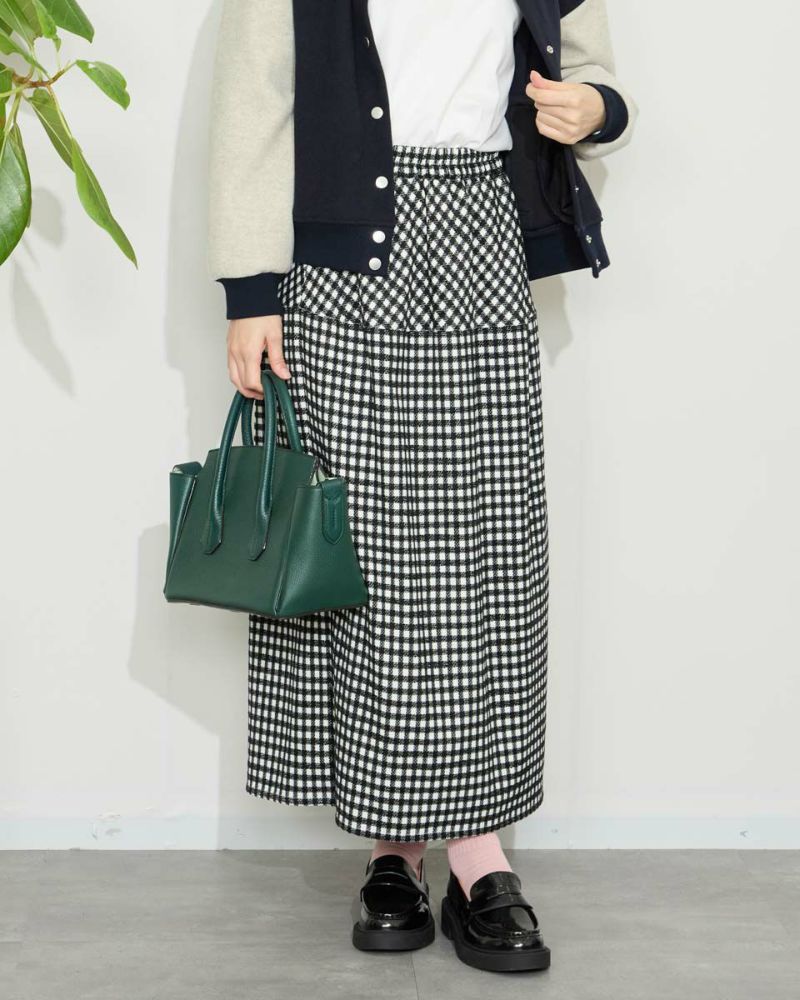 丸みを帯びたシルエットが裾に向かってすぼまっていくバルーン型のスカート。格子柄で可愛さのある生地ですがミモレ丈で足を隠した姿が聡明な品の良さも感じる1着になっています。着脱に便利な総ゴム仕立て。裏地が付いているのでタイツとの摩擦も無くお召しいただけます。8mmほどの格子部分にはプクプクとした凹凸が可愛いモール糸を使っているため温かみも感じ表情豊かな風合いが魅力になっています。トップスはスウェットでカジュアルダウンすると可愛いです。パンプスやブーツとの相性も抜群です。 モデル身長: 166 cm 着用サイズ: M サイズ Golden Bear White Label (Ladies') ボトムス (Ladies') 【着用アイテム】467QC402 ロゴTシャツ 467QC430 カット羽織り 467QD434 スタジアムジャンパー 468QD751 スカート 467QC002 ショルダーバッグ