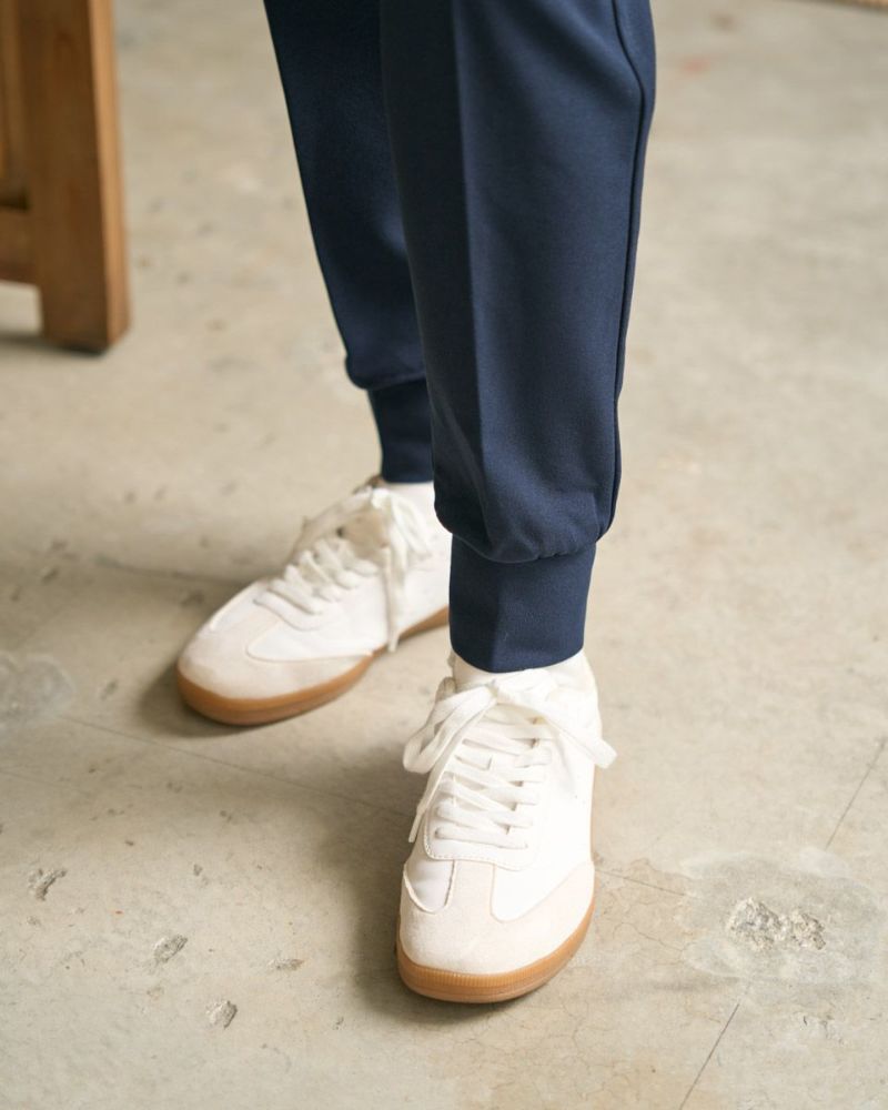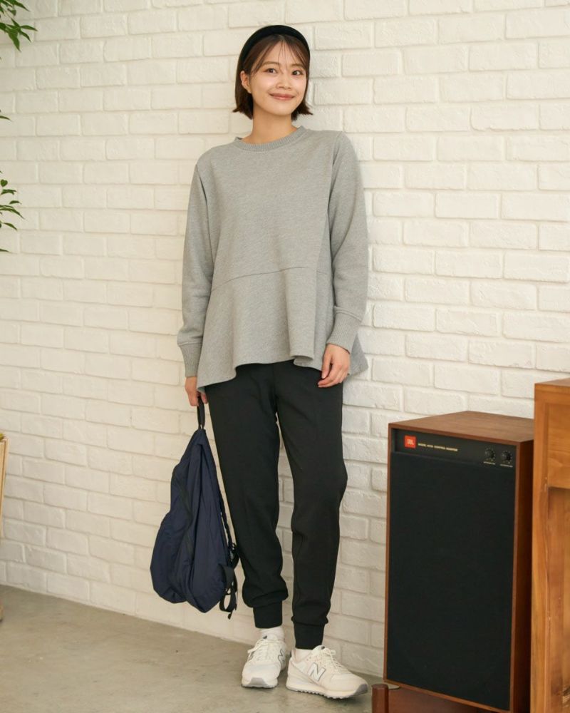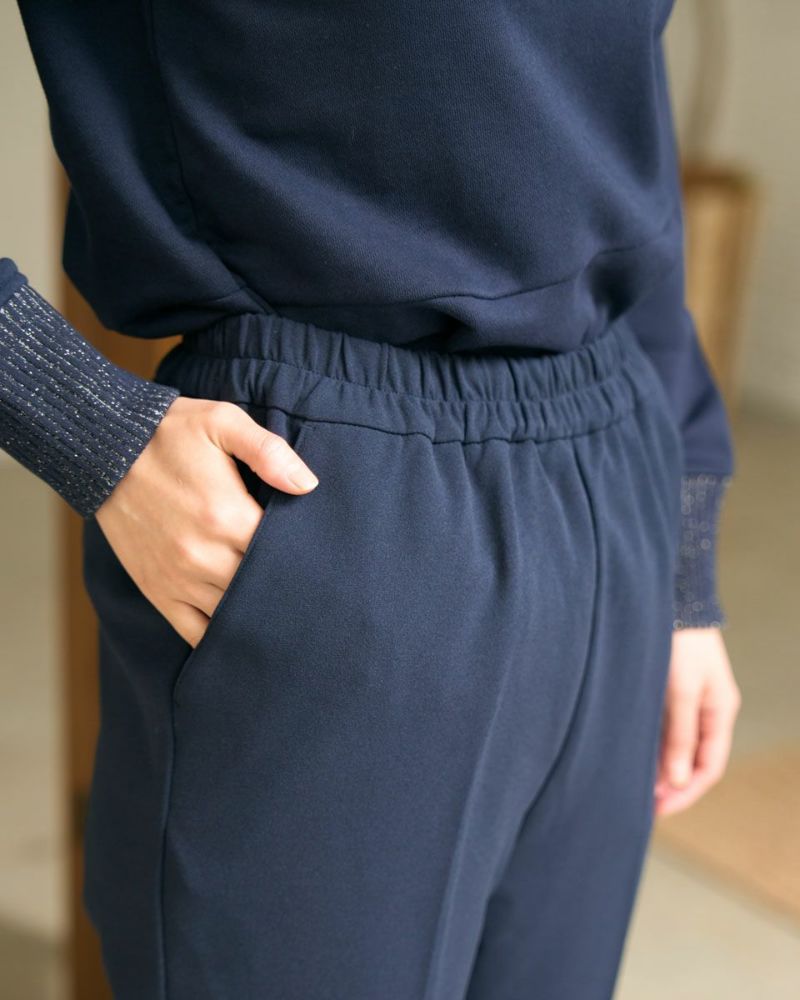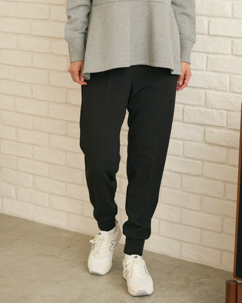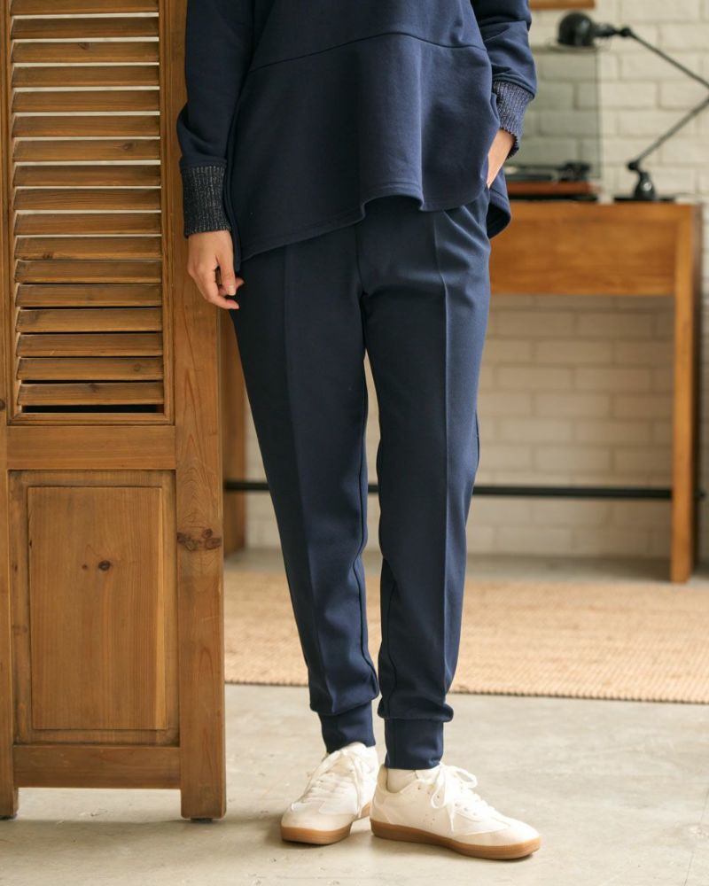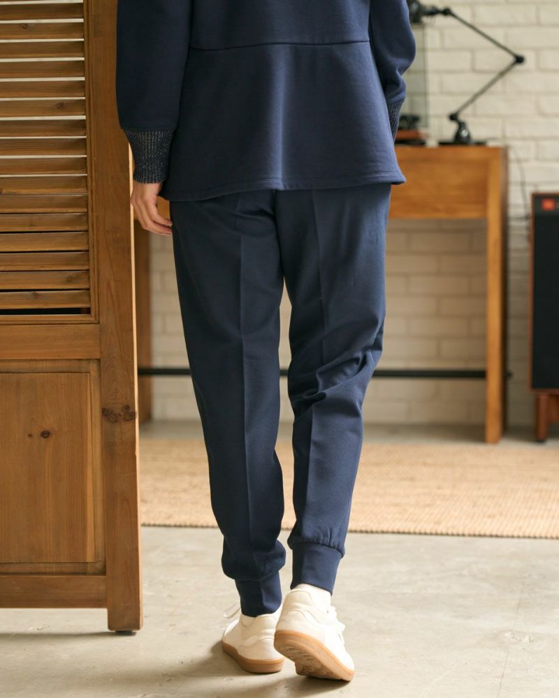 生地表面に細かいシボがあり上品なカットソージョーゼットをセレクト。裏面に薄く起毛をかいているため肌当たりもソフトで気温の下がる季節におすすめ。裾を切り替え絞ったシルエットのジョガーパンツでウエストは着脱が便利なゴム仕様。センタープレスの加工で砕け過ぎず綺麗めにお召しいただけます。同素材の468QD361ブラウスとのセットアップはもちろん、ジャケットからローゲージニットまでトップスを選ばない万能パンツです。スニーカーの他、レザーのパンプスやブーツとの相性もよくオフィスや送迎での着用に使えて便利です。