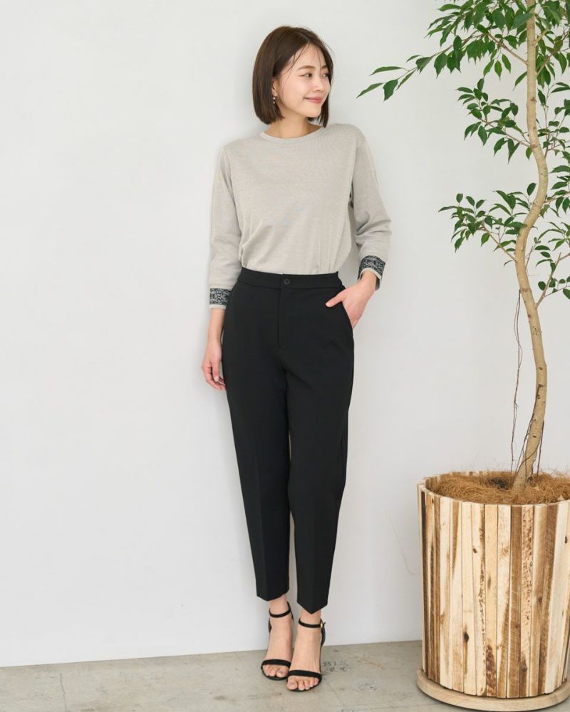 ヨコ方向のテンションに優れた生地は着心地が良く、春夏のラインナップでもお馴染みの素材。細かくストライプに編んでいるため無地見えし他のアイテムとも相性抜群です。重ね着にも便利なセットインスリーブ仕立て。アンティークのレースをイメージした刺しゅうで飾った袖口が可愛らしく初夏まで1枚着をお楽しみいただけます。甘さを抑えたピンクカラーは顔映りを明るくし大人世代におすすめの春カラーです。 モデル身長: 167 cm 着用サイズ: M サイズ Golden Bear White Label (Ladies') カットソー (Ladies') 【着用アイテム】468R2750 テーパードパンツ 468R3760 ストレートパンツ