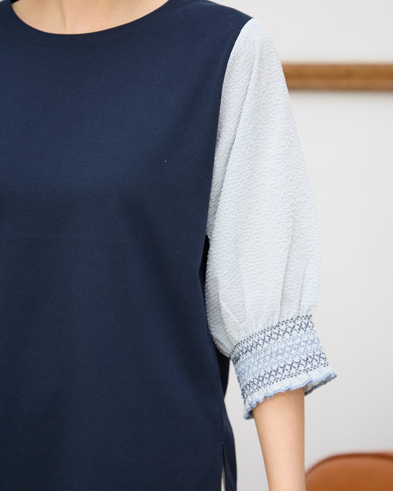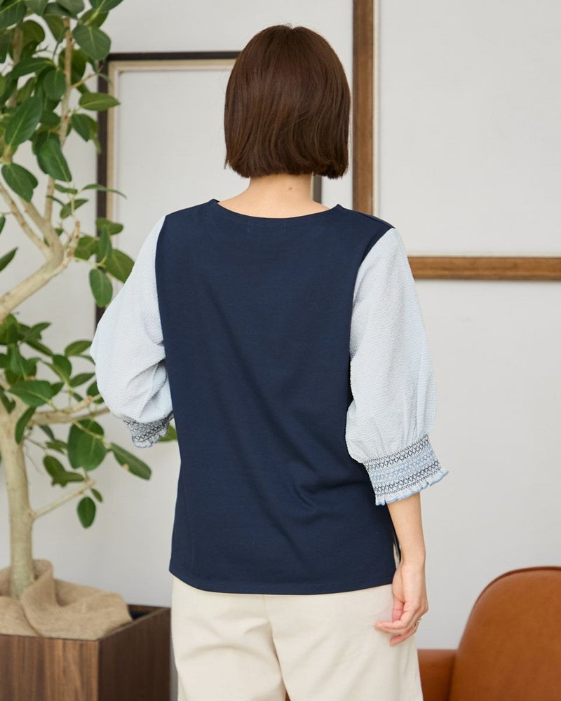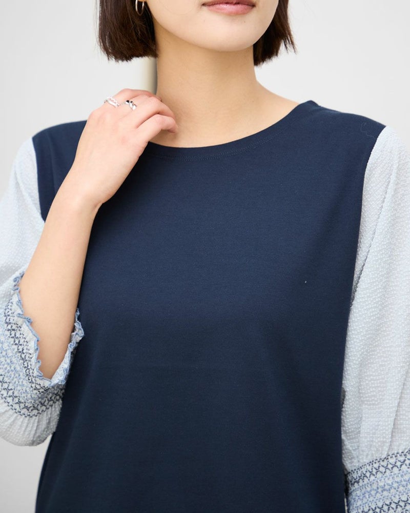 ベーシックな綿ポリエステルの天竺を身頃に用い、袖に布帛を使ったデザインカットソー。不均等に現れるゆらぎの表情も華やかさを演出。5cmほどの幅で袖口に施したシャーリングが手元をより美しく飾ります。カットソー単体のアイテムに比べ軽やかさや楽しさが纏えるのも異素材使いの良い所。ネックレスやブレスレットを添えてオン・オフで1枚着をお楽しみいただけるパワーアイテムです。