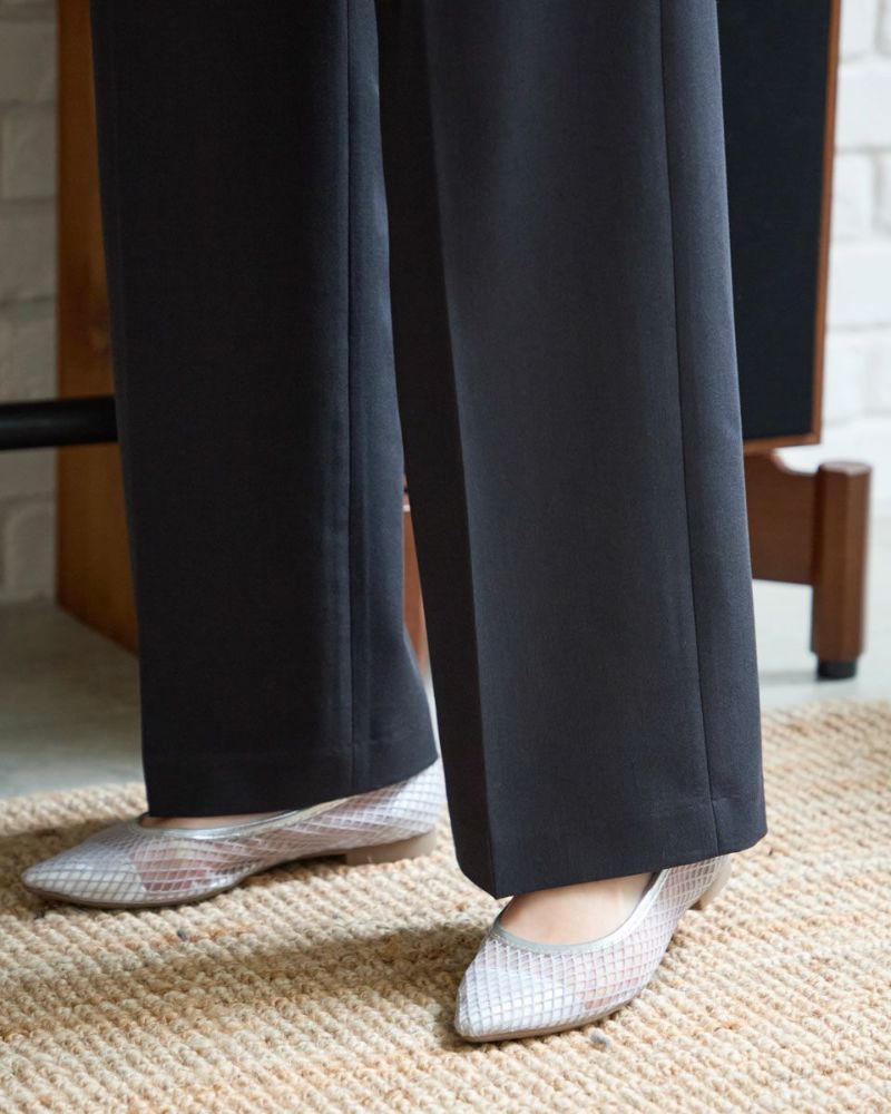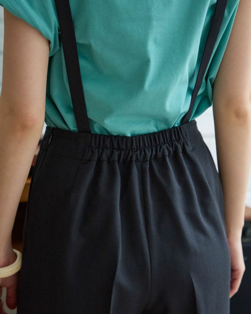 ほどよい弾力のある生地はダレず柔らかく裾が揺れ使い勝手も抜群。着脱自在のサスペンダーはウエスト裏の釦で調節が可能なため肩の食い込みを気にせずお召しいただけます。パンツ部分はストレートなシルエットとセンタープレスでハンサムな印象ですが左側のファスナーで着脱するためフェミニンな雰囲気もある1着。サスペンダーを下げたままTシャツやベストを着るスタイルも洒落感が増すのでお試しください。