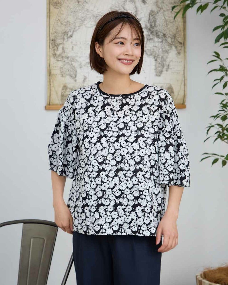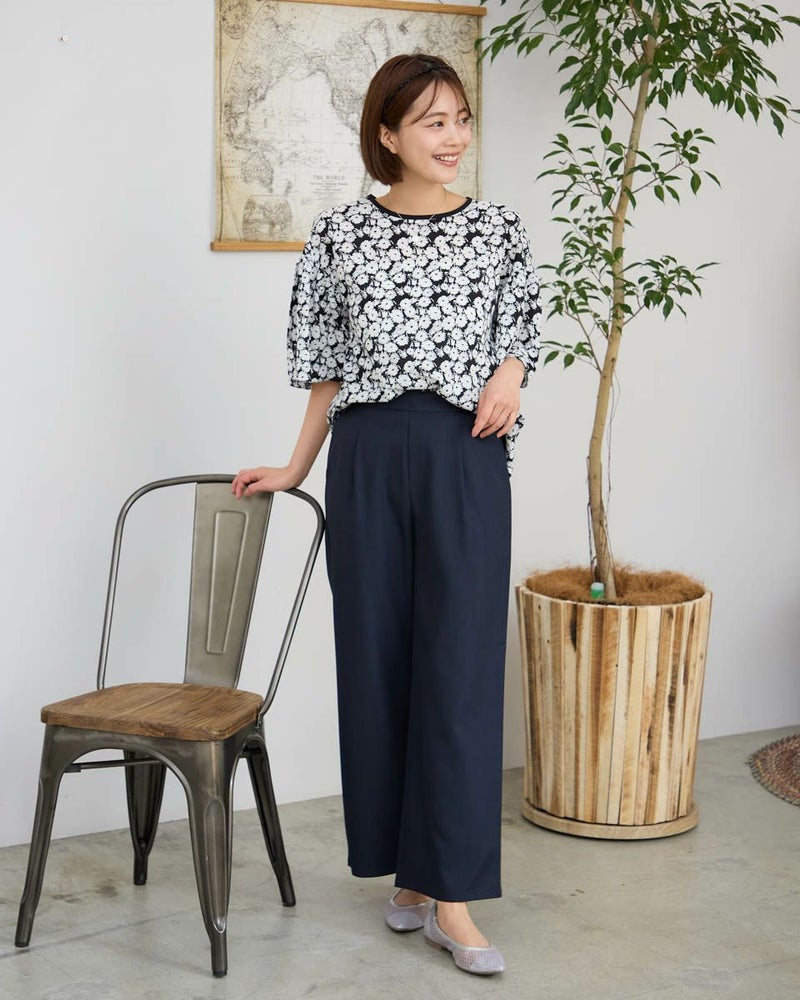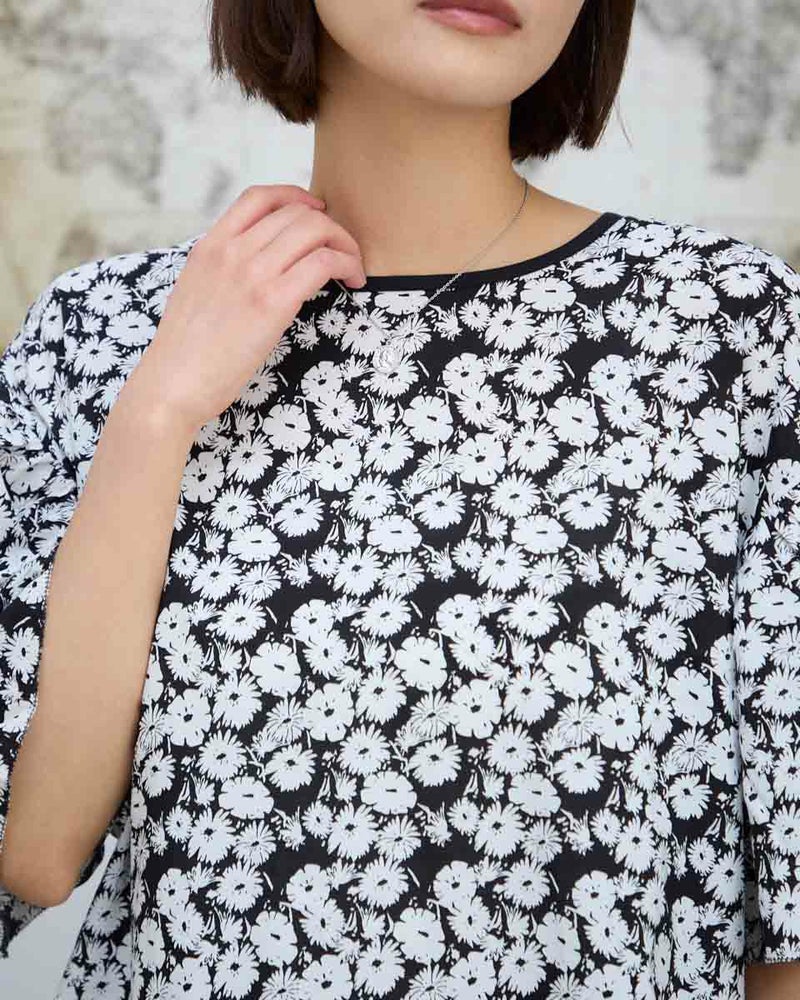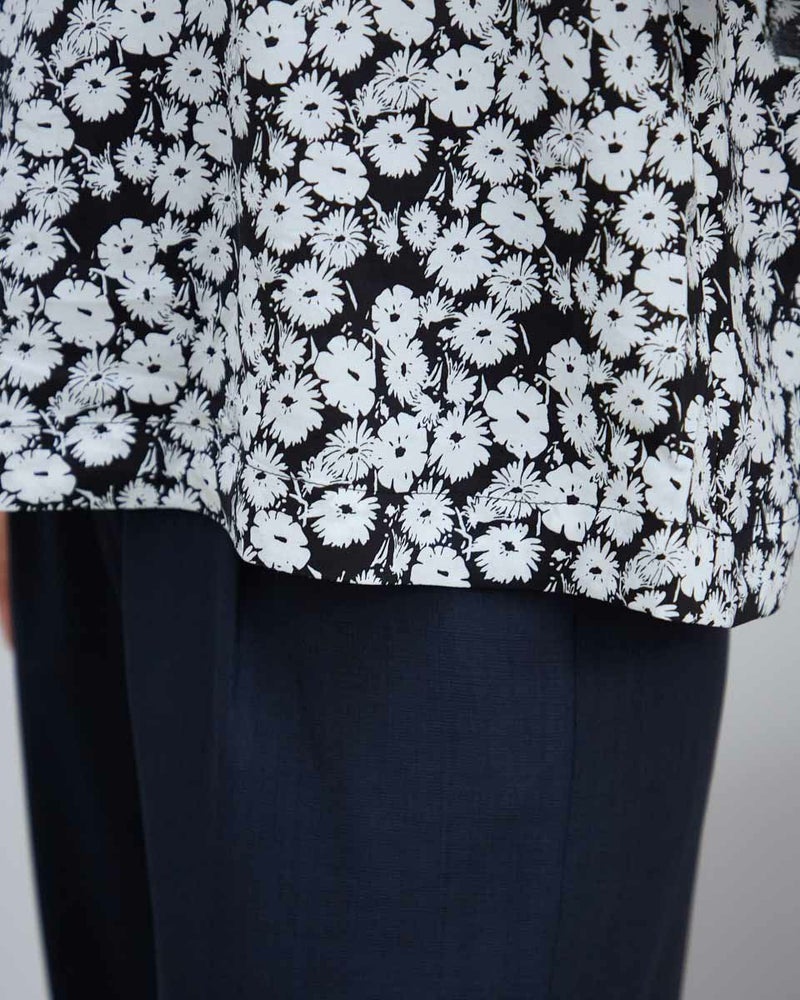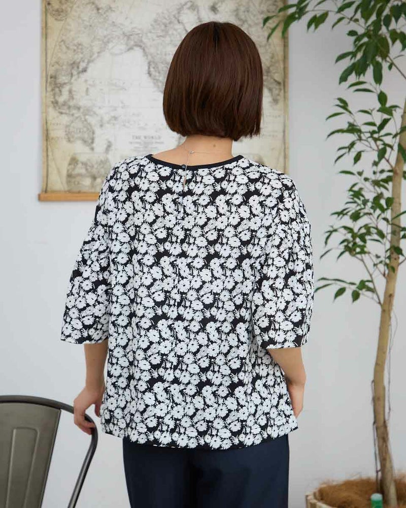 しなやかに落ちる平織りの綿レーヨン素材を使用。整った織り目から生まれる清潔感が魅力です。ボクシー型のシルエットと短めの着丈でボトムスを選ばない1着。ほどよいゆとりで風が通り抜ける様子も素敵なブラウスです。生地いっぱいに広がるのはマリーゴルドの花。鮮やかで力強く花壇に華やかさをもたらす様子から気品という花言葉が付けられました。より清楚に映るように色数を抑えて表現しています。 モデル身長: 167 cm 着用サイズ: M サイズ Golden Bear White Label (WOMEN) ブラウス (WOMEN) 【着用アイテム】467R5710 ガウチョパンツ 468R4750 ストレートパンツ 468R5750 ストレートタックパンツ