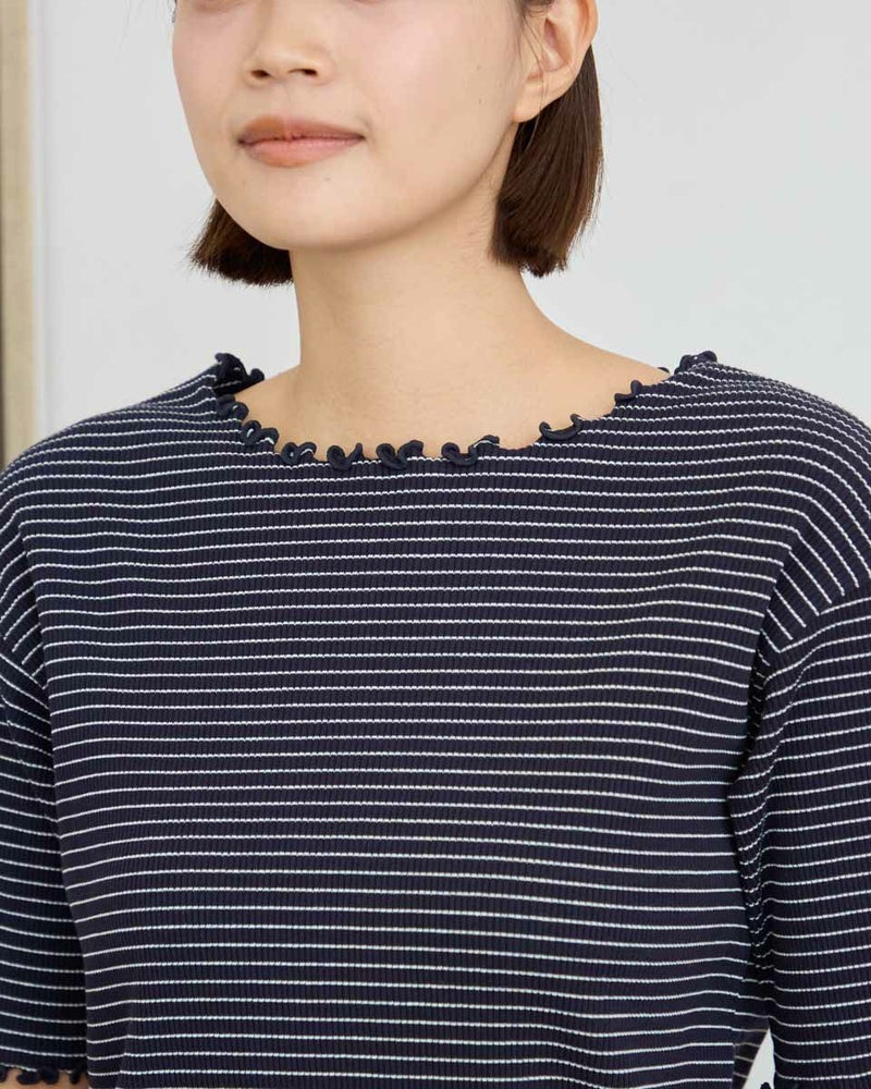 タテヨコ方向のテンションに優れたリブを使ったプルオーバー。ほどよい厚みと弾力があり身体に張り付きにくい素材を使用。細いラインをポイントにして編んだボーダーと襟や袖口に施したメロウの始末がフェミニンで下着感の薄れた、使い勝手の良いアイテムです。ジャケットやキャミワンピのインナー使いのほか、ボトムスを選ばないためオン・オフの両軸でお召しいただけます。