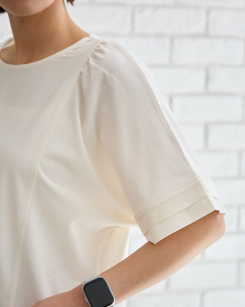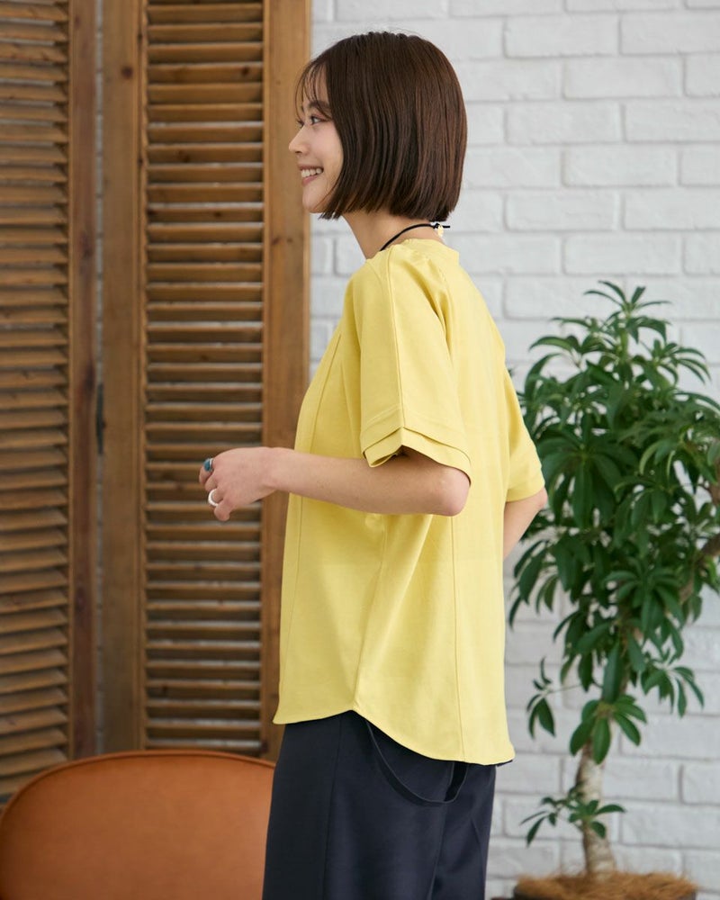 ほのかな光沢と整った編み地でキレイ見えする天竺を使用。綿ポリエステルでホームケアしやすく汗ばむ季節にも清潔を保ってお召しいただけます。アームホールに切り替えのないドルマンスリーブの設定で身体が服の中で泳ぐゆとり感に、こなれた雰囲気があり大人世代におすすめ。ボトムスを選ばず前の裾を少しタックインしてアクセントを付ける着方が可愛いです。シンプルなフロントにネックレスを添えてもGOOD。 モデル身長: 167 cm 着用サイズ: M サイズ Golden Bear White Label (WOMEN) カットソー (WOMEN) 【着用アイテム】467R4710 セミワイドパンツ 468R4760 サスペンダーパンツ