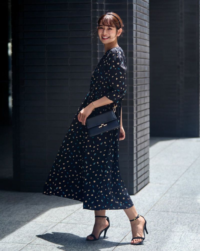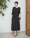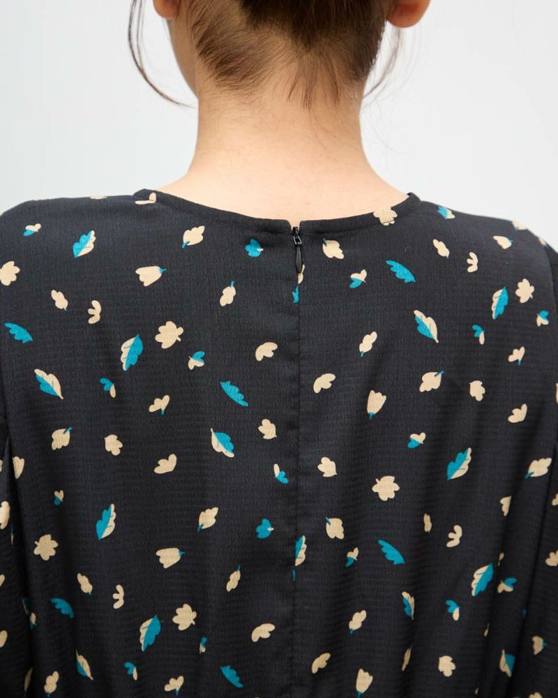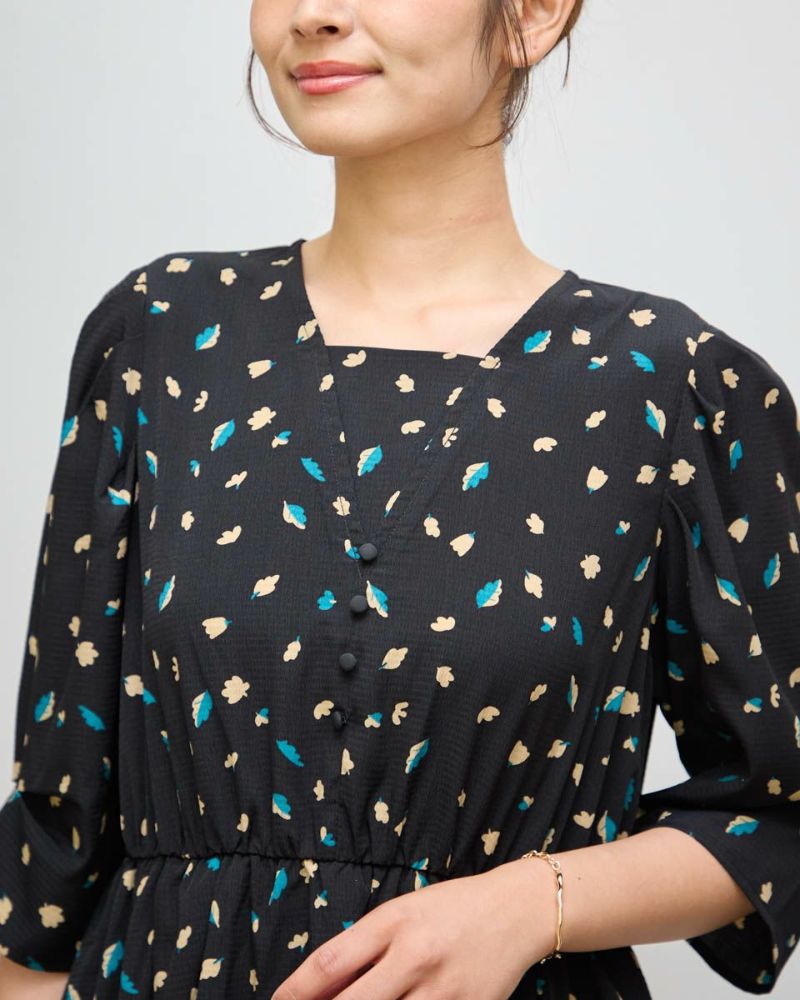 ラフなタッチの花や葉っぱのモチーフがアイキャッチになるワンピース。小さな波状の凹凸が並ぶポリエステルサッカーの生地をセレクト。肌との接触面が少なく清涼感に富みシワになりにくい点も魅力。チャーミングなポップさは残したまま、幼さを軽減するため配色にニュアンスカラーを用いています。湖のような深いブルーグリーンもムードがあり小物のカラーを選びません。袖山に加えたギャザーやフロントに並ぶ包み釦などディティールも華やかなアイテムなので、スキンジュエリーを添えた引き算の小物使いが品良く見え大人世代にはおすすめです。普段使いに便利なポケット付き。