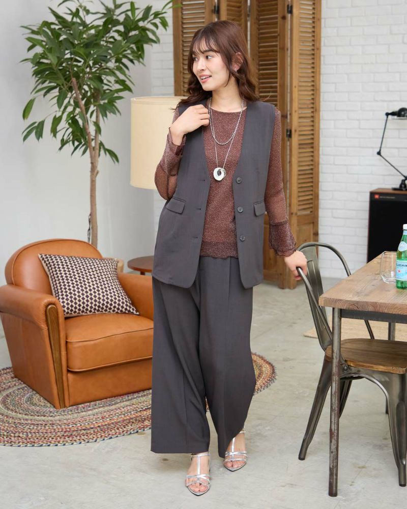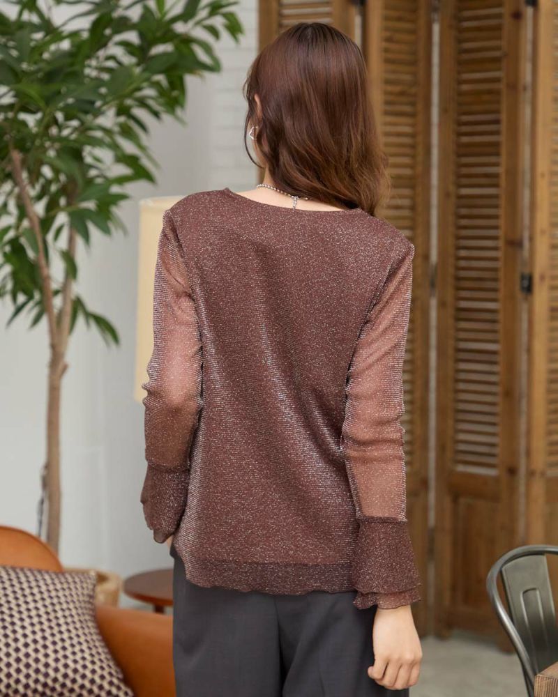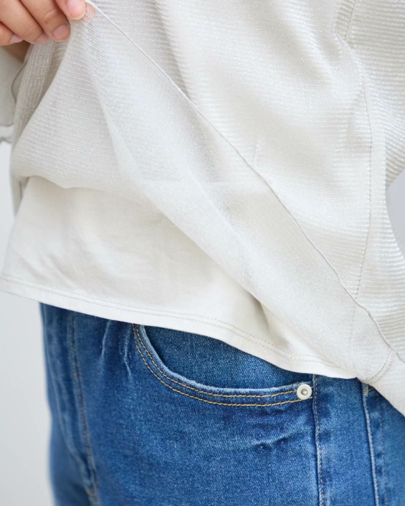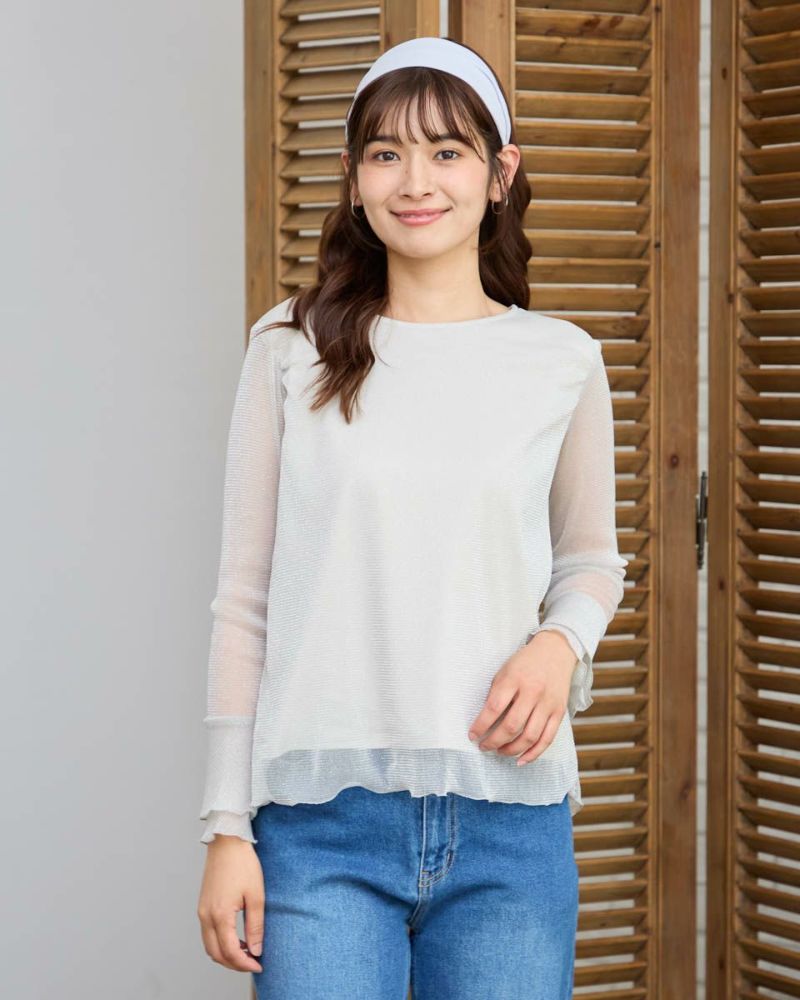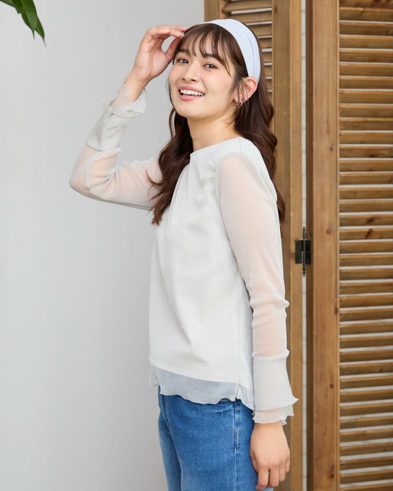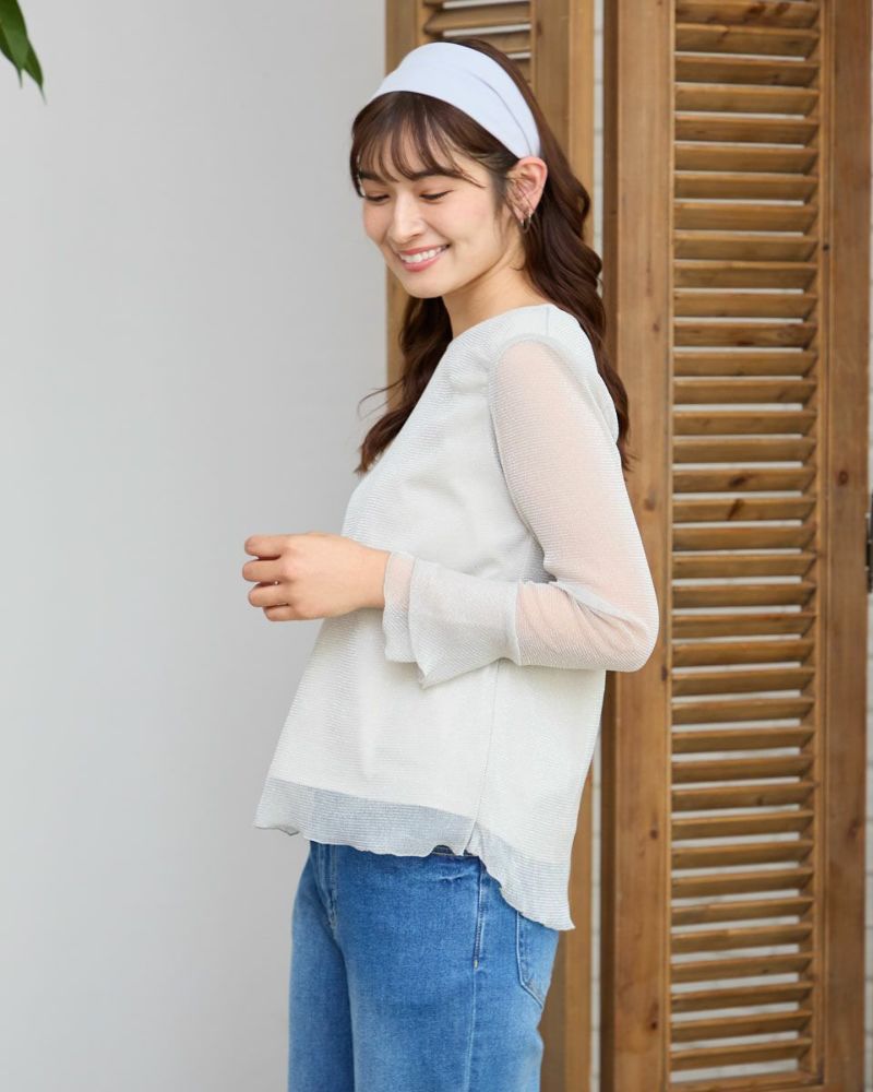 ドレスでお馴染みのチュールネットを使ったデザインカットソーです。小さな六角形の編み目が連続し編まれた素材はヨコ方向のテンションに優れソフトに身体を包みます。前後の身頃は天竺と2枚仕立てにして透けを遮断、インナーの透けを心配することなくお召しいただけます。袖はチュールの1枚仕立てですが一緒に編み込まれたシルバー糸の煌めきで肌の透け感、存在感が軽減されシアーアイテム初挑戦のお客様にもトライしやすい1着です。袖口のフレアが揺れ手先を綺麗に映します。ニュアンスのあるライトグレーはパーティー感がなく合わせやすい点もポイント。ジレを羽織ったり冬はスウェットを重ねても素敵です。