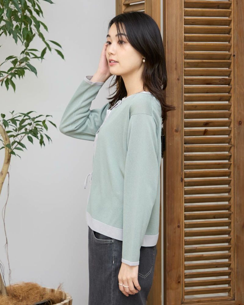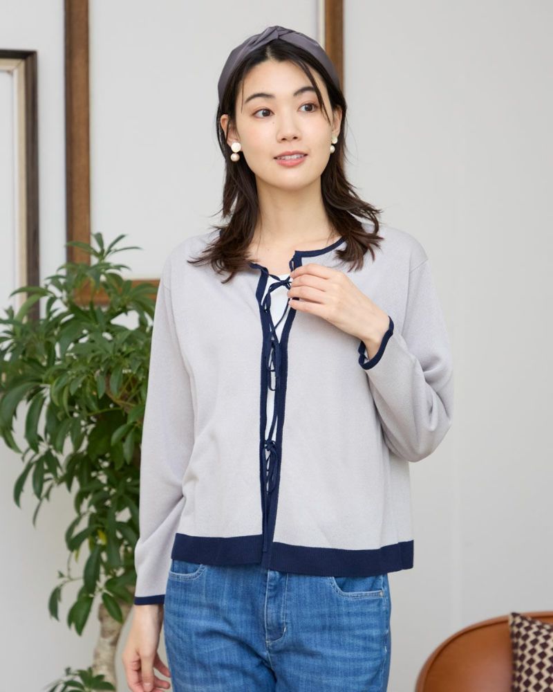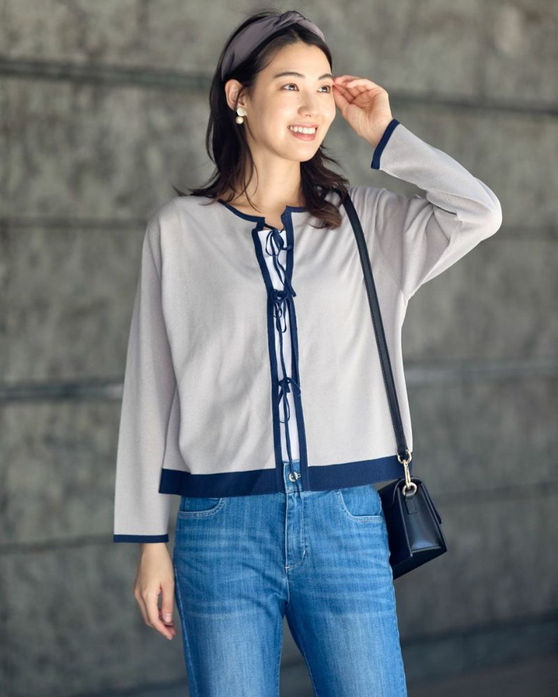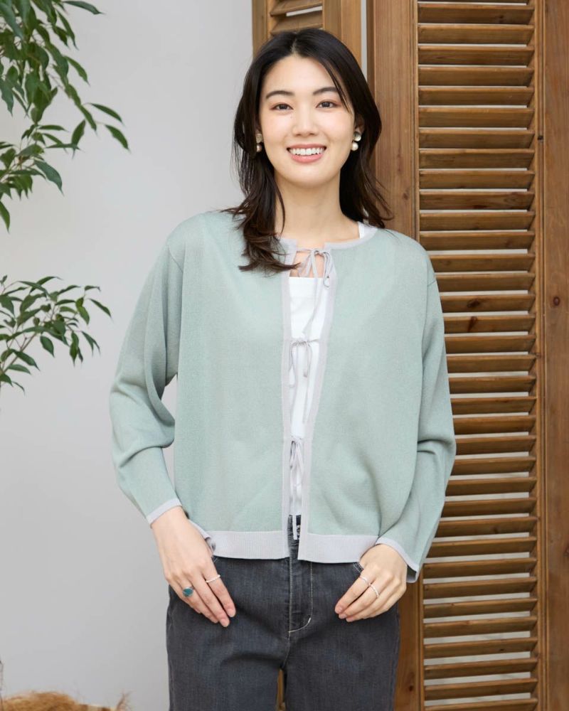 ほどよいシャリみとツヤ感があるハイゲージの編地はキレイめな表情が魅力。長袖に設定したカーディガンですが毛羽感も無いため熱がこもらずサラッと肌当たりも涼やか。配色のトリミングとフロントのリボン使いがアイキャッチになる1着。セットインスリーブできちんとした印象もあるためオフィスや学校行事での着用もおすすめ。フロントのリボンは結んでポイントにしたり垂らしたままラフさを演出してもOK。フェミニンなアイテムなのでデニムと合わせたミックスコーディネートやカーディガンを主役にワンピースに羽織るスタイルも素敵です。ニュアンスのある落ち着いた配色は秋カラーとも馴染み10月頃までお召しいただけます。