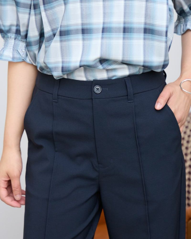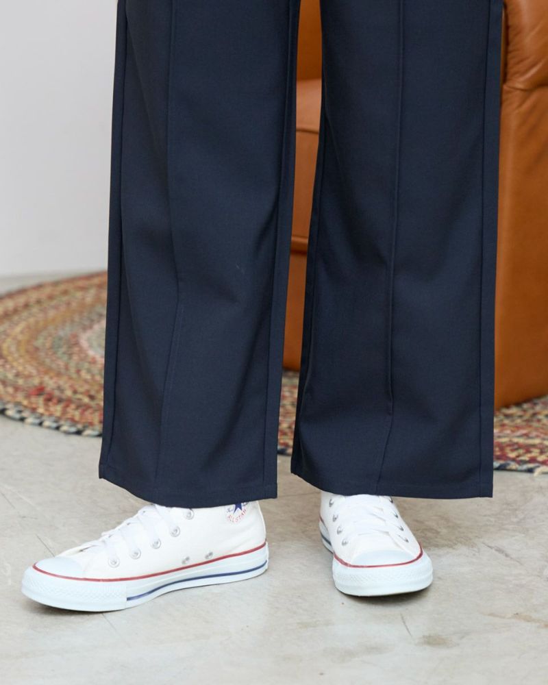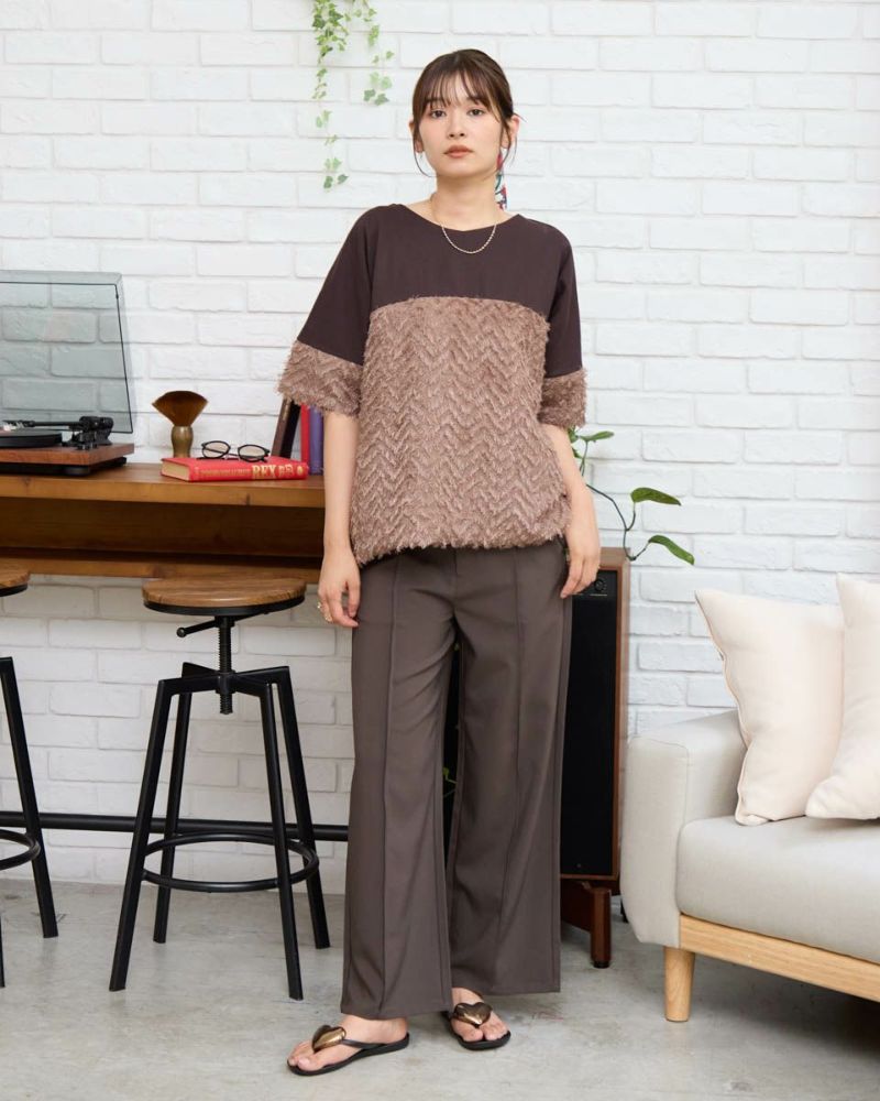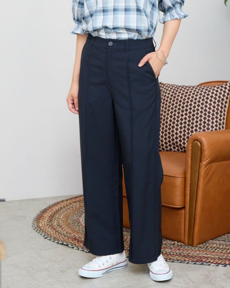 程よく弾力のあるダブルフェイス調の生地は身体の肉感を拾わずダレ感もないためはき心地もスッキリなストレートのシルエットです。ピンタック状にステッチをかけたセンタープレスの効果で足が真っすっぐに映る点も嬉しいポイント。ほのかに光沢がありキレイ見えするためオフィス使いにもおすすめ。フロントZIPやベルトループを施したハンサムなディティールですがフェミニンなトップスや短丈アイテムとも相性がよく、今期ならベルトを使いウエストにポイントを置いた着こなしも素敵です。トレンドのブラウンカラーは洒落て見える同系色のトップス(ボルドーやコゲチャ)合わせがおすすめです。