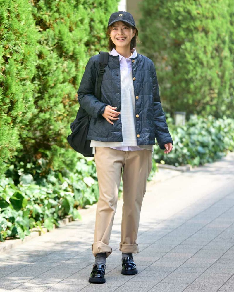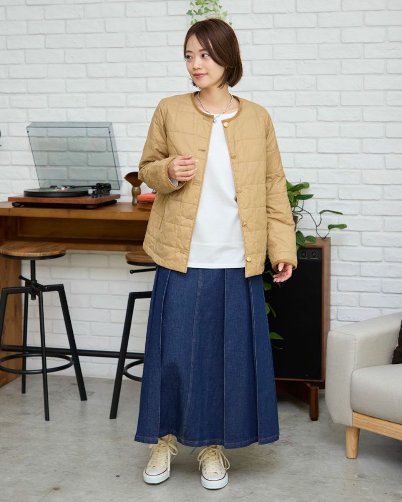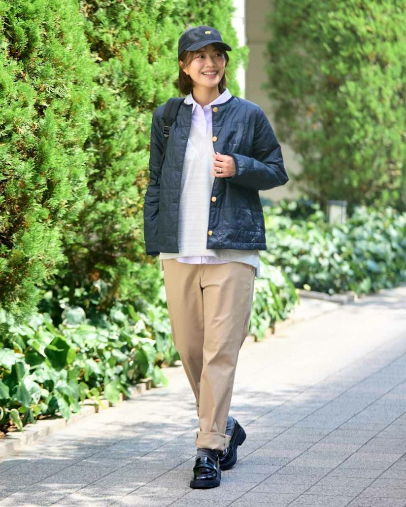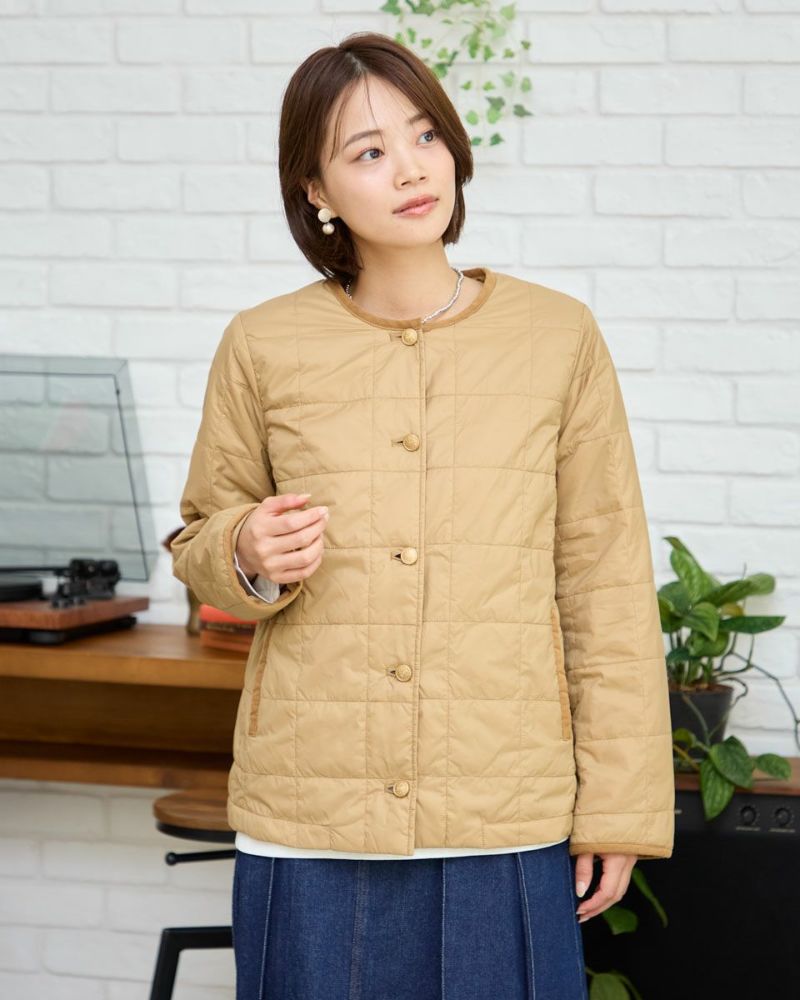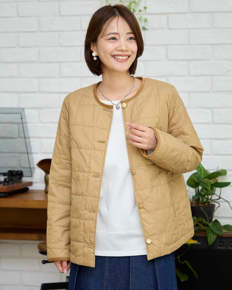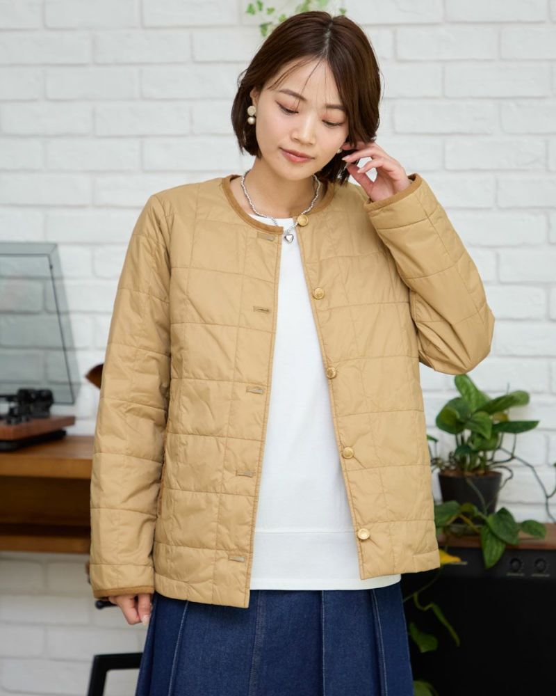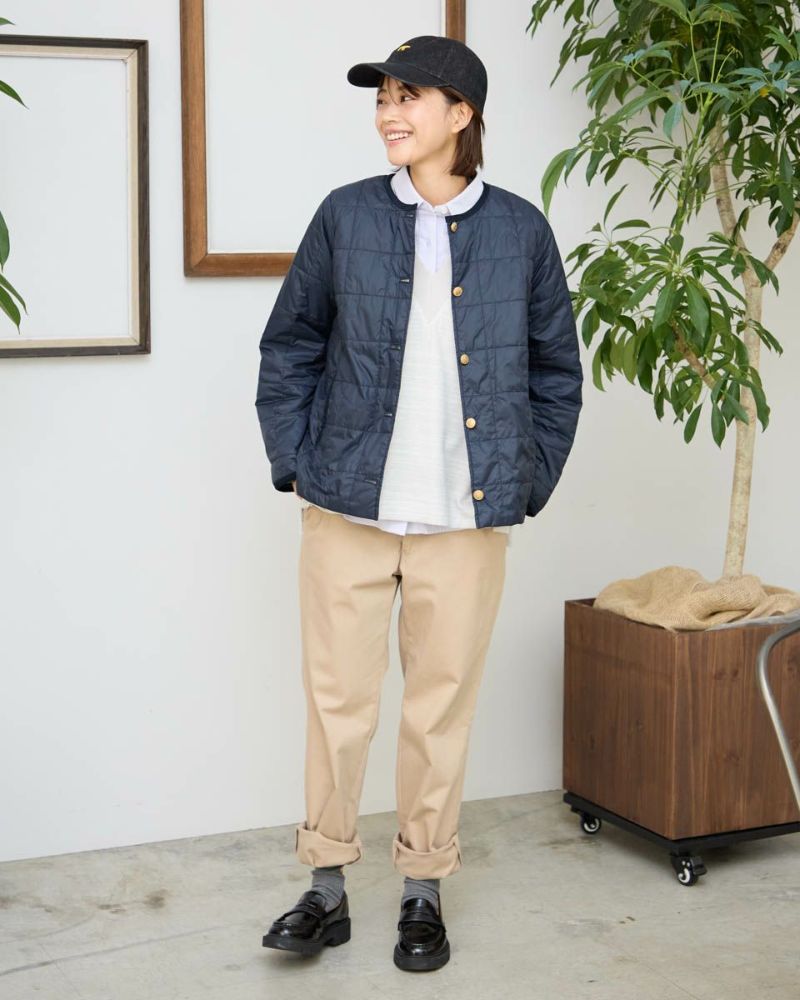 8㎝ほどのスクエア型にキルティングを施した生地は、ほのかな光沢が親しみやすいナイロン混の素材をセレクト。高密度で織られキメが整っているため砕け過ぎず、きちんと感を保ってお召しいただけます。暖冬を考慮し中綿は薄く40gに設定。着丈も腰骨ほどでコンパクトなシルエットと軽さを活かしスイッチシーズンの羽織りやウールコートのインナー使いもおすすめ。カジュアルなアイテムですがフロントにメタル釦を使い、より洗練された雰囲気に仕上げています。スラックスやハイゲージのニットとも相性が良く通勤や学校行事での着用も素敵です。