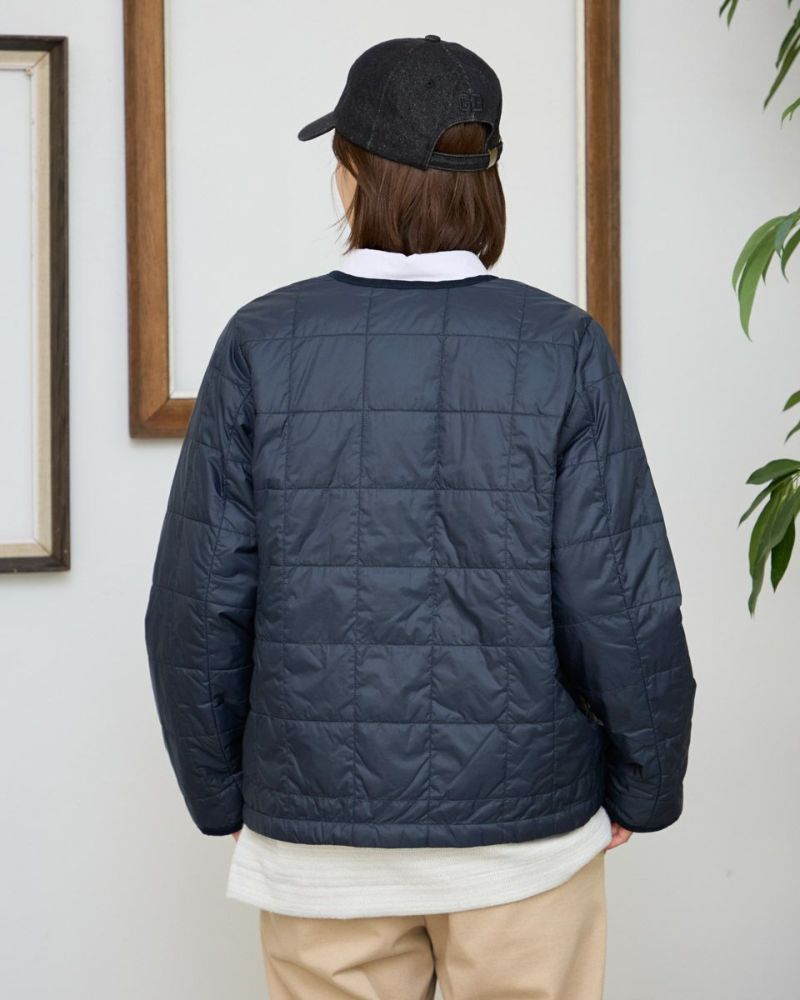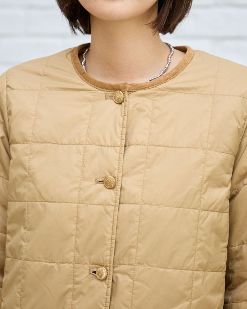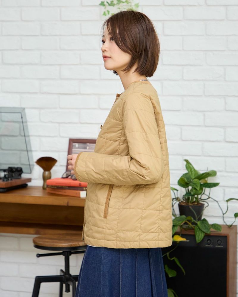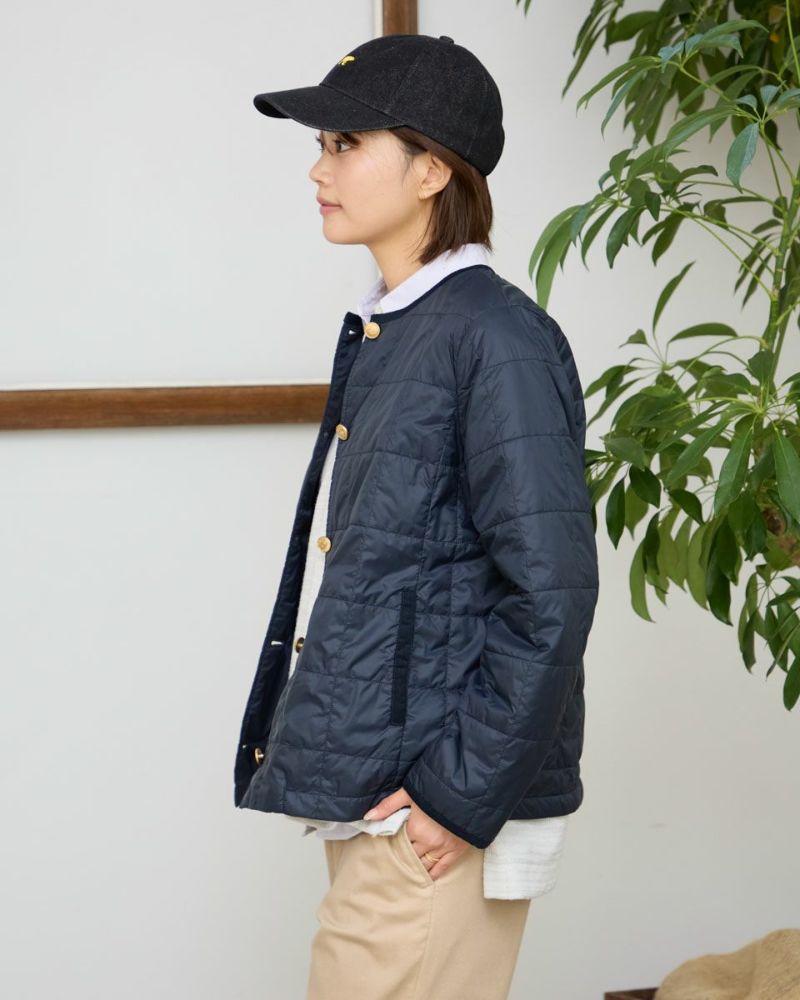 8㎝ほどのスクエア型にキルティングを施した生地は、ほのかな光沢が親しみやすいナイロン混の素材をセレクト。高密度で織られキメが整っているため砕け過ぎず、きちんと感を保ってお召しいただけます。暖冬を考慮し中綿は薄く40gに設定。着丈も腰骨ほどでコンパクトなシルエットと軽さを活かしスイッチシーズンの羽織りやウールコートのインナー使いもおすすめ。カジュアルなアイテムですがフロントにメタル釦を使い、より洗練された雰囲気に仕上げています。スラックスやハイゲージのニットとも相性が良く通勤や学校行事での着用も素敵です。
