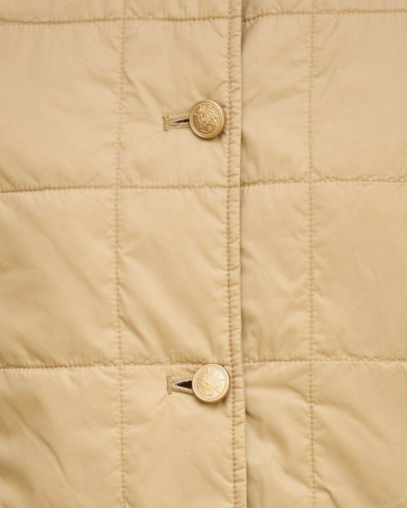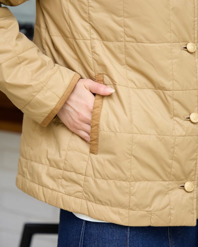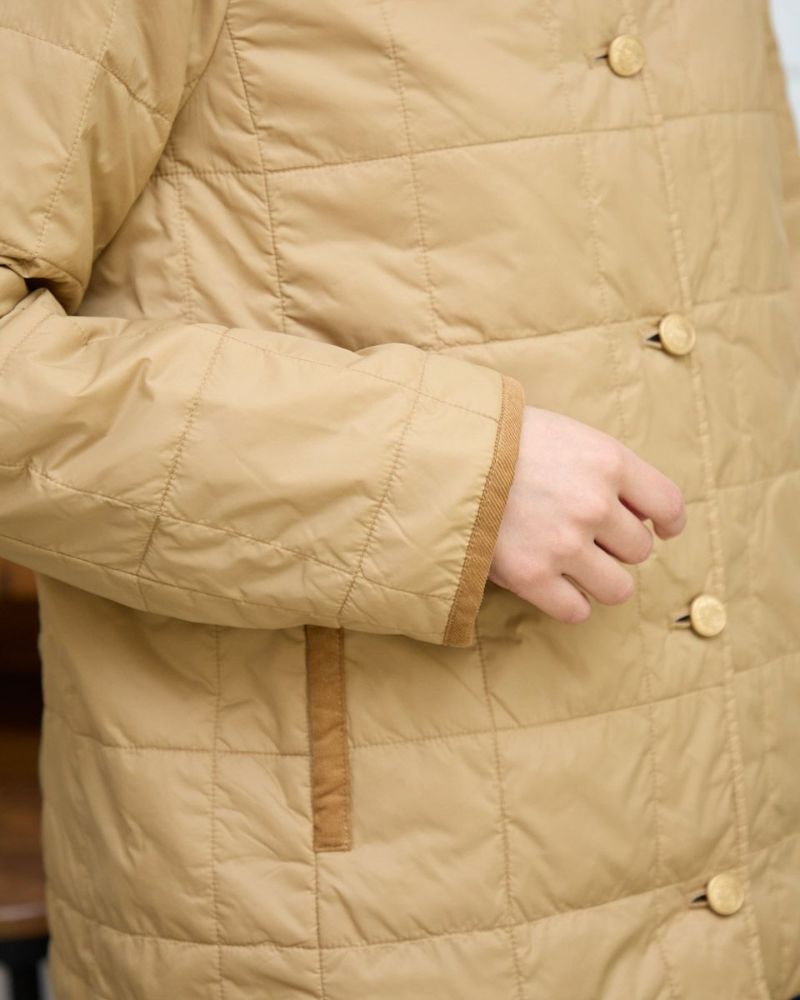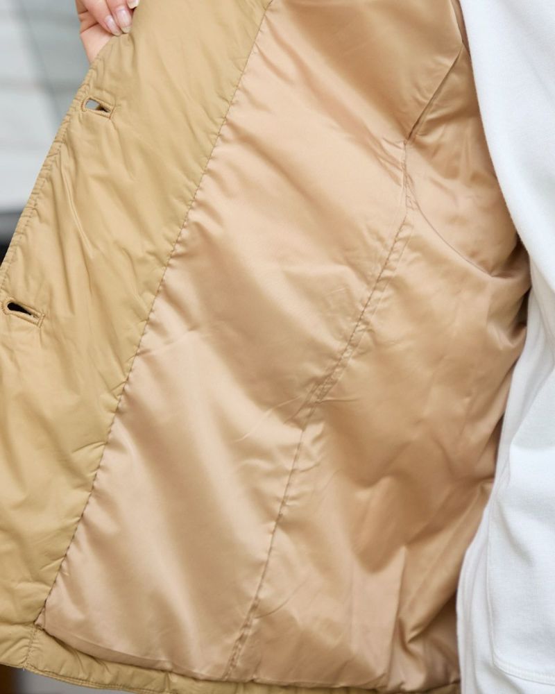 8㎝ほどのスクエア型にキルティングを施した生地は、ほのかな光沢が親しみやすいナイロン混の素材をセレクト。高密度で織られキメが整っているため砕け過ぎず、きちんと感を保ってお召しいただけます。暖冬を考慮し中綿は薄く40gに設定。着丈も腰骨ほどでコンパクトなシルエットと軽さを活かしスイッチシーズンの羽織りやウールコートのインナー使いもおすすめ。カジュアルなアイテムですがフロントにメタル釦を使い、より洗練された雰囲気に仕上げています。スラックスやハイゲージのニットとも相性が良く通勤や学校行事での着用も素敵です。