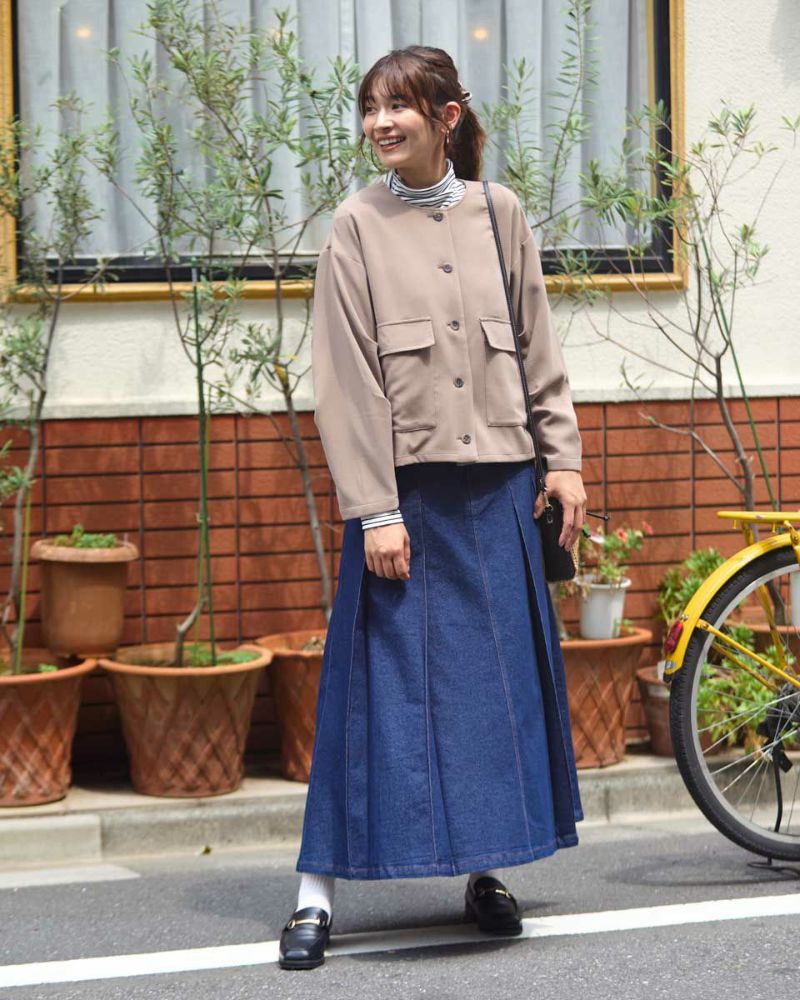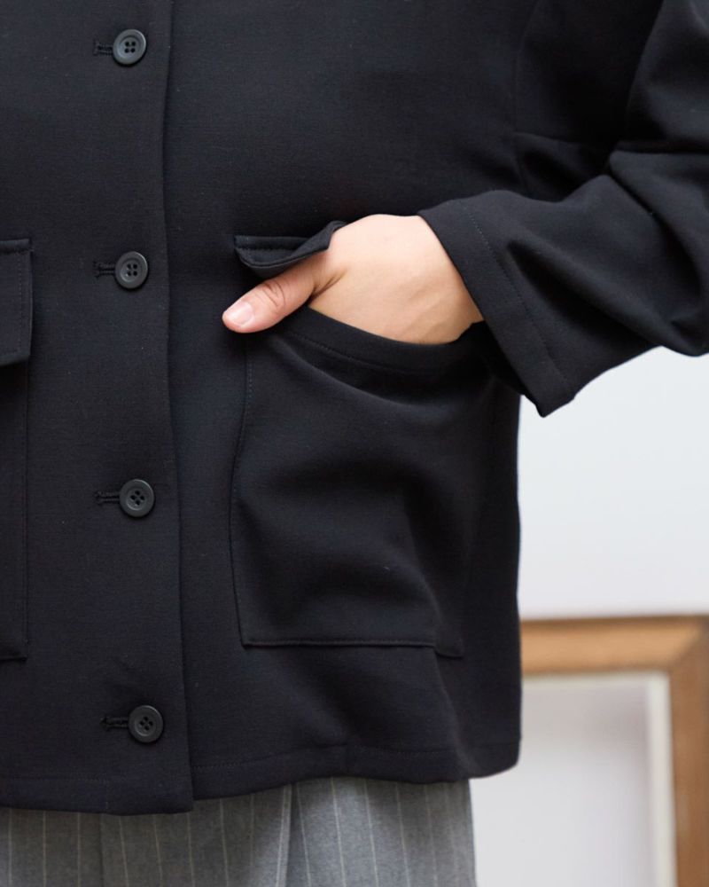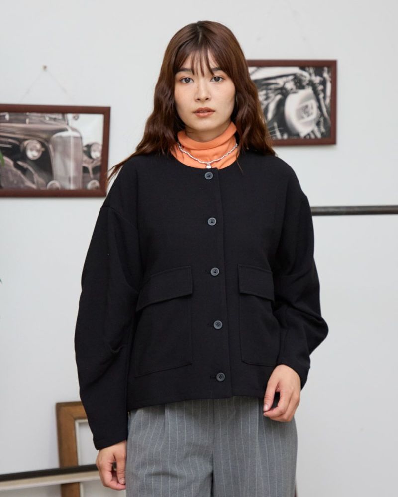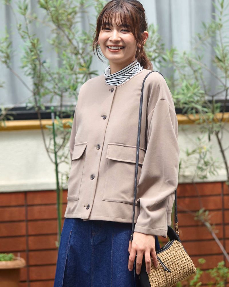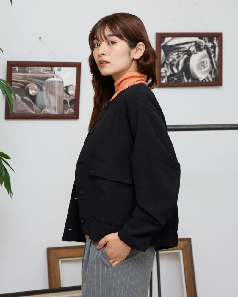ほどよい肉厚感で保温性のある二重織りの生地を使ったブルゾン。短めの着丈でアクティブ感があり時流の着こなしをお楽しみいただけます。肘に施したタックがアクセントになり羽織るだけでサマになるアイテムです。コンパクトなネックラインがカジュアルさを抑えてくれるので釦をすべて閉じた着方も品がありおすすめです。キメの整った織り目の表面には毛羽感がないため、気温差のあるスイッチシーズンからお使いいただけます。他のアイテムと合わせやすいブラックとモカのカラー展開でオフィスやお子様の送迎での着用にもピッタリです。 モデル身長: 168 cm 着用サイズ: M サイズ Golden Bear White Label (Ladies') アウター (Ladies') 【着用アイテム】468RC460 タートルネック 468RC750 ストライプパンツ 468RC751 デニムスカート