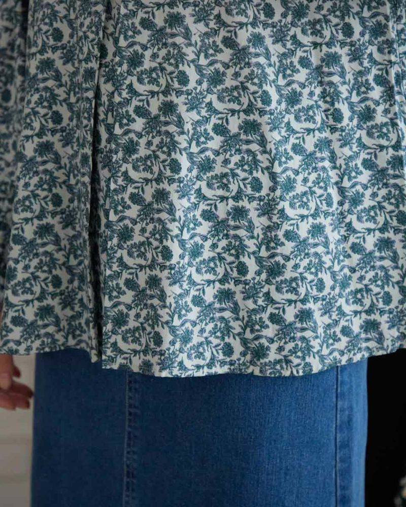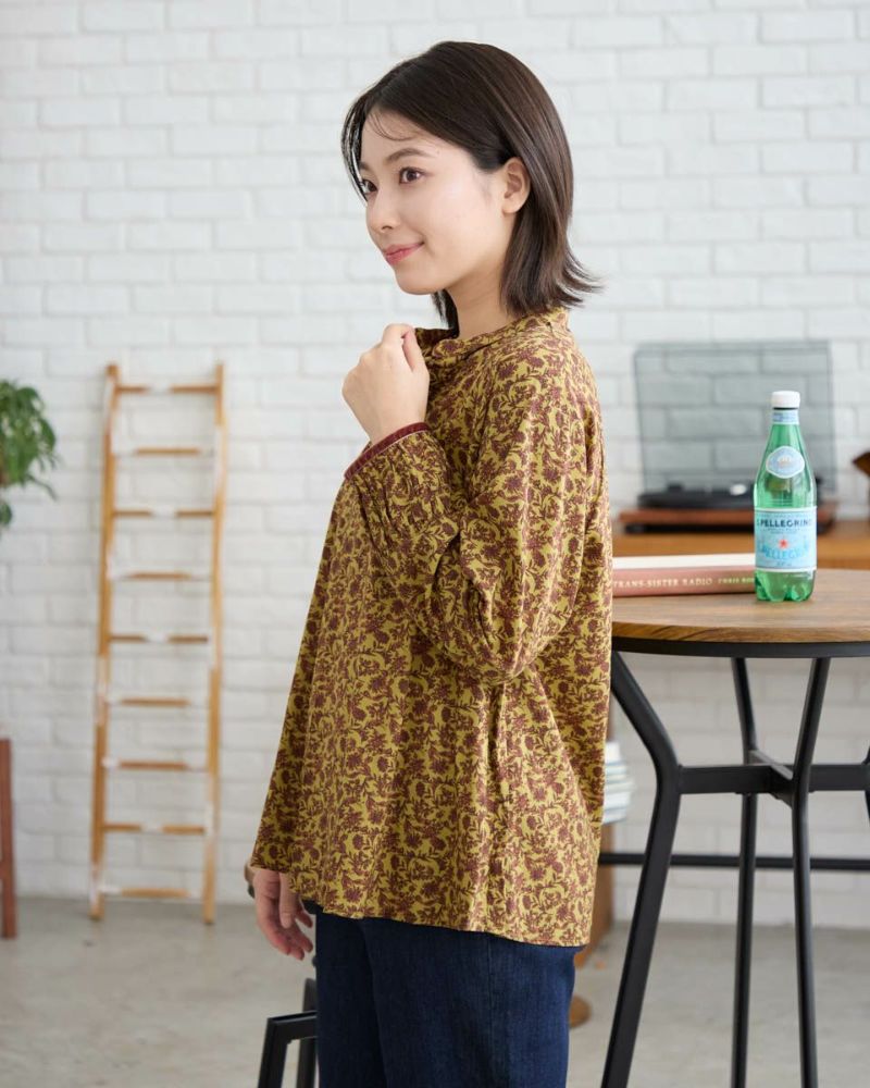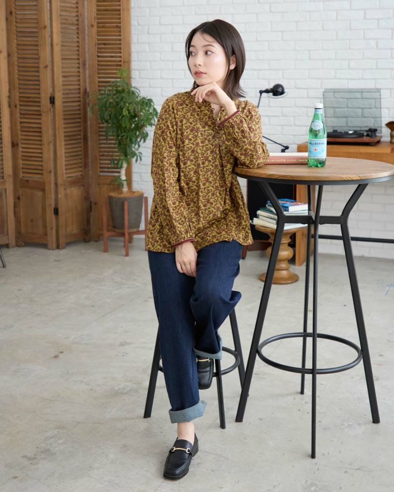 平織りの綿レーヨンを使ったブラウス。強張らず、しなやかに落ちるため上品な佇まいが魅力。フロントのヨークがポイントになりジャケットやジレを羽織るスタイルも素敵です。腰骨ほどの着丈はボトムスを選ばずデイリーに着用が可能。袖口にあしらったベロアがクラシカルに手元を映します。色の強さや儚さを重ねて表現したサンザシの柄をプリントしています。シックな中にも甘さがある大人のブラウス。海風が冷たい静かな青島の街。真っ赤な実が有名と、両手いっぱいにサンザシのお菓子を持たせてくれ、中国出張で触れ合った人たちとの思い出を込めたプリントです。