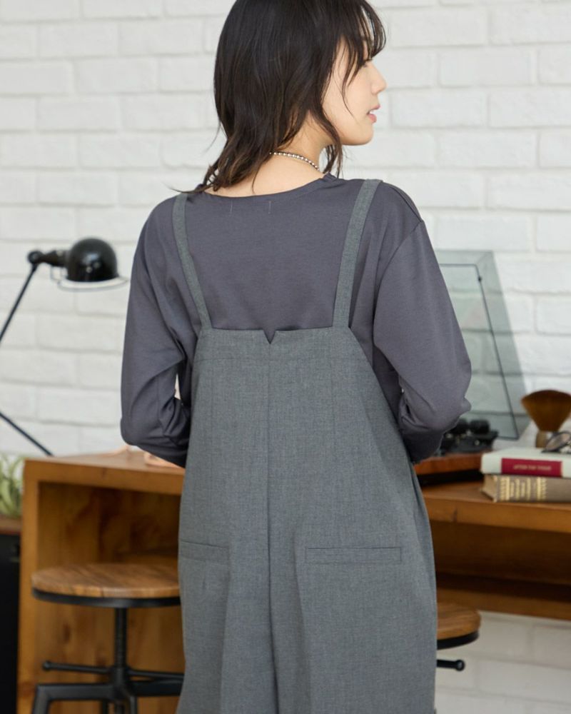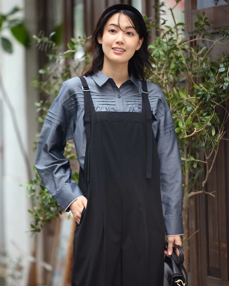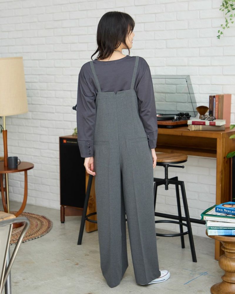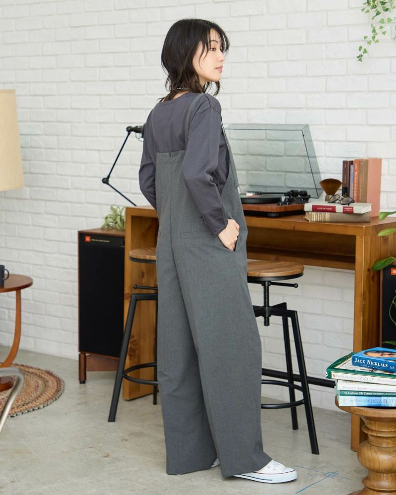 ほのかな光沢と整った織り目が上品な生地で仕上げたサロペット。トップの身頃幅をコンパクトにし、バストや背中が広く見えない工夫をしています。光を抑えたショルダーのメタルアジャスターには落ち着きがあり大人世代におすすめの1着。パンツ部分はほどよく揺れるストレートシルエットで、足のラインを拾わずスラックスのようなきちんと感があるため、オフィスや推し活での着用も素敵です。ブラウスやタートルカットソーなどインナーを選ばない優秀アイテム。ハンサムな雰囲気があるので一粒パールのピアスや指先のネイルで艶を足す着こなしもおすすめです。 モデル身長: 166 cm 着用サイズ: M サイズ Golden Bear White Label (Ladies') ブラウス (Ladies') 【着用アイテム】468RC360 シアーブラウス 468RC361 ピンタックブラウス 468RC450 クルーネックプルオーバー