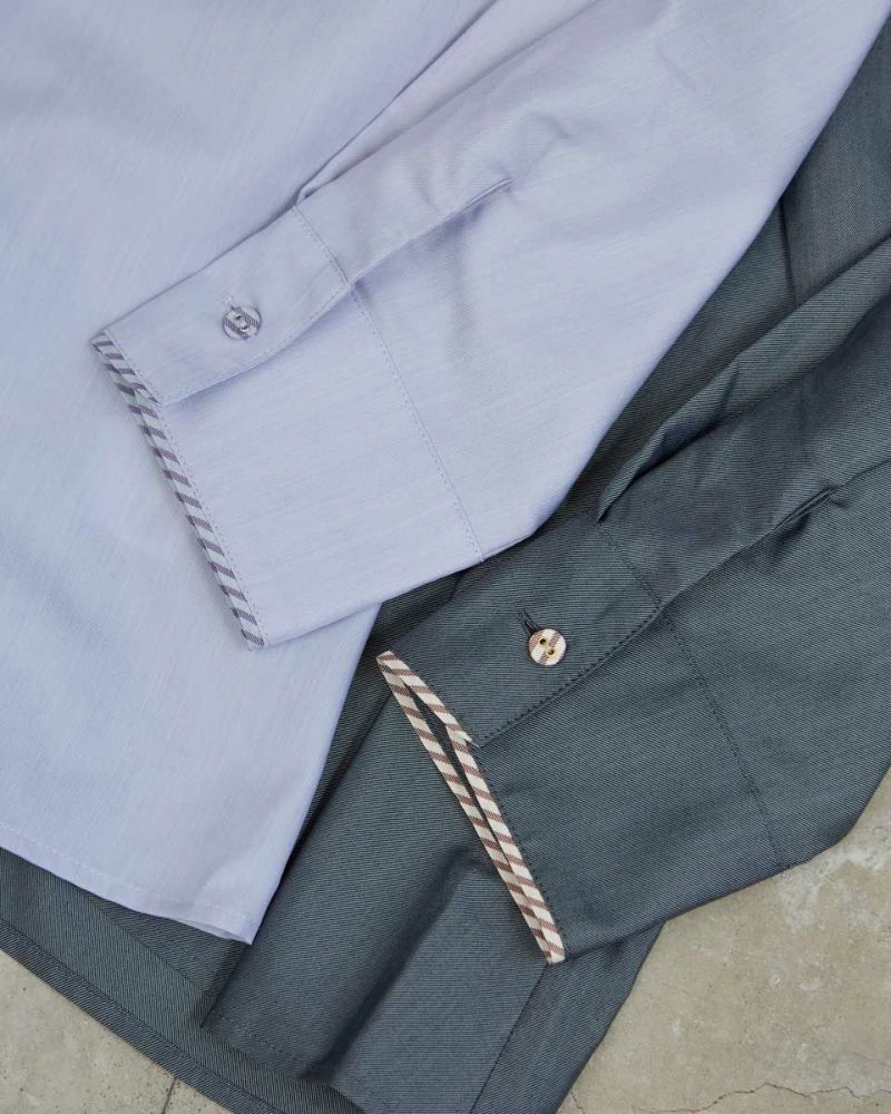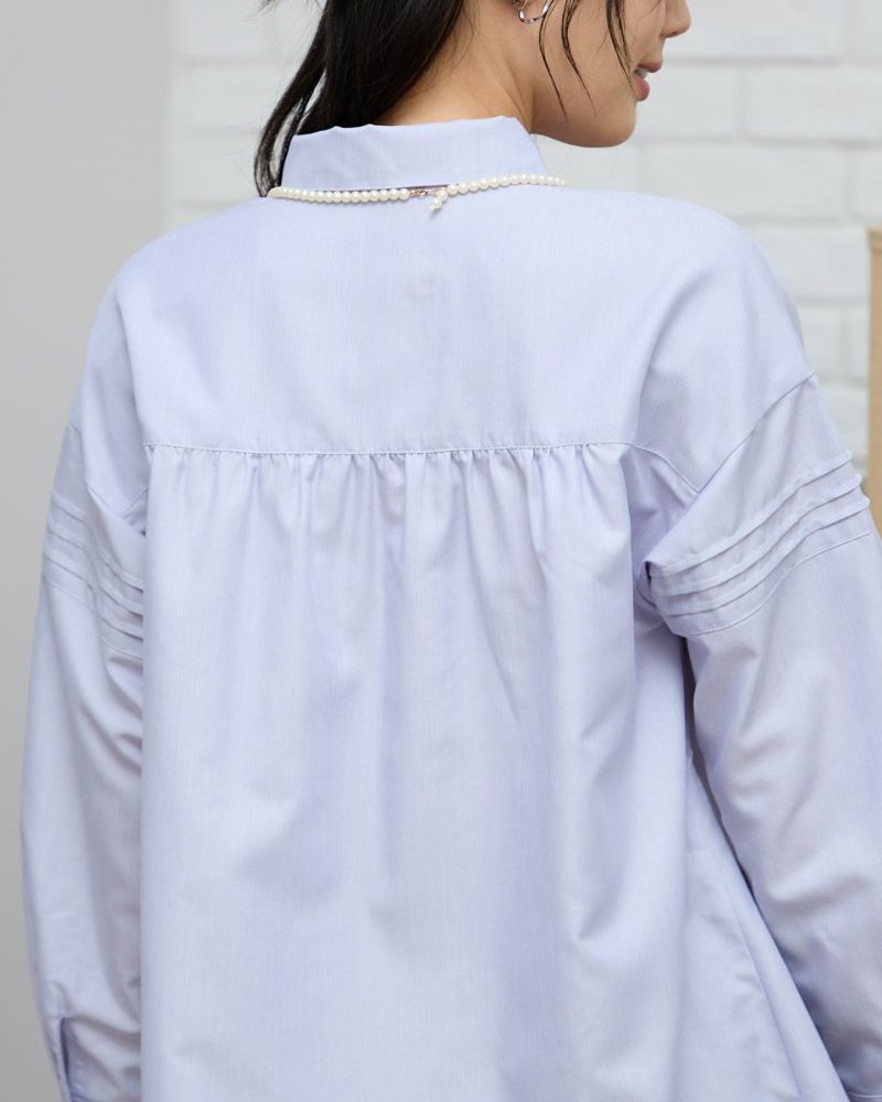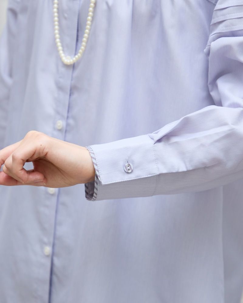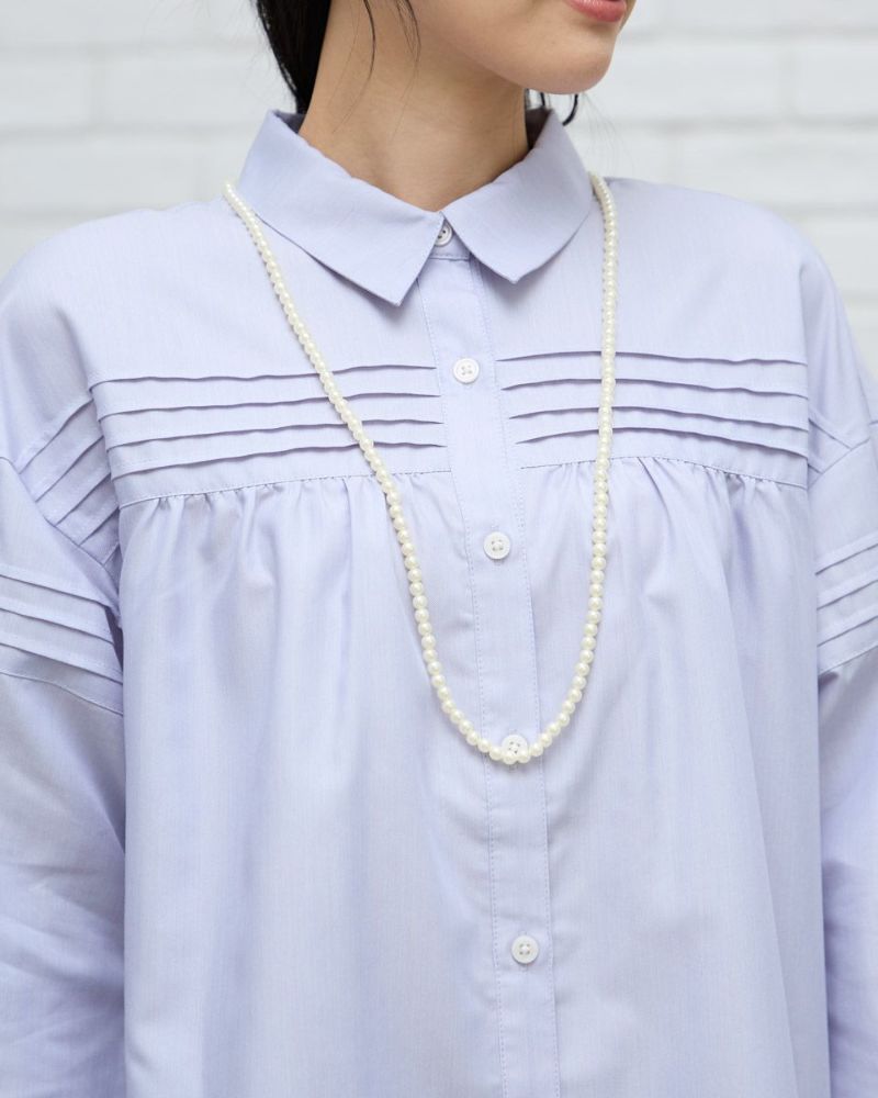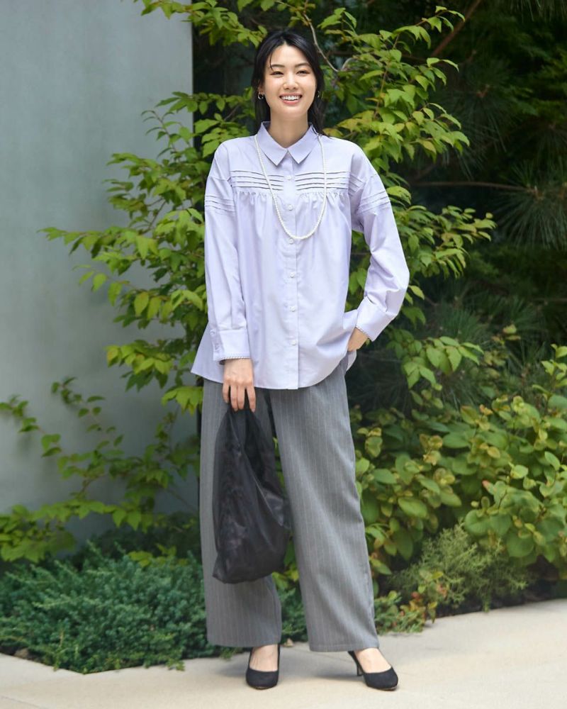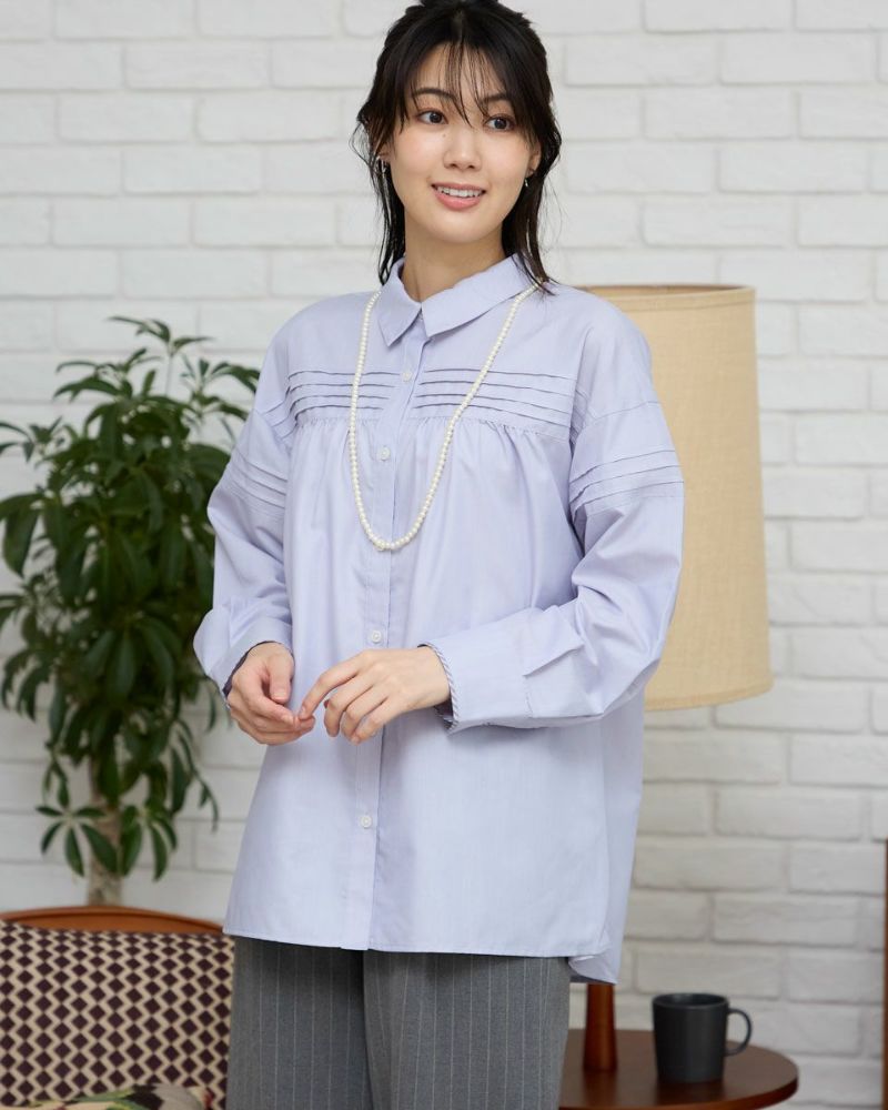 細かいツイルに織った生地は、ほのかなツヤ感でキレイ見え抜群なアイテム。しなやかさもあるため、強張りを気にせずお召しいただけます。白い糸を用いて織っているため発色も柔らかくベーシックカラーとも馴染みやすいです。フロントに施したピンタックに、ほどよい甘さと華やかさがあり1枚着もしっかりと担います。襟が付いていて、きちんと感もあるのでスラックスを合わせてオフィスや学校行事での着用も可能。寒さが増したら、トレンドのファーべストやローゲージのニットを重ねてカジュアルダウンしても可愛くておすすめです。