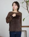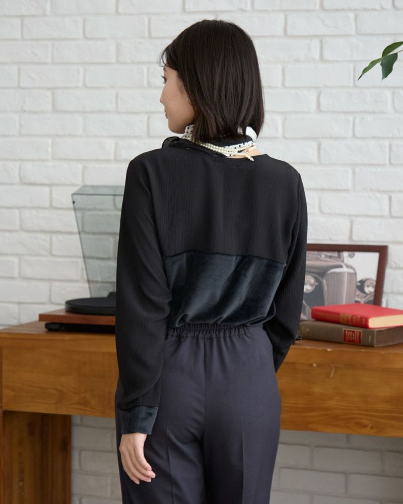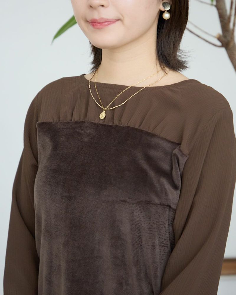 細かい毛羽で覆われ滑らかな手触りが気持ち良いベロアを身頃に用いたドッキングアイテム。秋の訪れを感じる素材のため、暑さの残るスイッチシーズンでの着用はお洒落度が増しおすすめ。ヨークと袖にはタテ方向の細長いシボが特徴的な楊柳素材をセレクト。ほのかな透けとツヤ、落ち感が大人っぽく、熱がこもりにくい点も嬉しいポイント。砕け過ぎないセットインスリーブとクルーネックのディティールはボトムスを選ばない優秀アイテム。表情の異なる素材使いで華やかさもありデイリーに1枚着をお楽しみいただけます。春から続くトレンド感のあるブラウンもコーデに奥行が出て素敵です。
