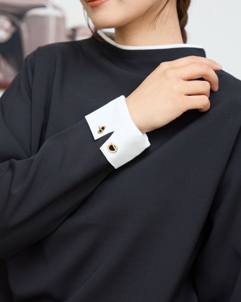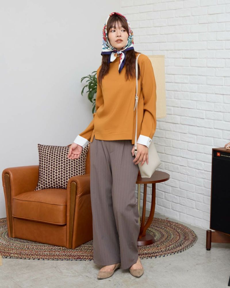 ほどよい厚みと弾力がある2重織りの素材をセレクト。ボディラインを拾わずダレにくいため清潔できちんとした印象のプルオーバー。Tシャツよりも肉厚で裏毛より薄手な生地感は1枚着の季節に便利。身頃から続きで立ち上げたボトルネックと袖口にあしらった別地がポイント。白いシャツを重ね着しているようなクラシックスタイルのアイテム。袖口のメタルチャームが光る様子も華やかなフェミニンさがありオフィスや握手会でお召しになっても素敵です。シックなブラックの使い勝手は抜群!オレンジも顔映りが良くトレンドのブラウンと相性がいいのでおすすめ。
