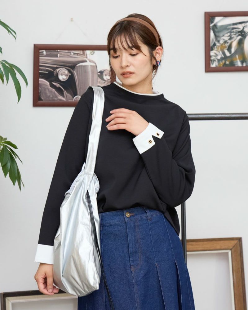 ほどよい厚みと弾力がある2重織りの素材をセレクト。ボディラインを拾わずダレにくいため清潔できちんとした印象のプルオーバー。Tシャツよりも肉厚で裏毛より薄手な生地感は1枚着の季節に便利。身頃から続きで立ち上げたボトルネックと袖口にあしらった別地がポイント。白いシャツを重ね着しているようなクラシックスタイルのアイテム。袖口のメタルチャームが光る様子も華やかなフェミニンさがありオフィスや握手会でお召しになっても素敵です。シックなブラックの使い勝手は抜群!オレンジも顔映りが良くトレンドのブラウンと相性がいいのでおすすめ。