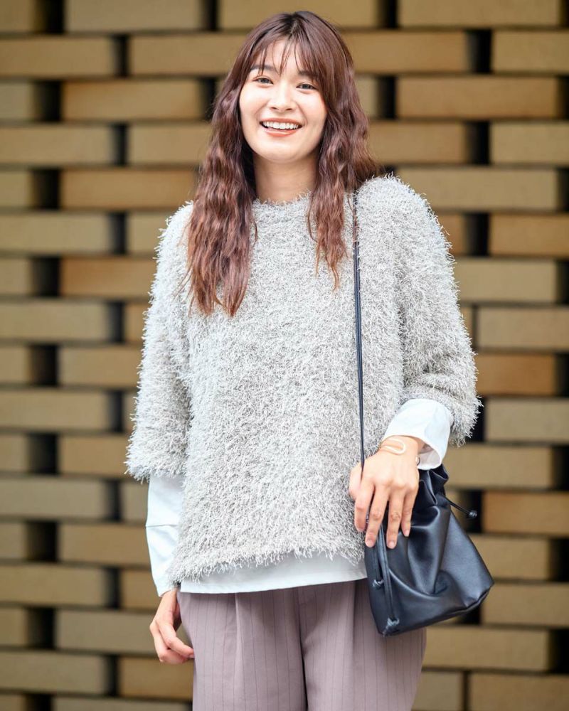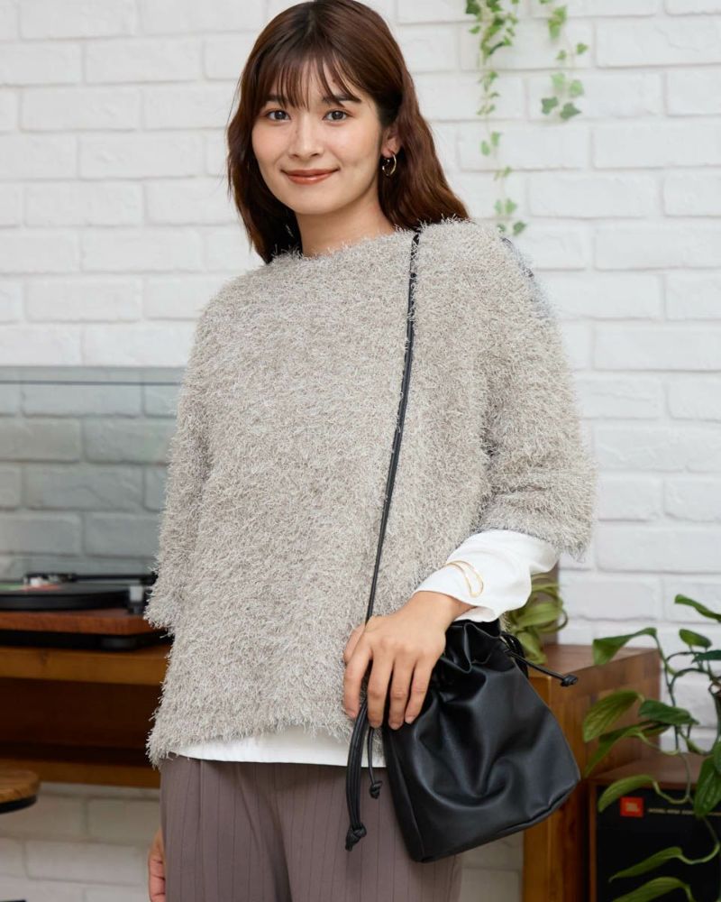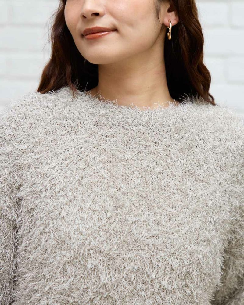 モジャモジャした長い毛羽が印象的なシャギーのニットプルオーバー。全身に1.5㎝ほど吹く糸には光沢があり暑苦しさが軽減されゴージャスな見た目が魅力です。肘にかかる袖丈で1枚着はもちろん、気温に応じてインナーにシャツやロンTを合わせる着方もおすすめ。ボクシー型で身体にフィットしすぎず、どんなボトムスとも好相性です。暑さの残るスイッチシーズンでの着用もお洒落ですが、年末年始の華やいだシーンでの着用も素敵です。モンスターのような雰囲気にチャーミングさがあるため経験をつんだ大人のお客様にこそ、お召しいただきたいアイテムです。 モデル身長: 168 cm 着用サイズ: M サイズ Golden Bear White Label (Ladies') ニット (Ladies') 【着用アイテム】468RC450 クルーネックプルオーバー 468RC750 ストライプパンツ 468RC751 デニムスカート
