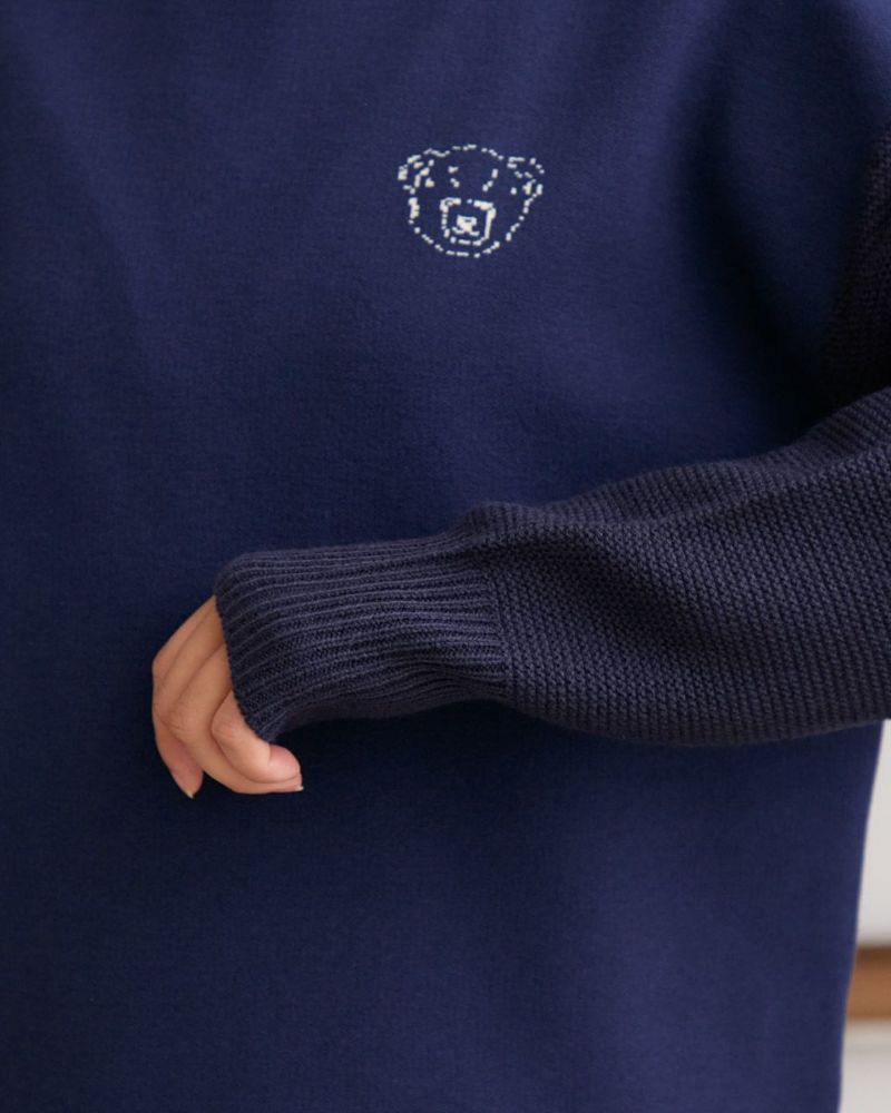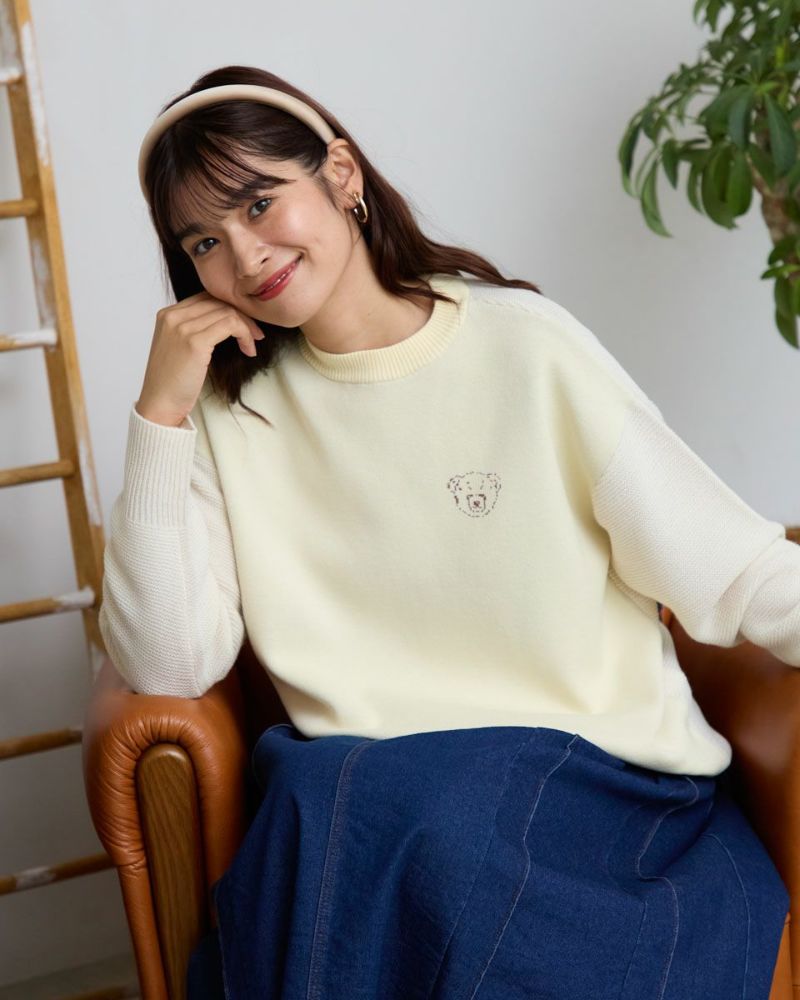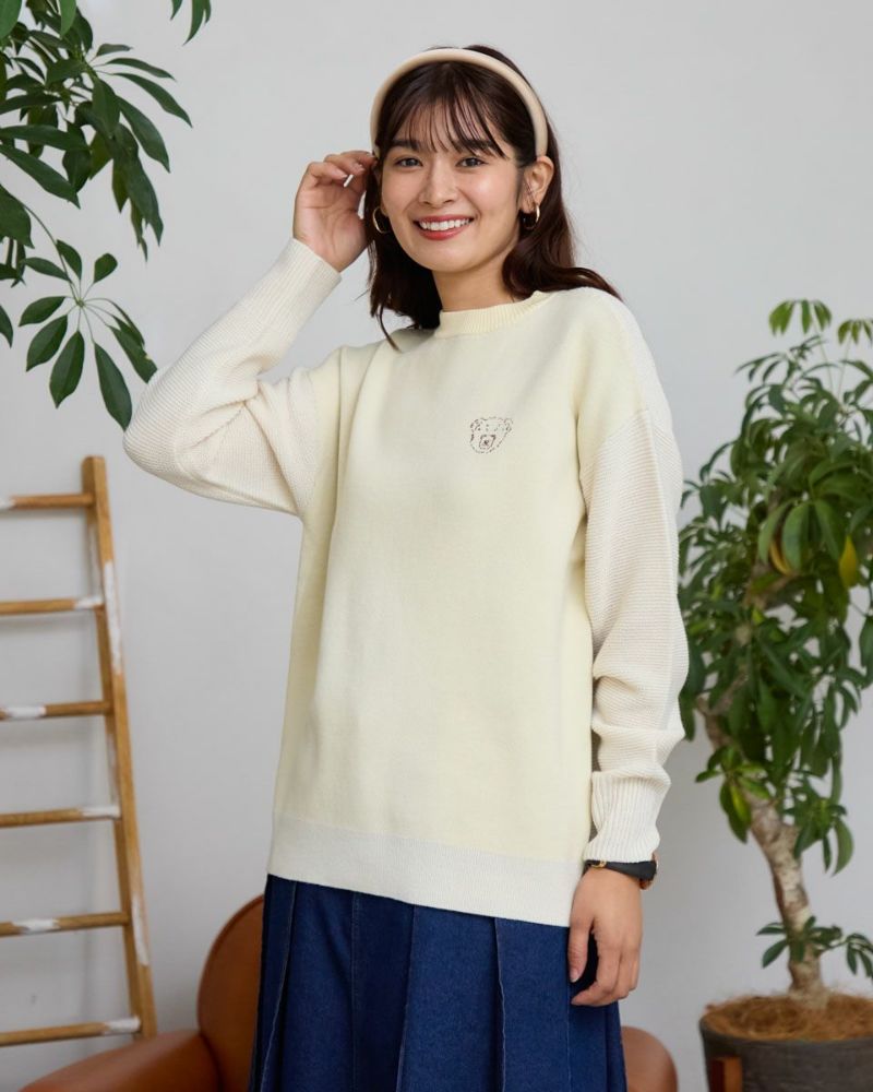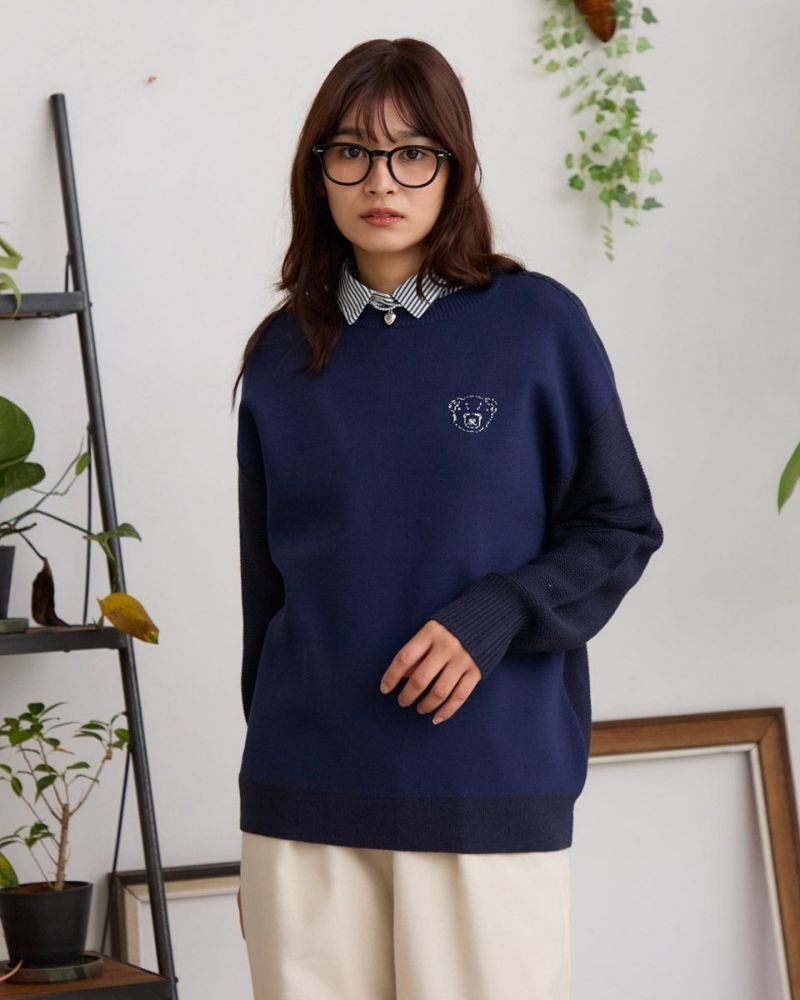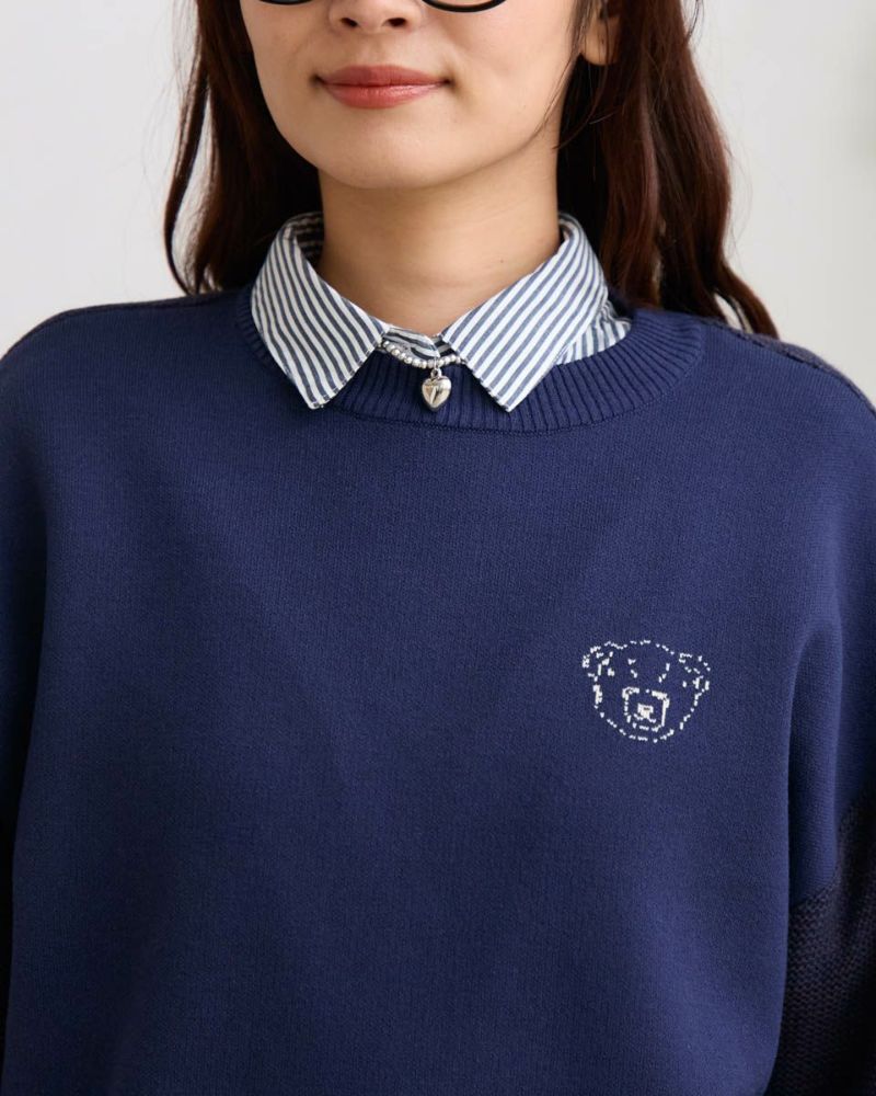 ダブルジャカードで編み立てた前身・左胸に表現したクマのバーバラがポイントのプルオーバー。毛羽が少なくキレイなフロントに対し表情が異なるガーター編みで仕上げた袖と背中の組み合わせが楽しいアイテム。背中にはバーバラのBの文字を大きく縄編みで表現。インパクトのあるバックショットがチャーミングでコーデにも洒落の効いた可愛さが生まれるため大人のお客様にこそ、お召しいただきたいニットです。色みを抑えているため悪目立ちせずジュエリーを添えてオフィスでの着用も◎ハイネックインナーと合わせてジャック・ニクラウスのようにゴルフを楽しむのもお薦めです。