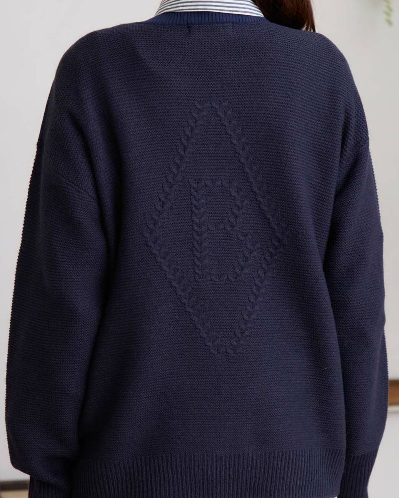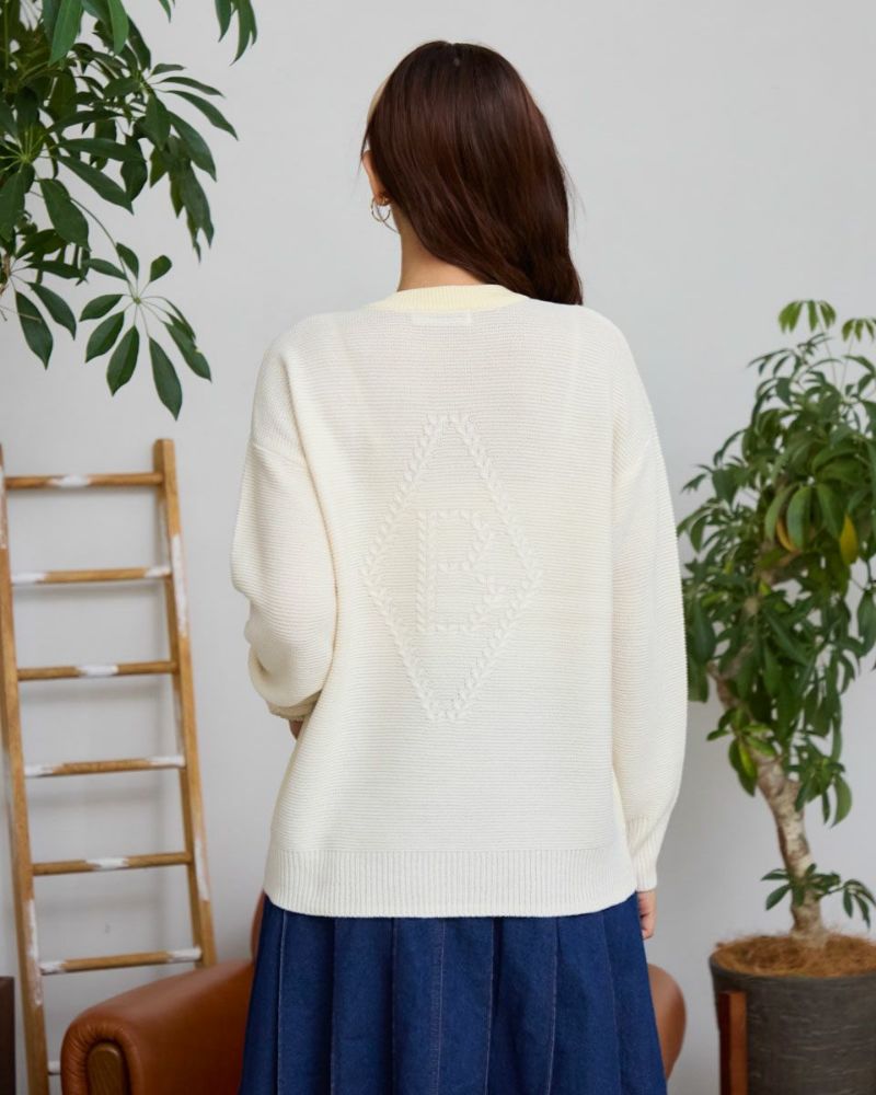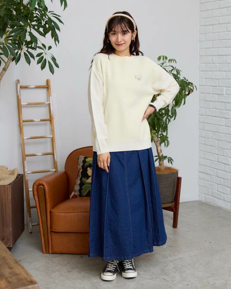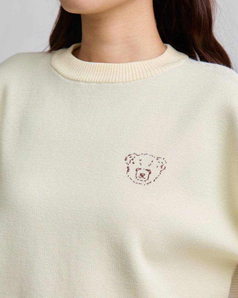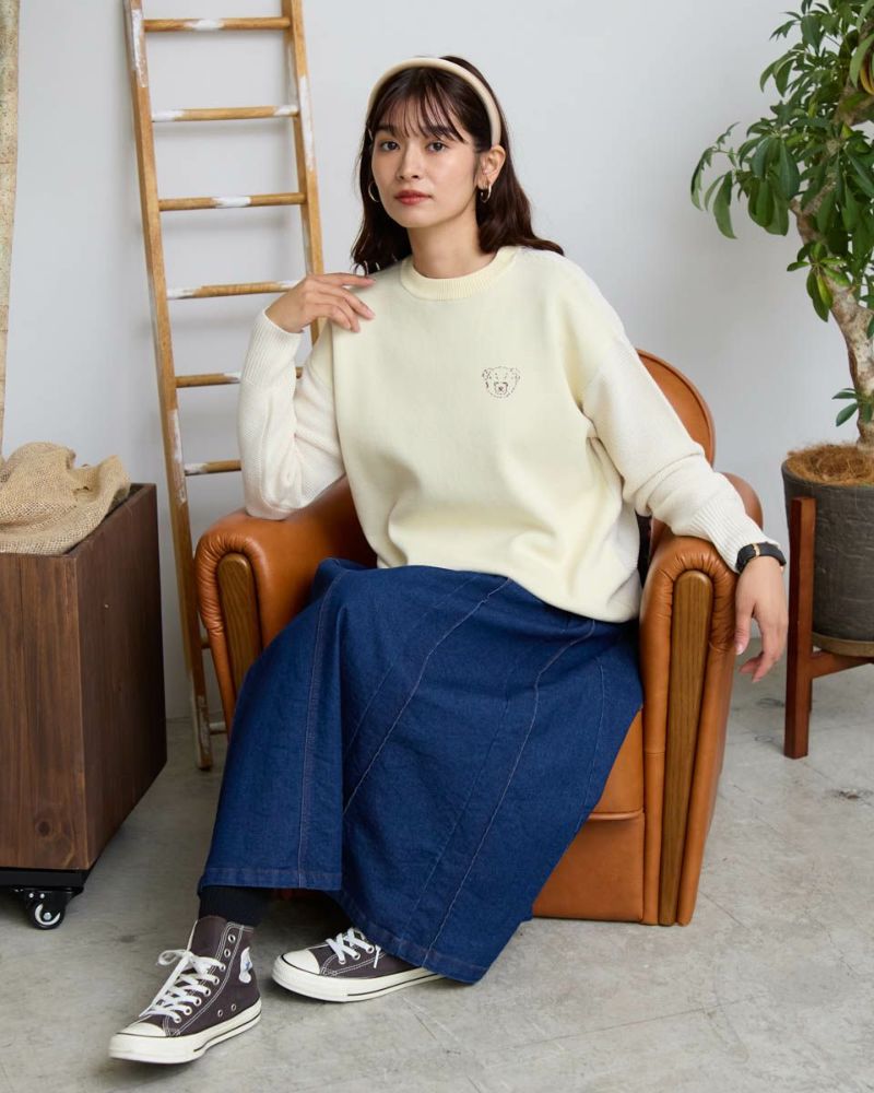 ダブルジャカードで編み立てた前身・左胸に表現したクマのバーバラがポイントのプルオーバー。毛羽が少なくキレイなフロントに対し表情が異なるガーター編みで仕上げた袖と背中の組み合わせが楽しいアイテム。背中にはバーバラのBの文字を大きく縄編みで表現。インパクトのあるバックショットがチャーミングでコーデにも洒落の効いた可愛さが生まれるため大人のお客様にこそ、お召しいただきたいニットです。色みを抑えているため悪目立ちせずジュエリーを添えてオフィスでの着用も◎ハイネックインナーと合わせてジャック・ニクラウスのようにゴルフを楽しむのもお薦めです。