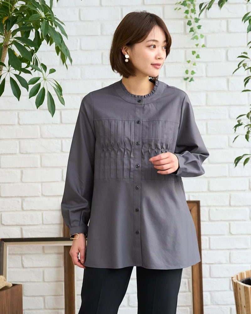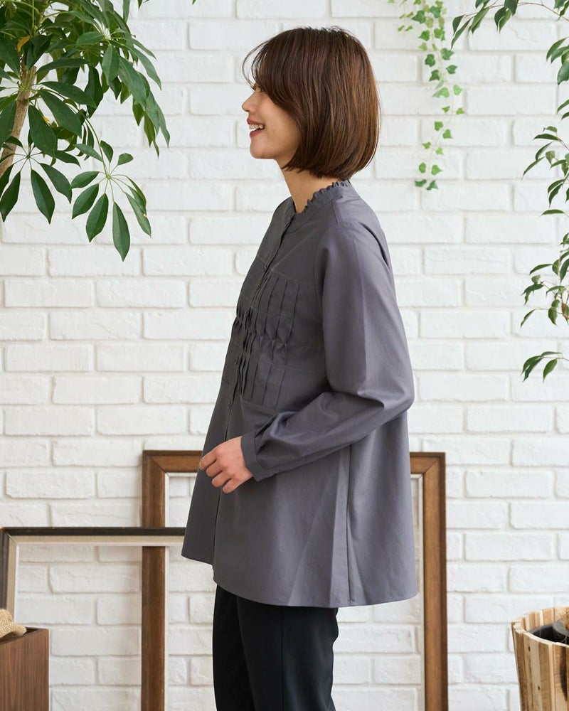 清潔感のある細かいツイルの織り目は、ほのかに光沢もありソフトで滑らか。フロントにあしらったピンタックが麗らかな日に映える春ブラウスになっています。ハの字型のチドリステッチが生地を細かく掴む様子やピンタックが小さく隆起する姿に手仕事感があり、品良くお召しいただけるアイテム。フェミニンに揺れる裾のフレアを活かしてアウトスタイルでの着用がお薦め!爽やかなアイボリーとシックなグレーのカラー展開は使いやすくパールやジュエリーを添えてオフィスや卒・入学式での着用も素敵です。カジュアルなボトムスには軽く袖をまくって羽織るスタイルもこなれ感が有りお薦めです。