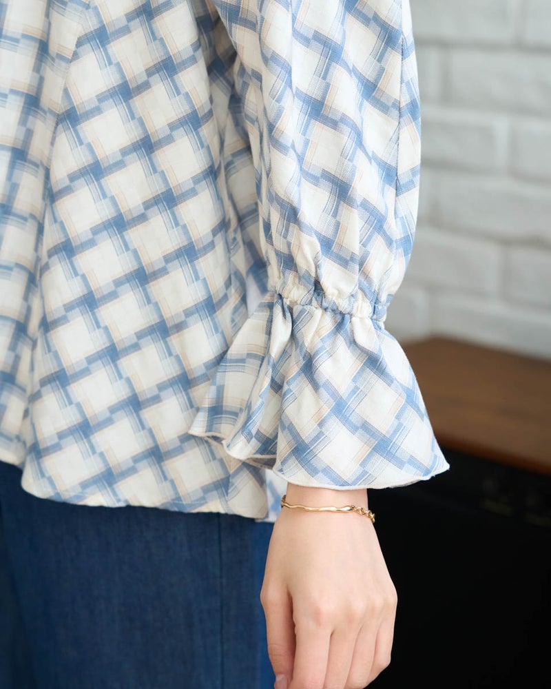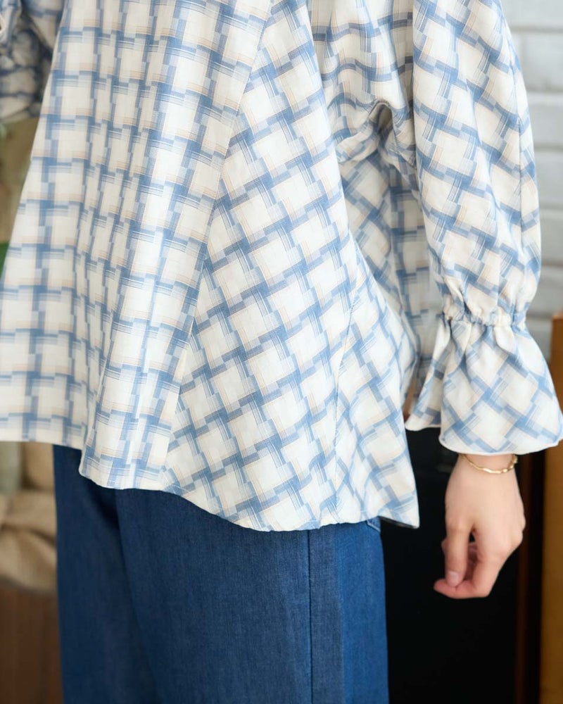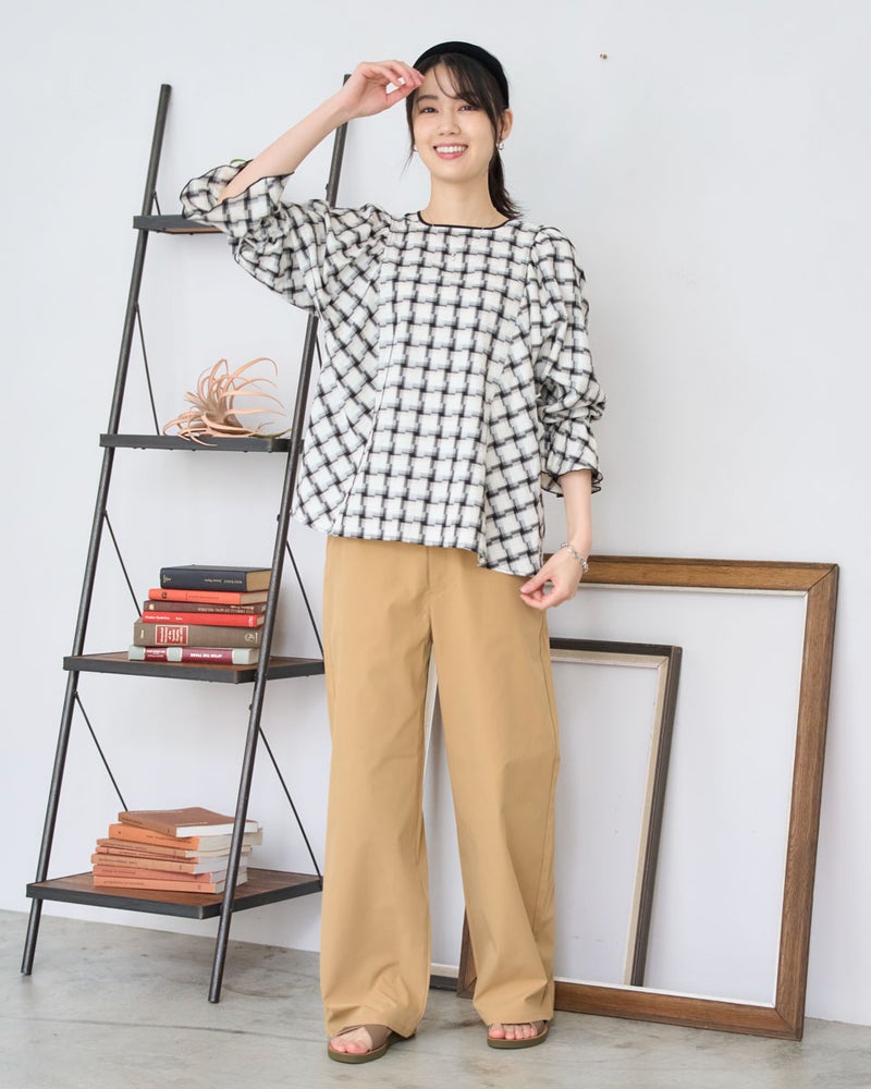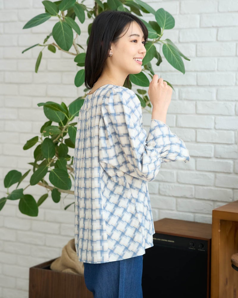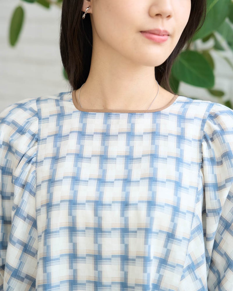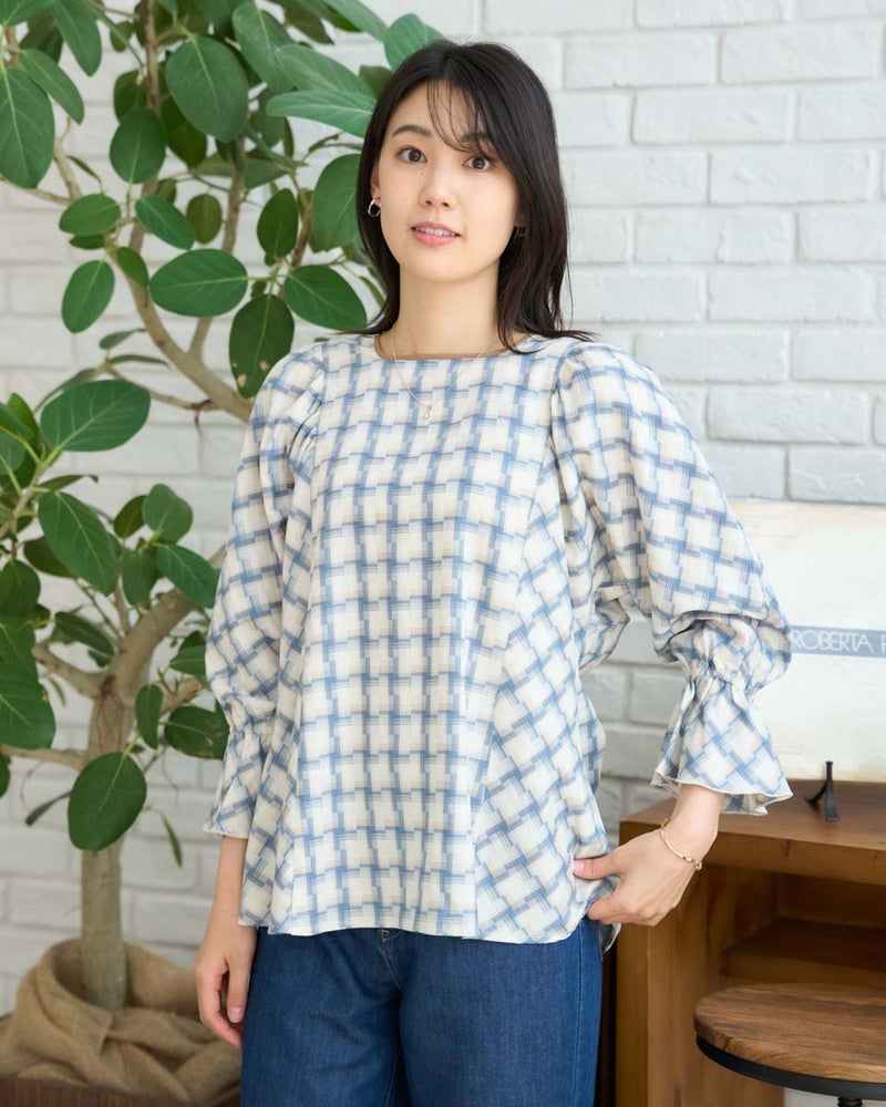 オンブレの滲んだような柔らかい雰囲気はそのままに、メンズ要素を少なくするため格子を小さくし、ずらしたようなアレンジを加えたチェックのブラウス。ずらした格子が風を待つ風車の羽根のように見え、柔らかく滑らかな素材と合わさり、より爽やかでフェミニンな柄に仕上がりました。スクエアのネックラインが肌をキレイに映し、フレアを含んだ身頃やドルマン袖が程よく落ち、幼さが消えた点も嬉しいポイント。バイヤス使いで華やかさの増した袖には、ネイルで艶を足しても素敵です。ボトムスは甘さを軽減するパンツ合わせがおススメです。