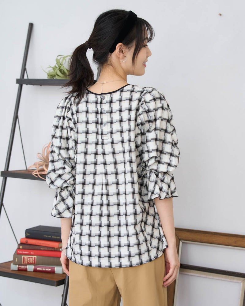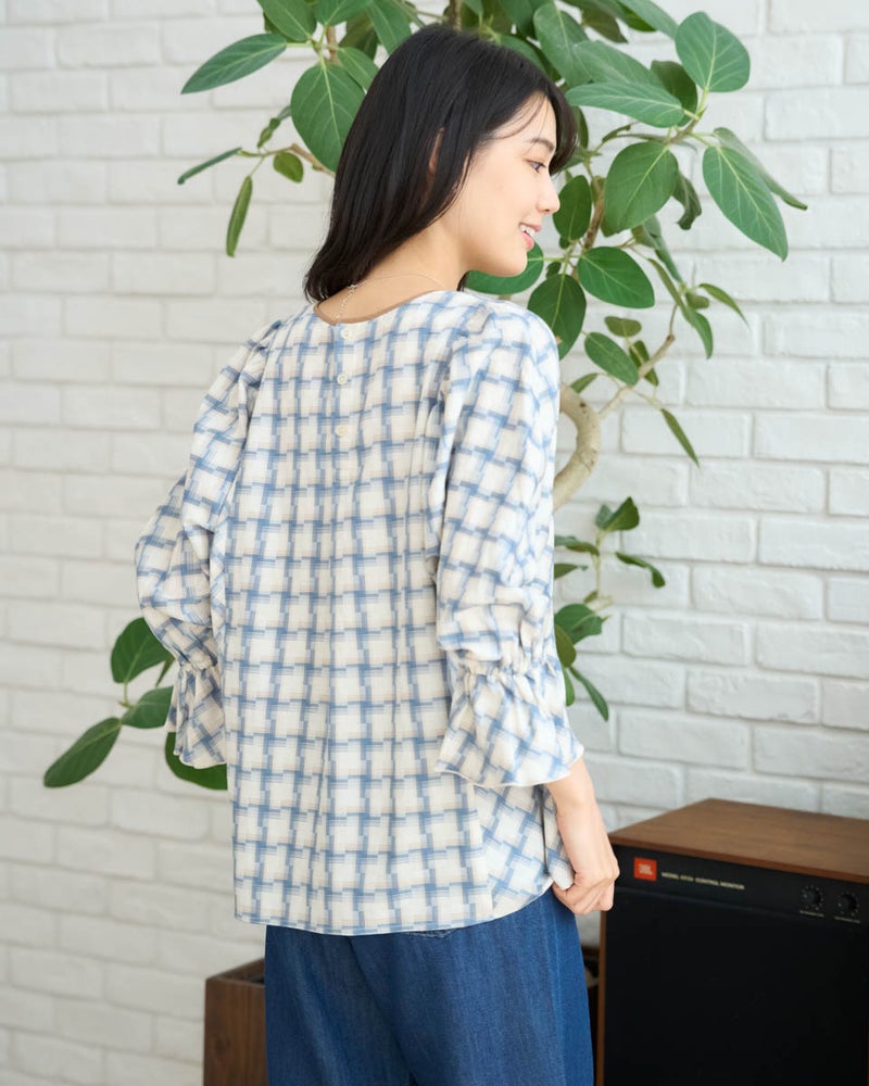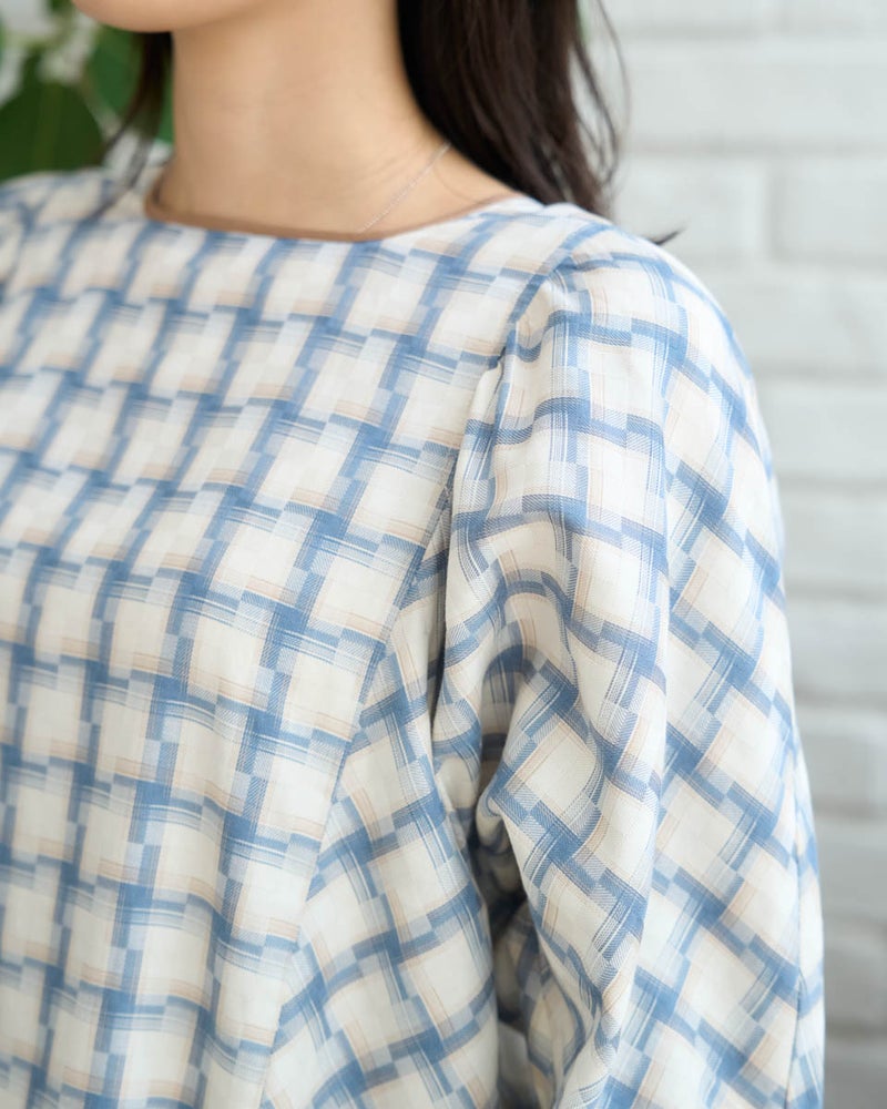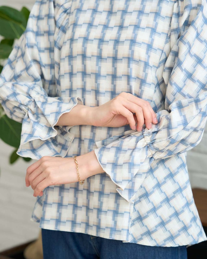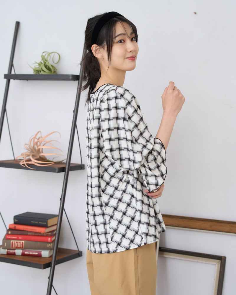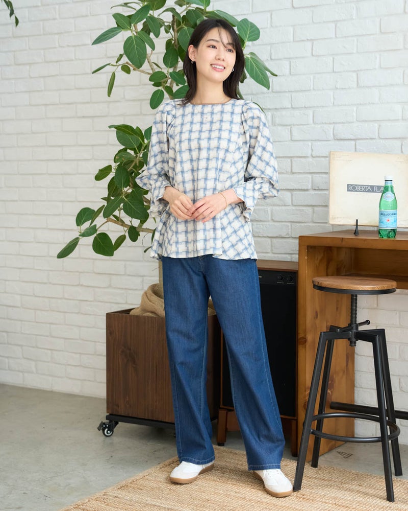オンブレの滲んだような柔らかい雰囲気はそのままに、メンズ要素を少なくするため格子を小さくし、ずらしたようなアレンジを加えたチェックのブラウス。ずらした格子が風を待つ風車の羽根のように見え、柔らかく滑らかな素材と合わさり、より爽やかでフェミニンな柄に仕上がりました。スクエアのネックラインが肌をキレイに映し、フレアを含んだ身頃やドルマン袖が程よく落ち、幼さが消えた点も嬉しいポイント。バイヤス使いで華やかさの増した袖には、ネイルで艶を足しても素敵です。ボトムスは甘さを軽減するパンツ合わせがおススメです。
