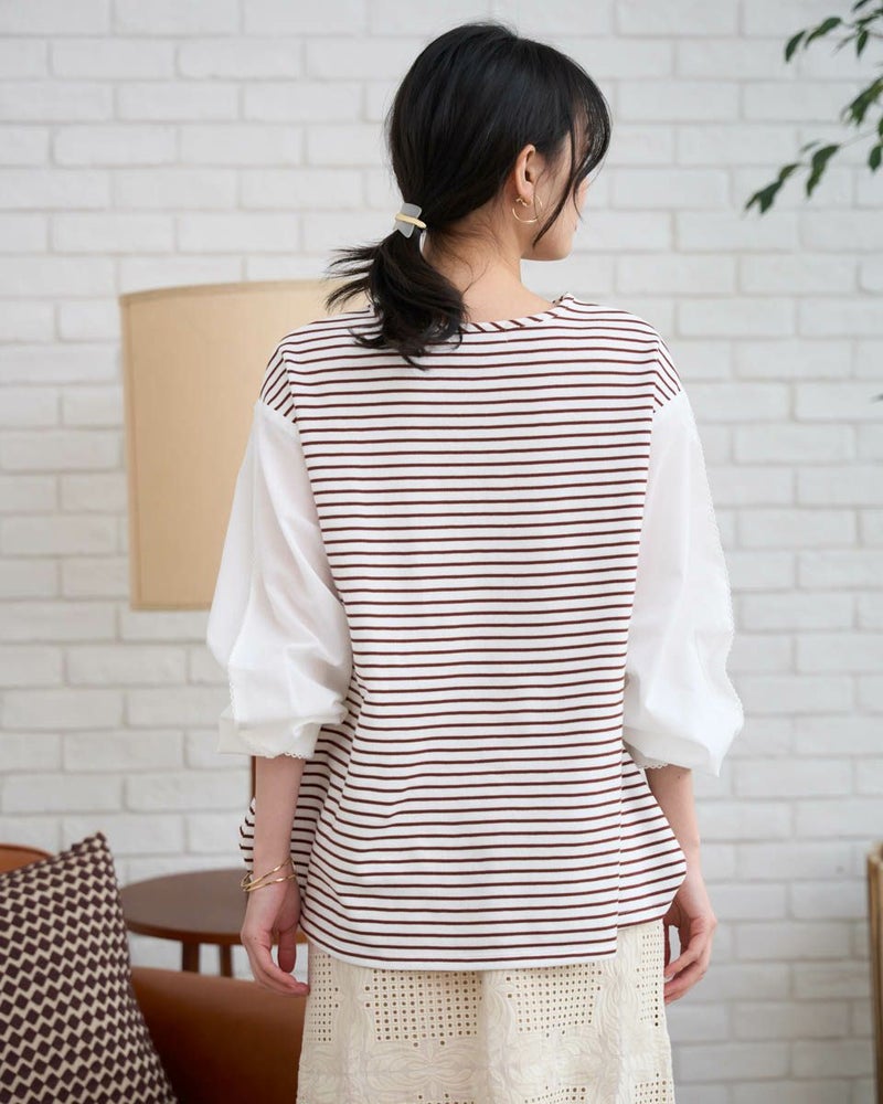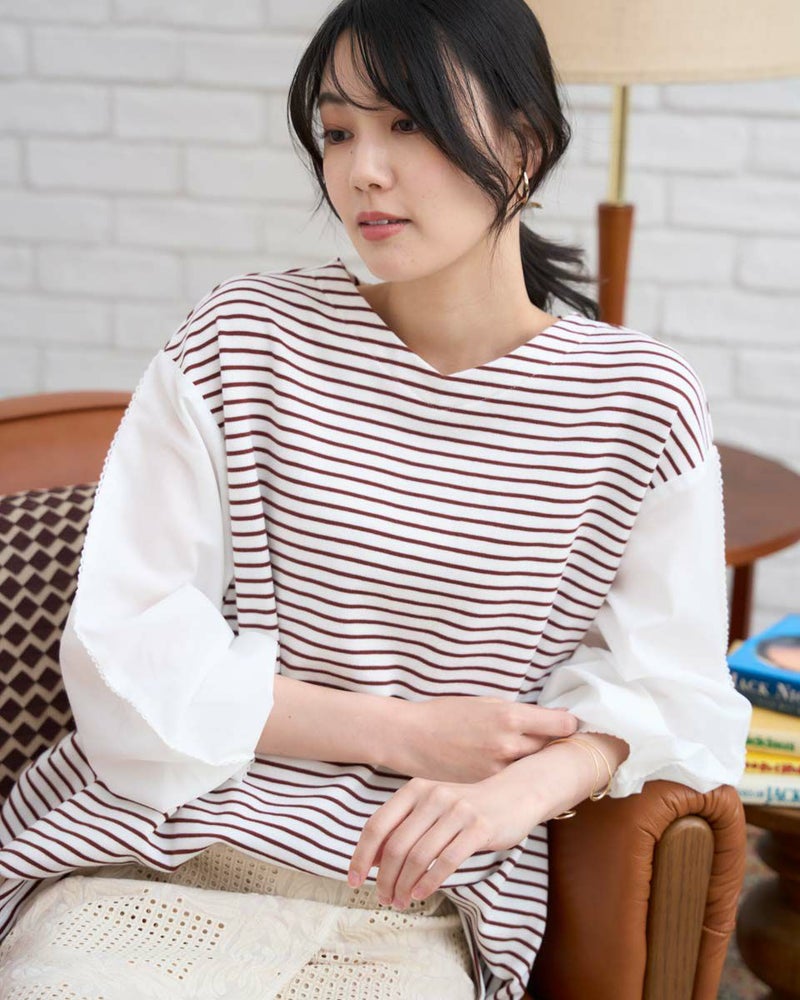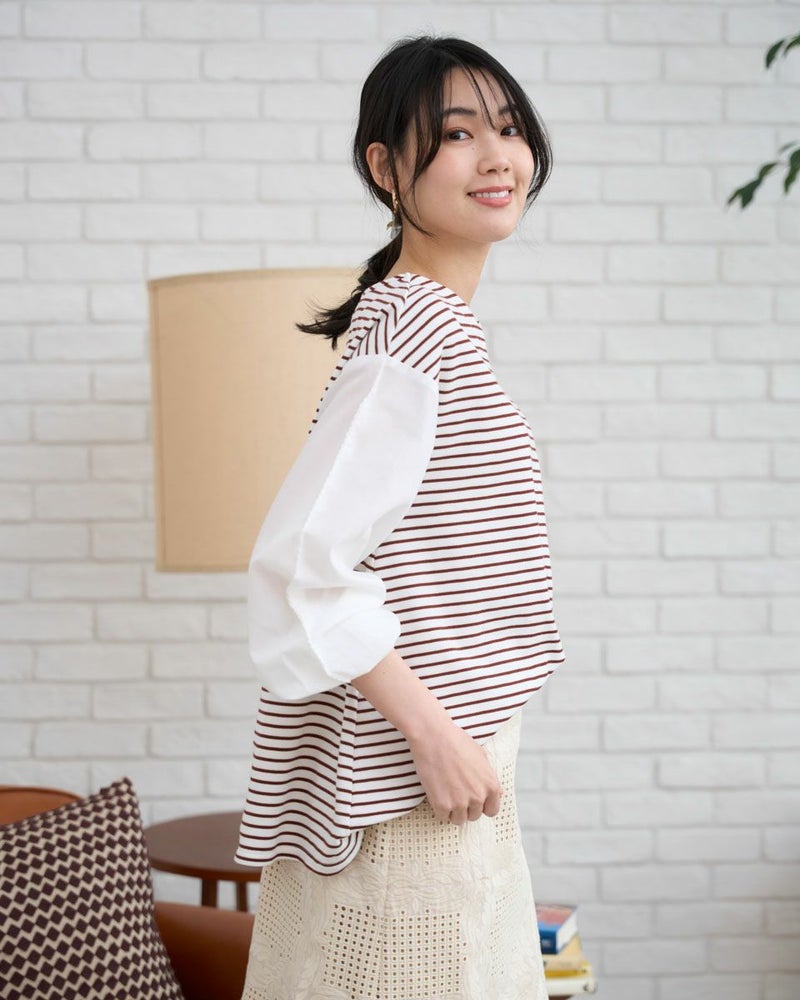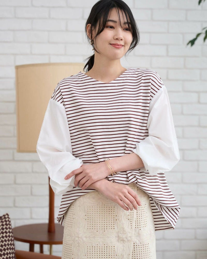 ボーダーに編んだワッフル調のカットソーを前後の身頃に使ったカットソー。細かい格子の表情にナチュラルな優しさも感じるアイテム。程よい張りと伸縮性に富み、ゆとりのある身頃もダレず清潔感を保ってお召しいただけます。ほのかに透ける布帛であしらった袖が軽やかで春らしさ満天のアイテム。小さなレースを連想させる袖山のピコットミシンもポイント!袖山線にカーブも付けているため腕にまとわり付かず、ふわりと膨らむ華やかな可愛らしさもイチ推しです!浅いVネックは華奢なネックレスとも好相性◎ボトムスは、パンツとの合わがバランス良くおススメです。