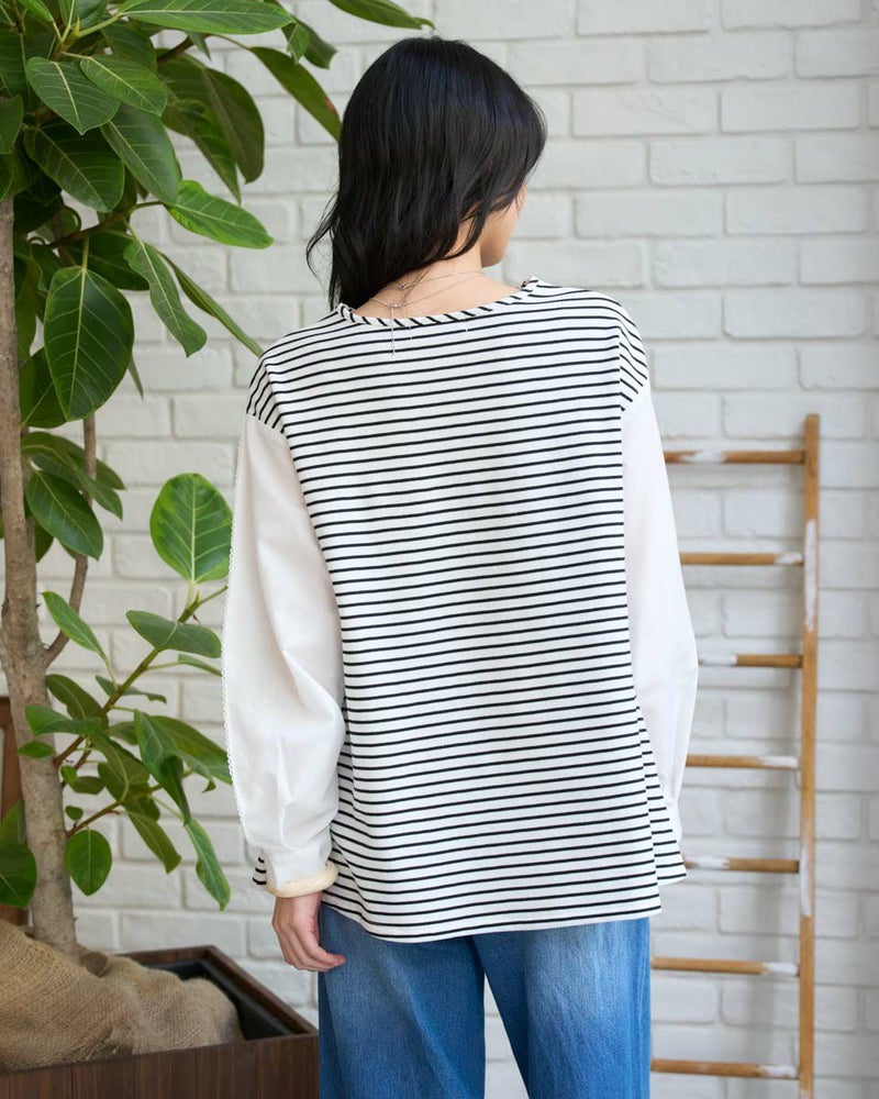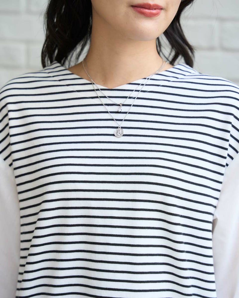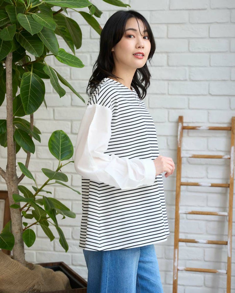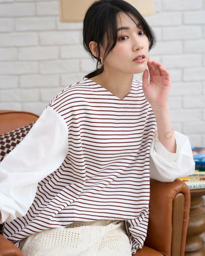 ボーダーに編んだワッフル調のカットソーを前後の身頃に使ったカットソー。細かい格子の表情にナチュラルな優しさも感じるアイテム。程よい張りと伸縮性に富み、ゆとりのある身頃もダレず清潔感を保ってお召しいただけます。ほのかに透ける布帛であしらった袖が軽やかで春らしさ満天のアイテム。小さなレースを連想させる袖山のピコットミシンもポイント!袖山線にカーブも付けているため腕にまとわり付かず、ふわりと膨らむ華やかな可愛らしさもイチ推しです!浅いVネックは華奢なネックレスとも好相性◎ボトムスは、パンツとの合わがバランス良くおススメです。