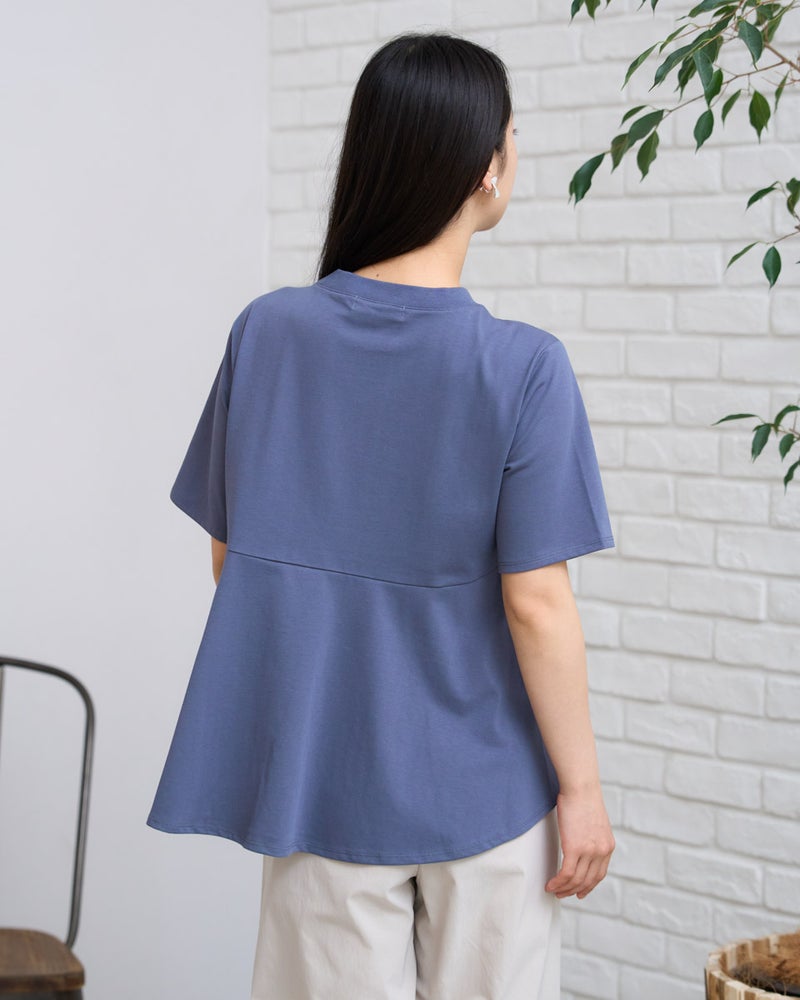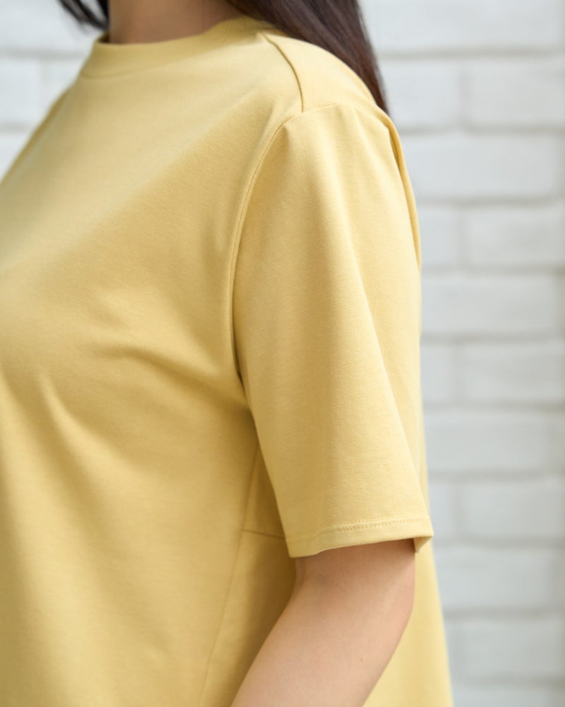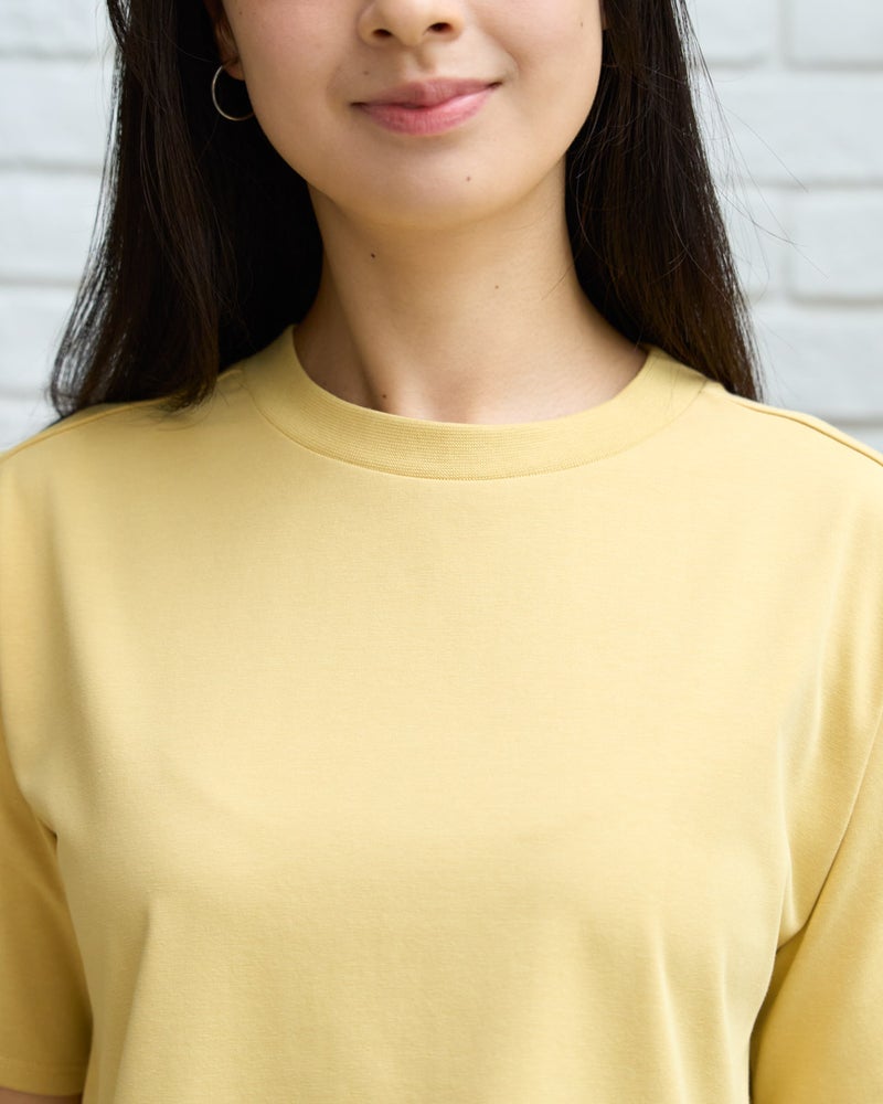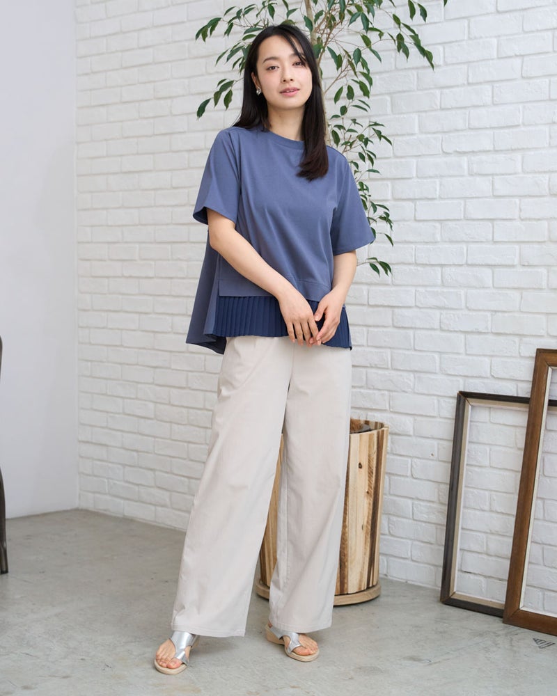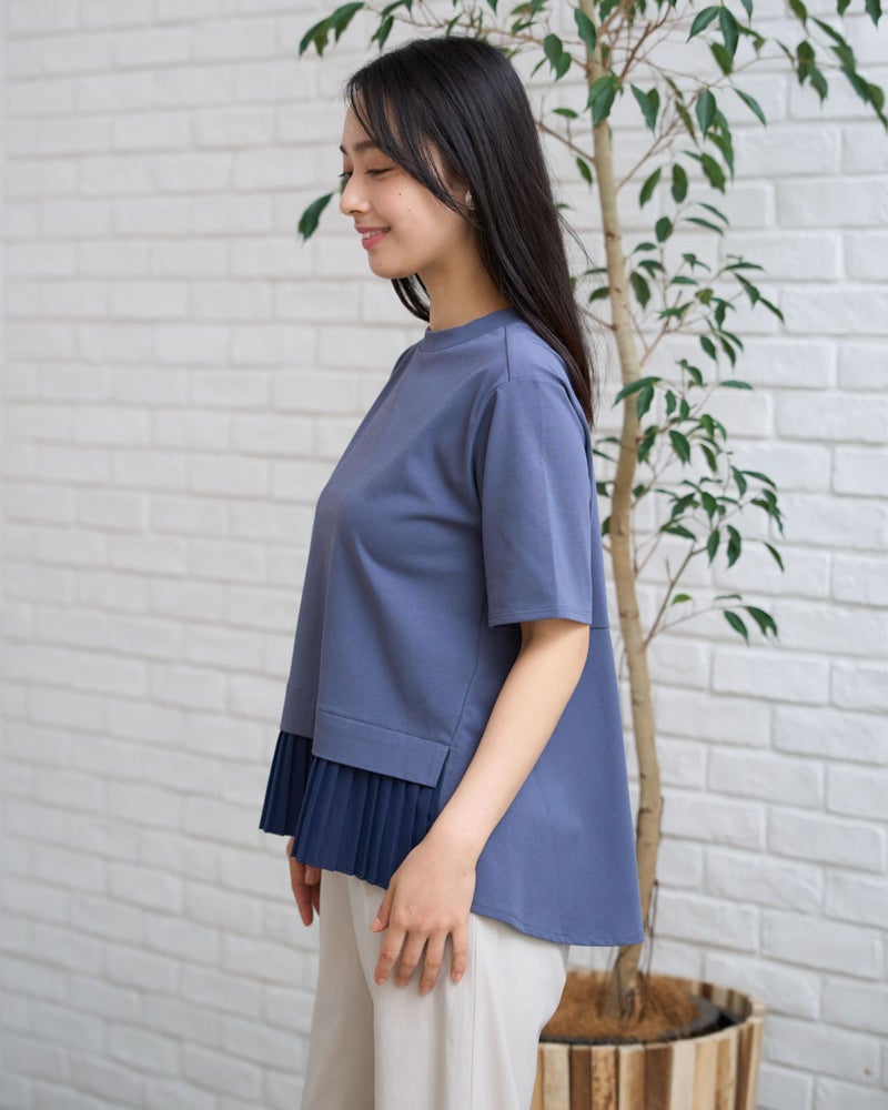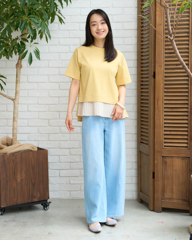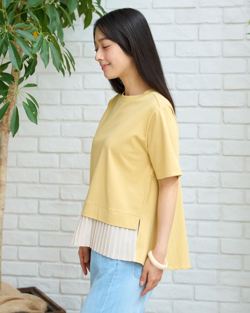 首元を優しく包むややハイネックが、品の良いお顔周りを作るカットソーです。さらっと肌触りの良い天竺素材をボディに使用し、裾には細かいプリーツを施したシフォンをあしらい、動きに上品さを演出します。カラーは春から初夏にかけて爽やかなイエローと柔らかいネイビーで展開し、ボトムカラーを選ばず着回しが効くのも魅力です。裾のシフォンプリーツが軽やかな印象を与え、オフィスやおしゃれな1枚着としてデイリーに活躍します。デニムやスラックスと合わせてディティールの軽やかさを引き立て、ネックレスやネイルでツヤを添える着こなしもおすすめです。
