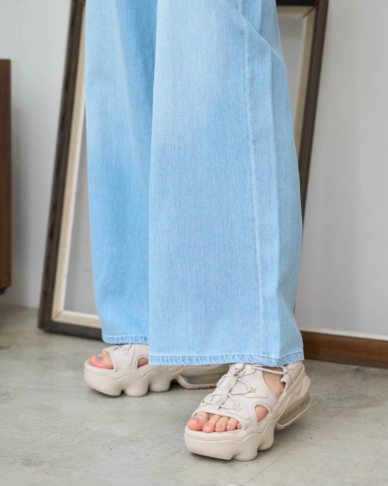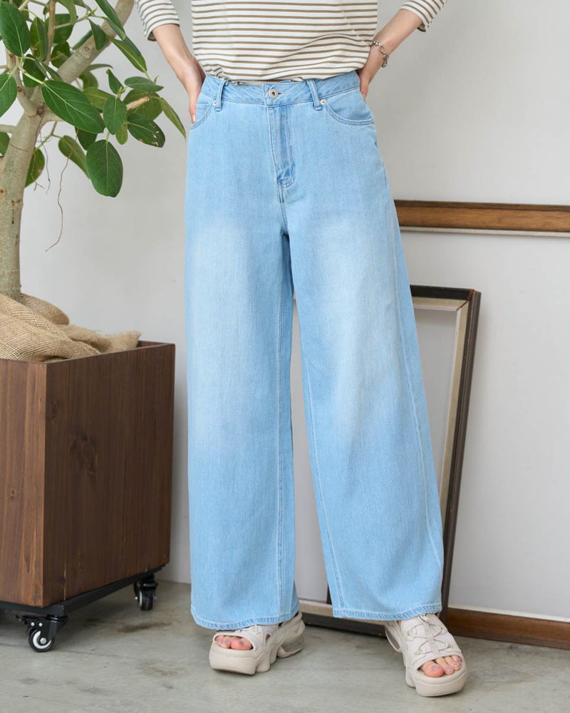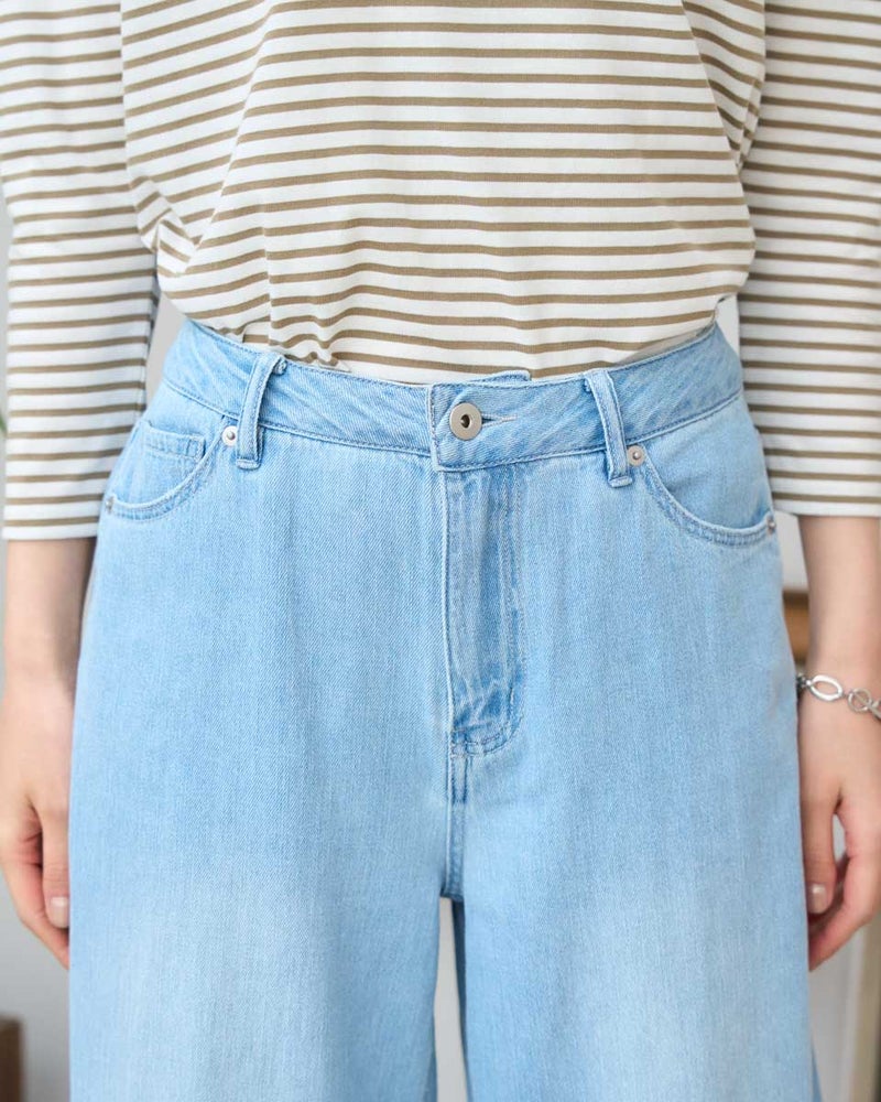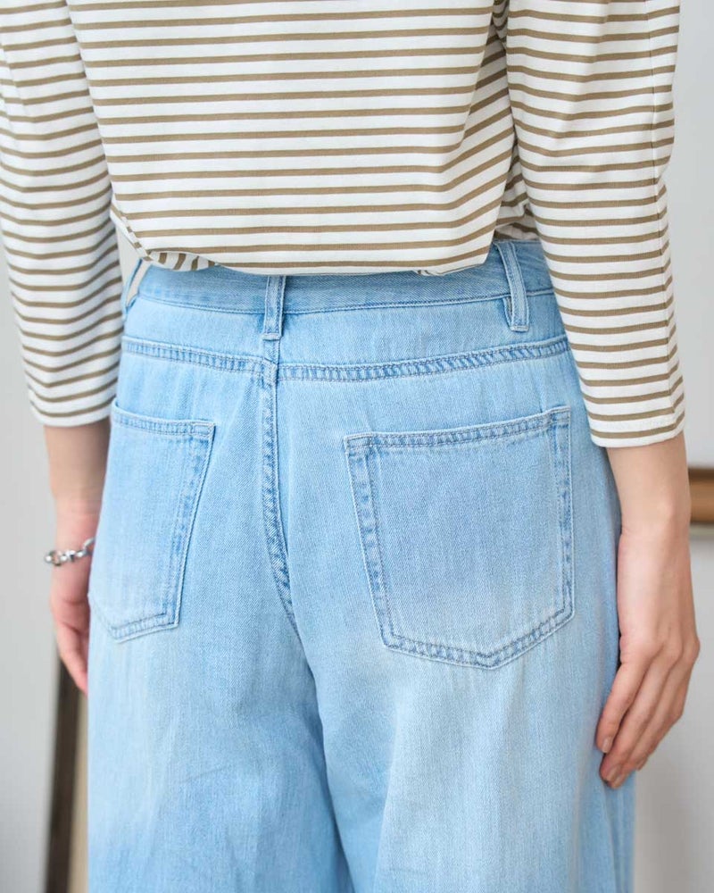 いつものデニムよりも格段に薄手で柔らかい6oz素材を厳選した、軽やかなワイドデニムです。デニム特有のゴワつきを抑え、バイオ・ブリーチ加工によるしなやかで優しいタッチに仕上げました。ほどよく揺れるワイドシルエットと、お腹周りを圧迫しにくいミドルライズ設計により、リラックスした快適な履き心地を実現。極限までブリーチした明るいブルーは、4月の爽やかな陽光にぴったりで、シンプルなTシャツを合わせるだけでこなれ感のある装いに。洗濯機洗いが可能で、洗うほどに自分だけの柔らかい風合いに育っていく過程を楽しみながら、長くご愛用いただける一本です。 モデル身長: 166 cm 着用サイズ: 64 サイズ Golden Bear White Label (WOMEN) ボトムス (WOMEN) 【着用アイテム】467U4430 オーガニックコットンTシャツ 467U4431 星条旗ベアTシャツ 467U4430 オーガニックコットンTシャツ 468U4452 マリンボーダーカットソー