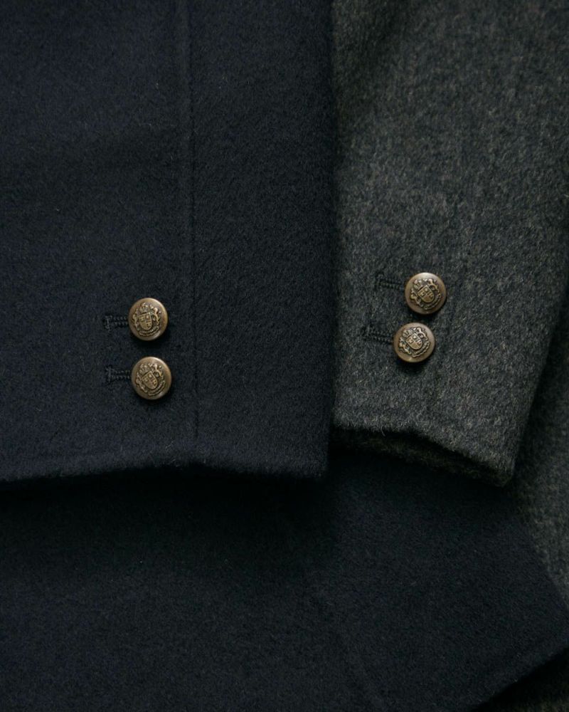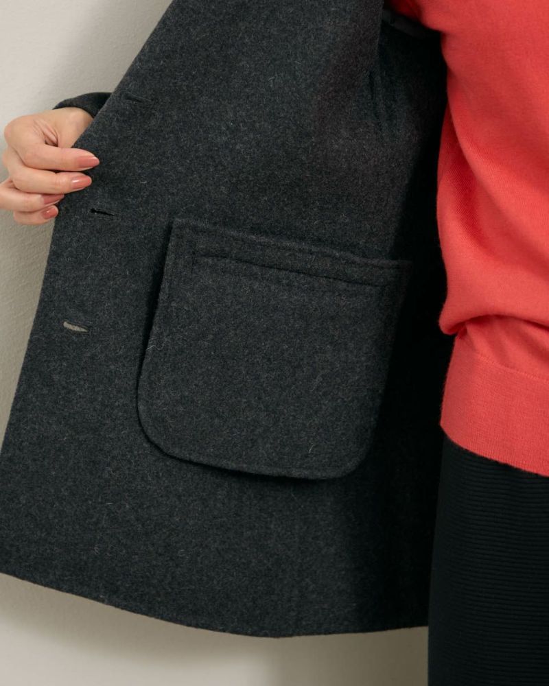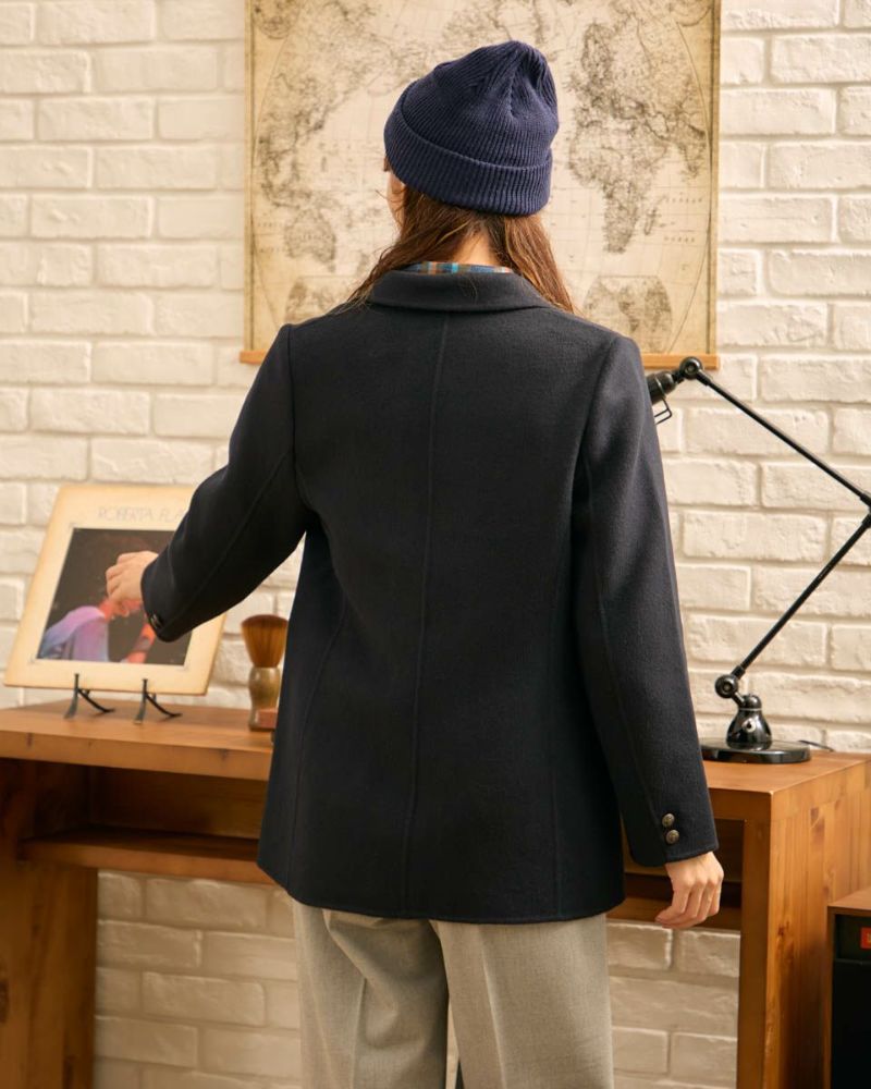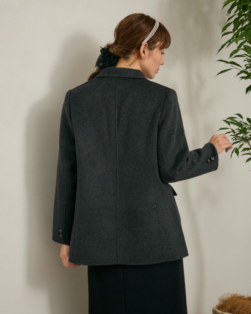 ウール混の二重織素材を使用し、一枚仕立てに仕上げたテーラードジャケットです。(二重織とは:2枚の生地を重ねて1枚に仕上げる織り方の事です。コートやタオル等ふわふわとした素材の物に使われる事が多く、柔らかさと保温性の高さが特徴です)アンティックゴールドの釦がポイントで、同色染をしたベーシックな釦も1セット付けていますので、お好みで釦をアレンジできます。袖のみ滑りが良い様に裏地を付けています。色はトップグレーとネイビーの2色です。 モデル身長: 171 cm 着用サイズ: M サイズ Jack Nicklaus (Ladies') アウター (Ladies') 【着用アイテム】467QC411 タートルネックTシャツ 467QC610 カーディガン 467QD331 チェックシャツ 467QC712 スカート 468QD750 ストレートパンツ