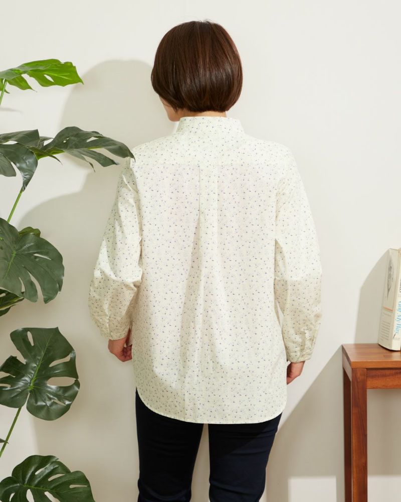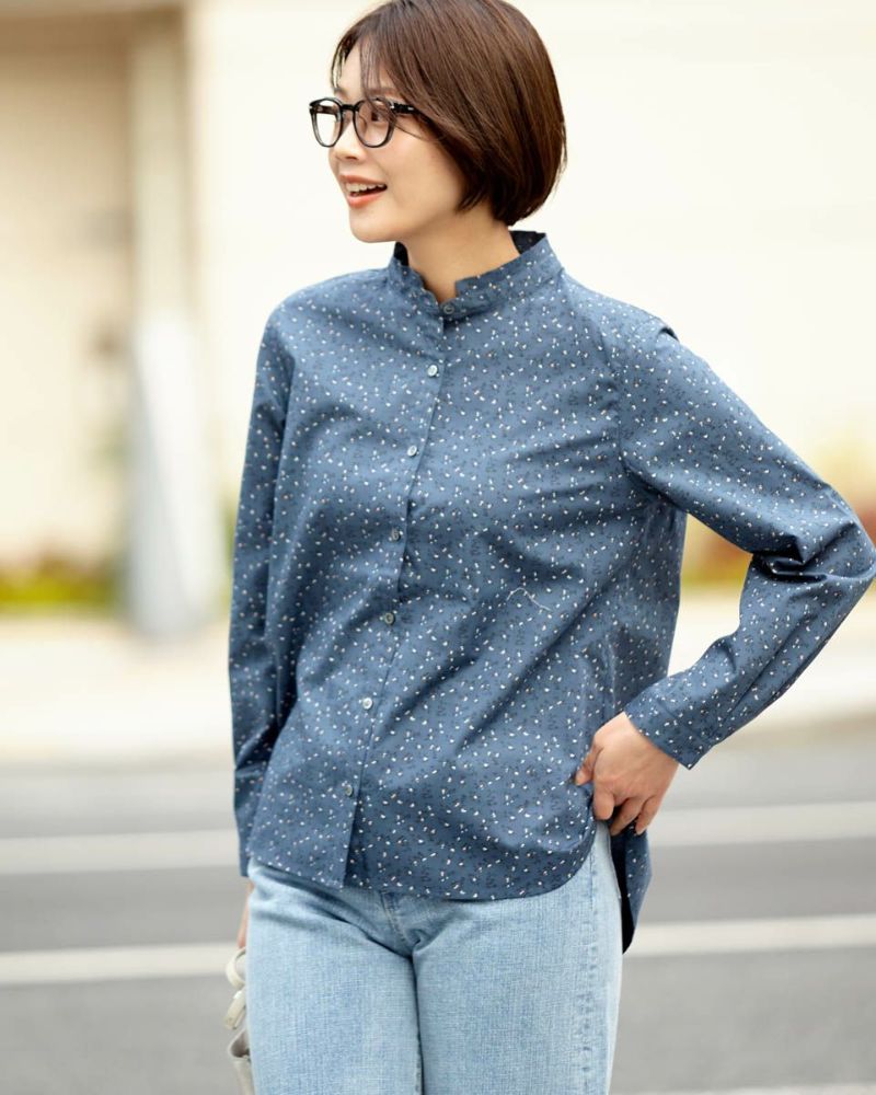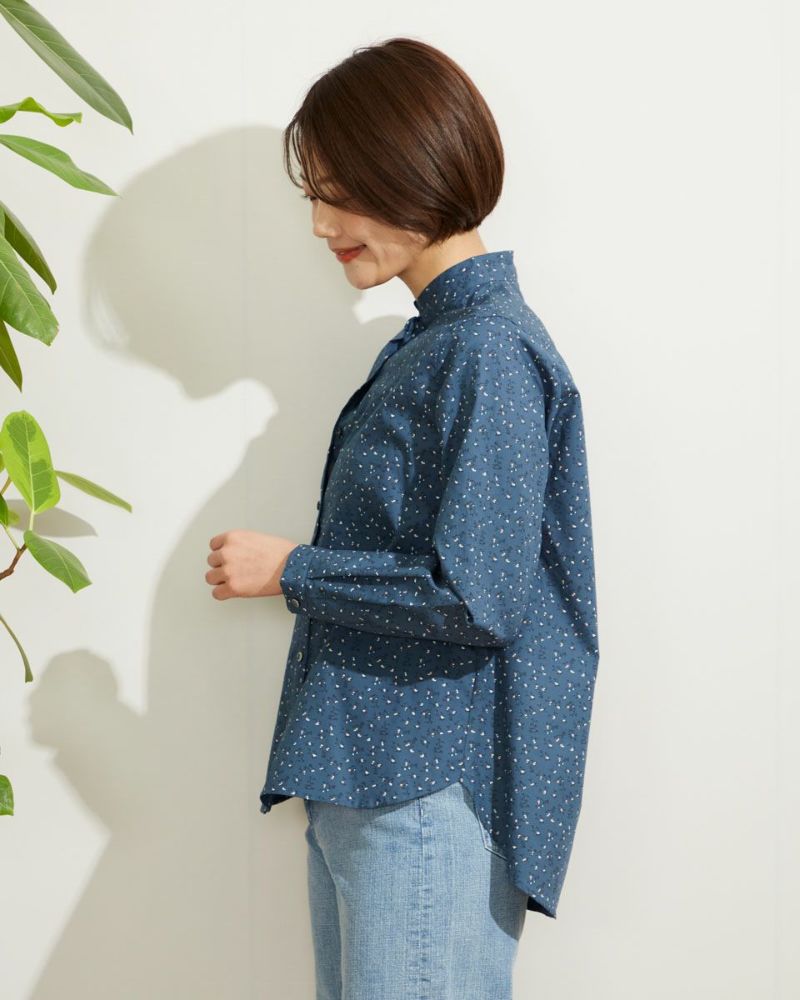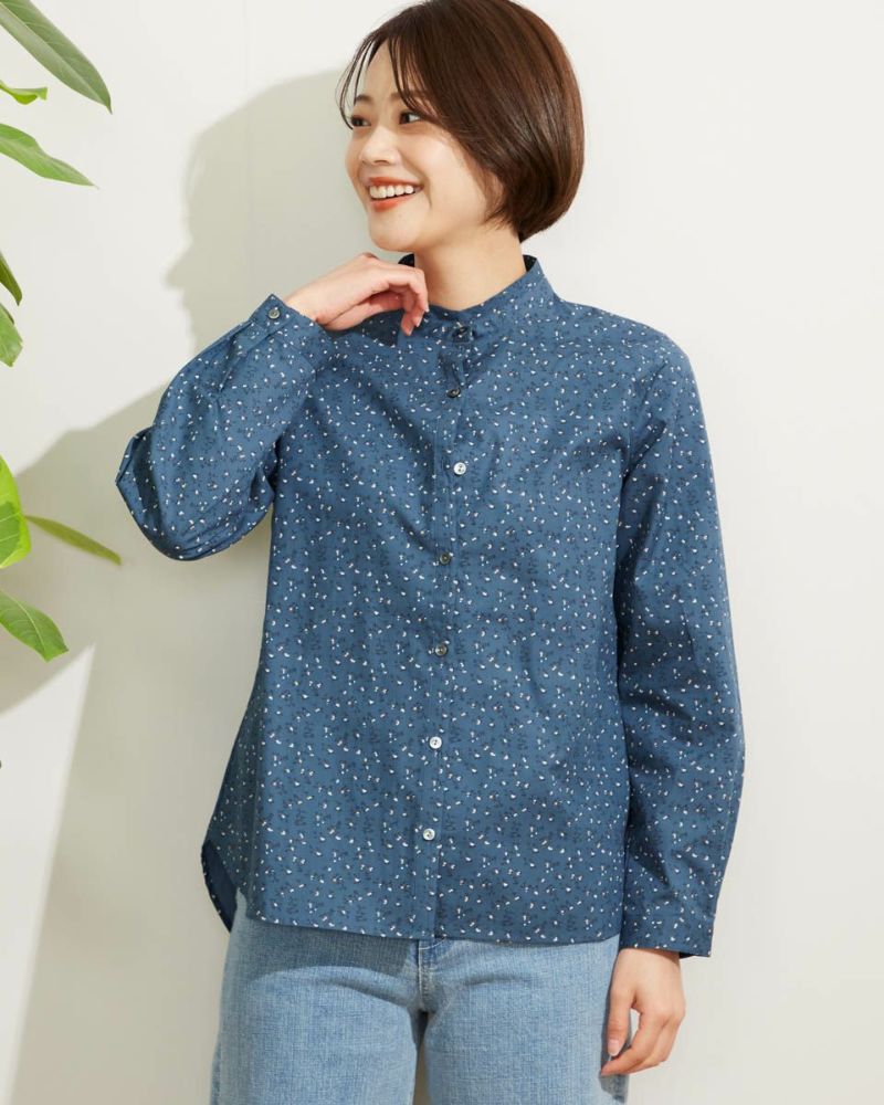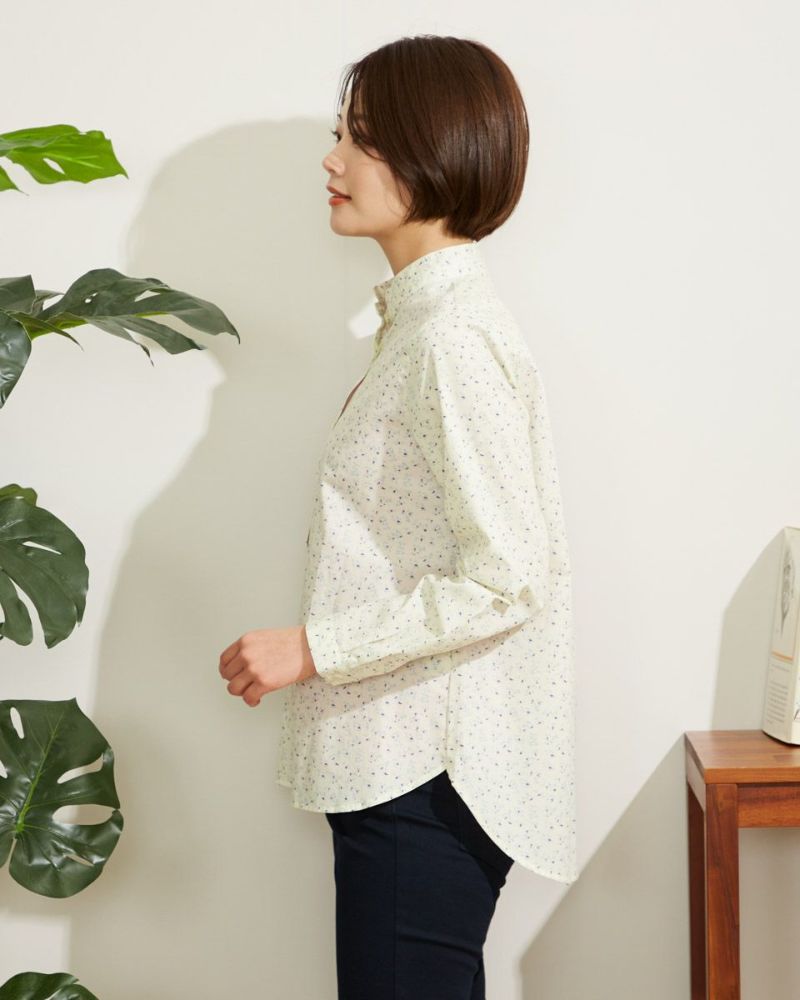 小花プリントがコーディネートに映える1枚。きちんと見えの小さなスタンドカラーで甘くなり過ぎない印象に仕上げました。1枚着ではもちろんインナーとして首元からスタンドカラーを覗かせた着こなしも素敵です。 モデル身長: 167 cm 着用サイズ: M サイズ 同デザイン通常サイズはこちら Golden Bear QUEEN SIZE(Ladies' 大きいサイズ ) ブラウス (Ladies')