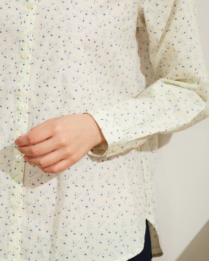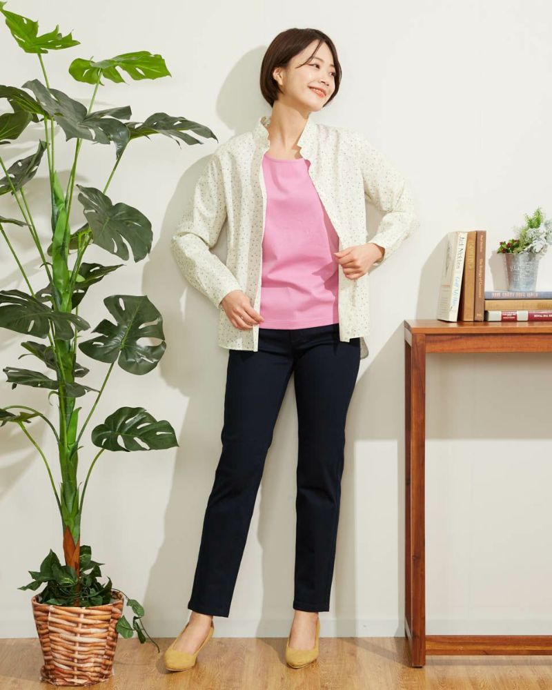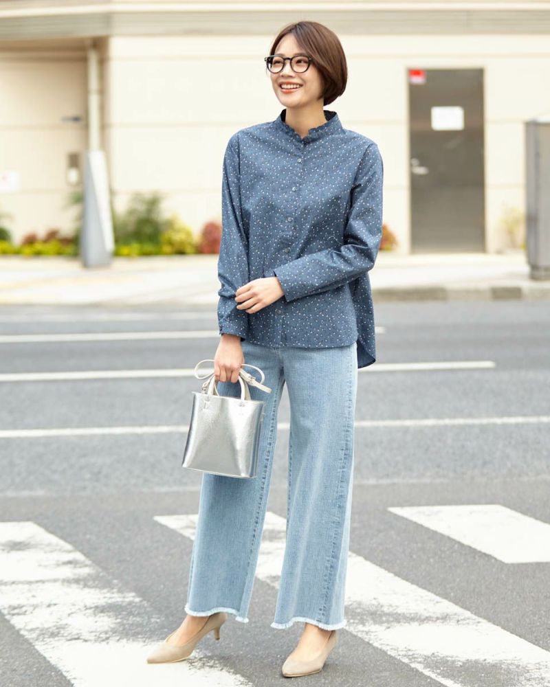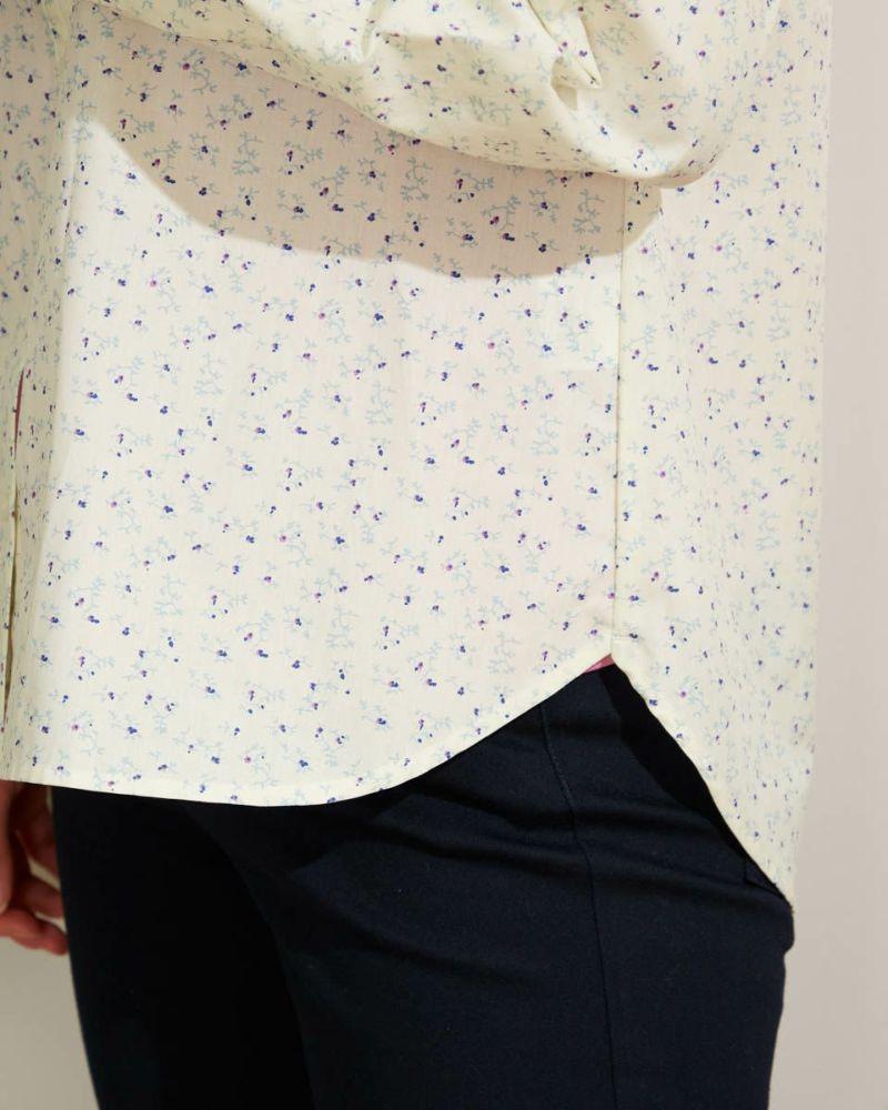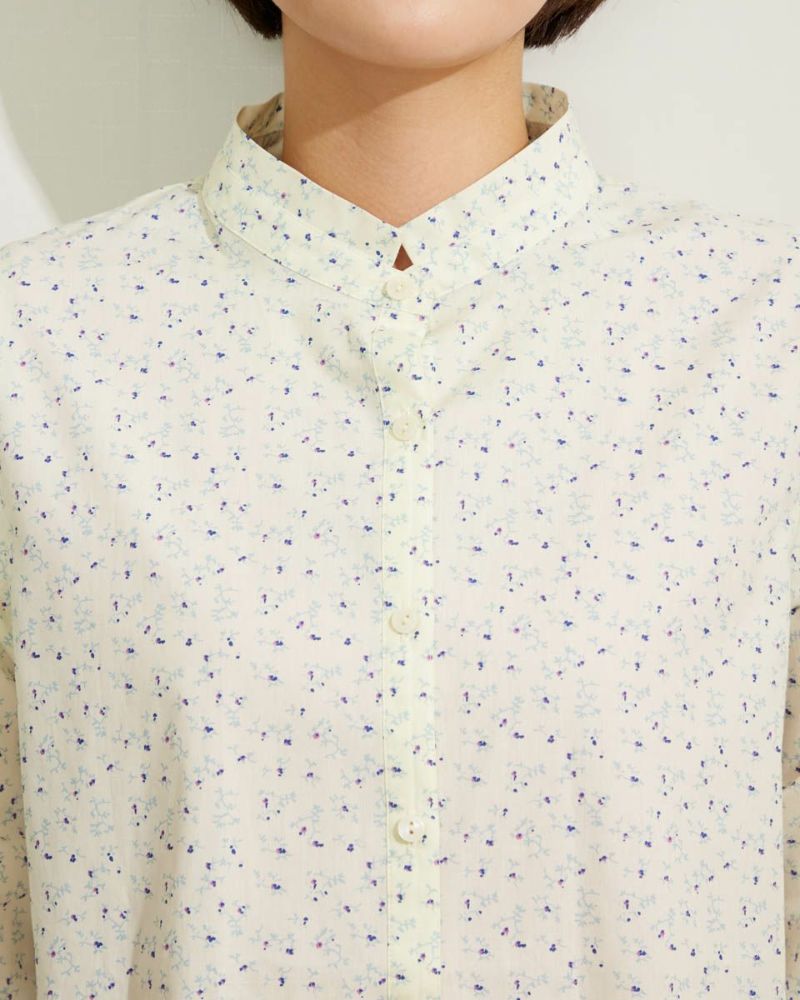 小花プリントがコーディネートに映える1枚。きちんと見えの小さなスタンドカラーで甘くなり過ぎない印象に仕上げました。1枚着ではもちろんインナーとして首元からスタンドカラーを覗かせた着こなしも素敵です。 モデル身長: 167 cm 着用サイズ: M サイズ 同デザイン通常サイズはこちら Golden Bear QUEEN SIZE(Ladies' 大きいサイズ ) ブラウス (Ladies')