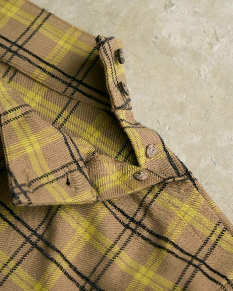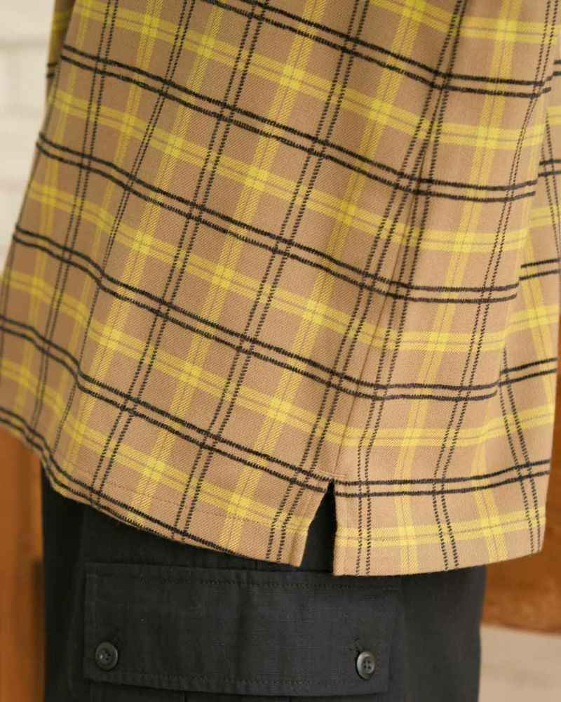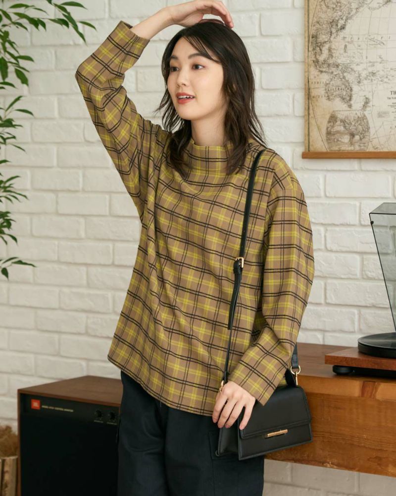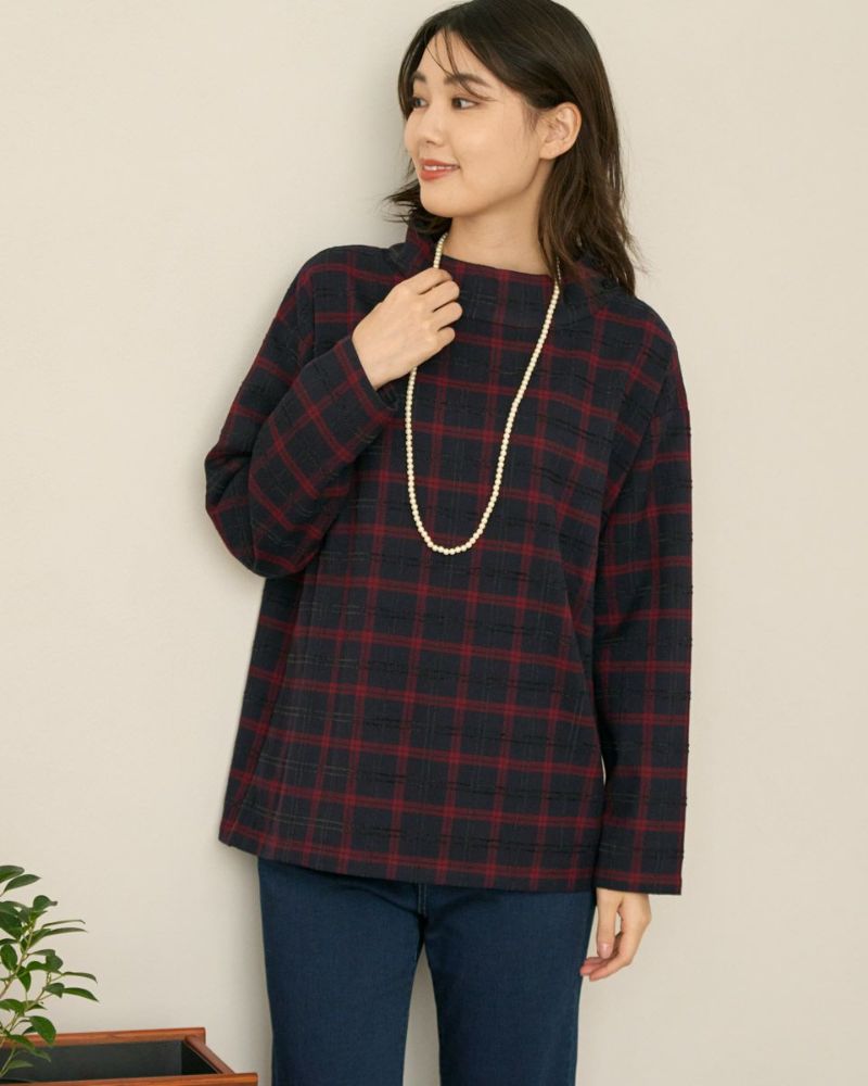チェック部分にモール糸を施して凹凸感を出した生地を使用しています。ボートネック状のスタンドカラーは顔まわりをすっきりと華奢に見せてくれます。ボックスシルエットの程よいサイズ感で1枚でも着こなしが決まります。