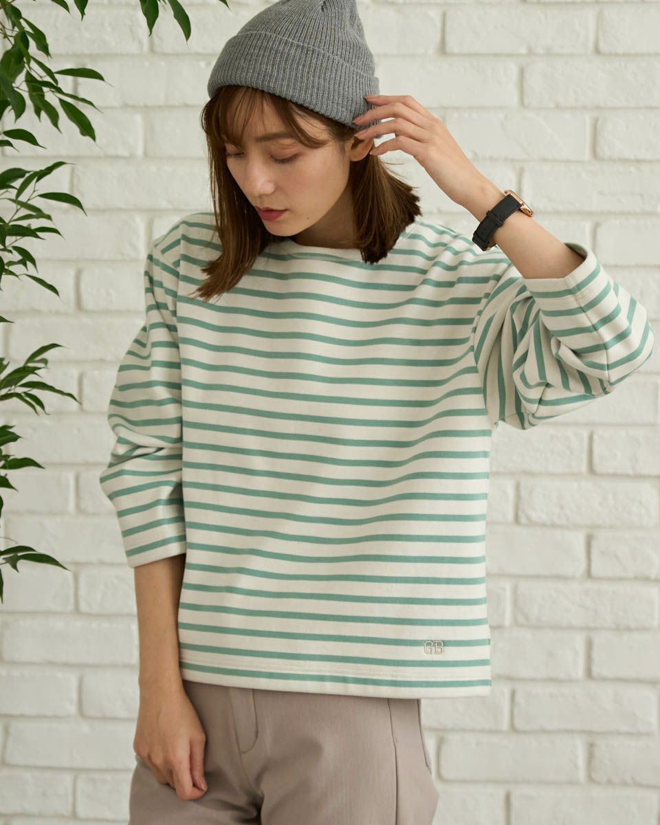 裏にシャギーフリースをボンディングしたボーダーTシャツ。明るく軽めな印象ですが裏のシャギーのタッチがソフトで暖かく、寒い時期におすすめのアイテムです。フューシャピンクとエメラルドグリーンのボーダーカラーもポイントです。 モデル身長: 171 cm 着用サイズ: M サイズ Golden Bear QUEEN SIZE(WOMEN 大きいサイズ ) カットソー (WOMEN) 同デザイン通常サイズはこちら