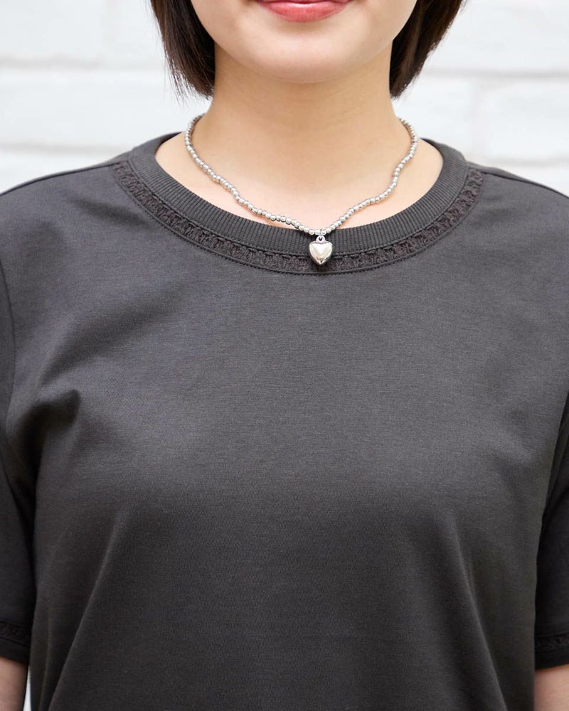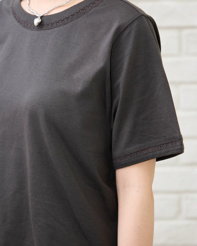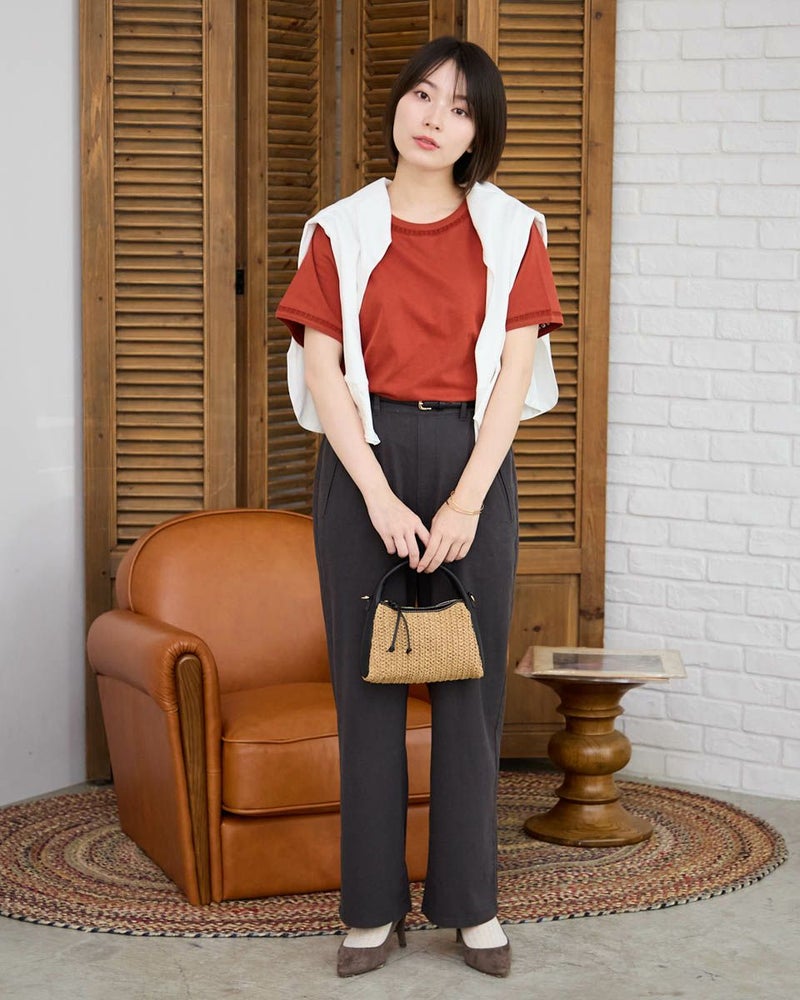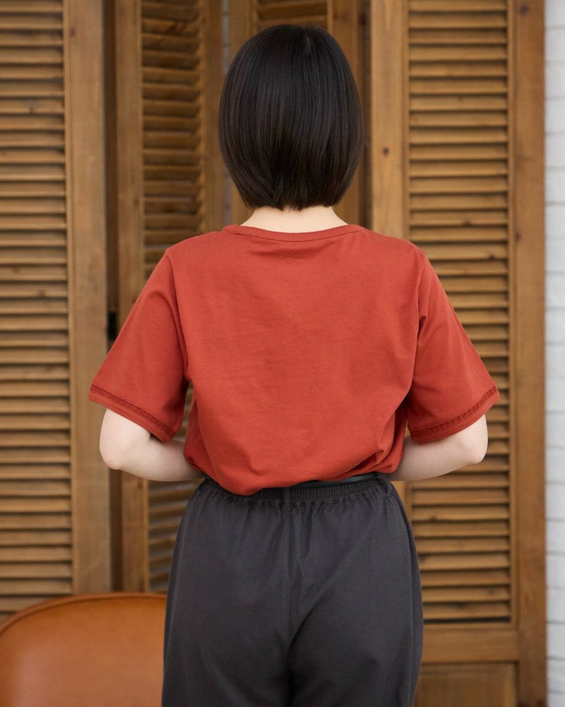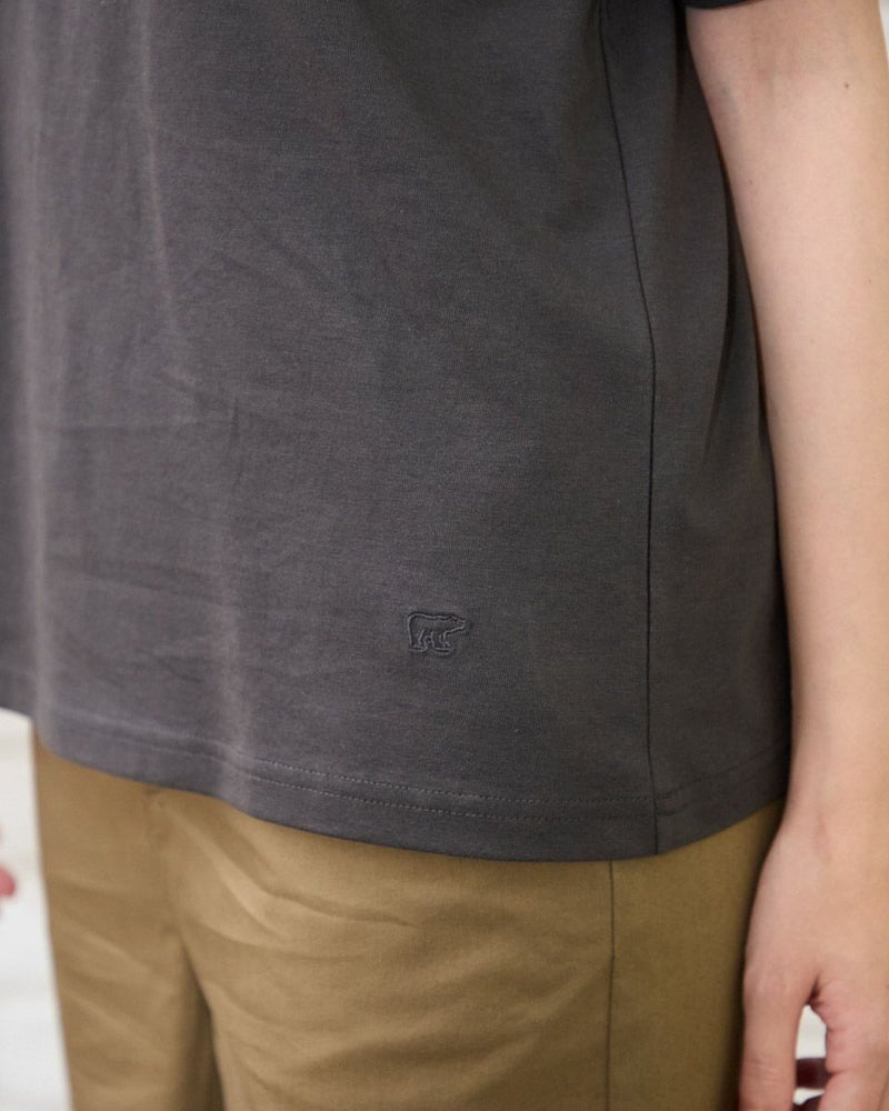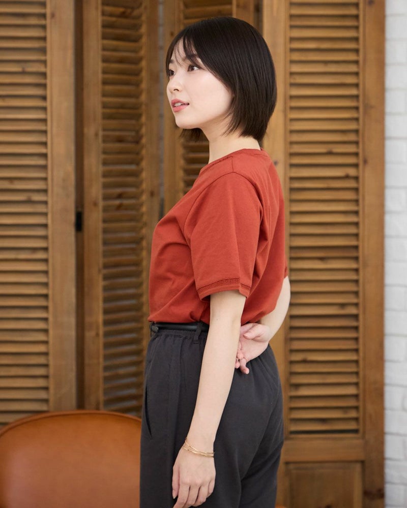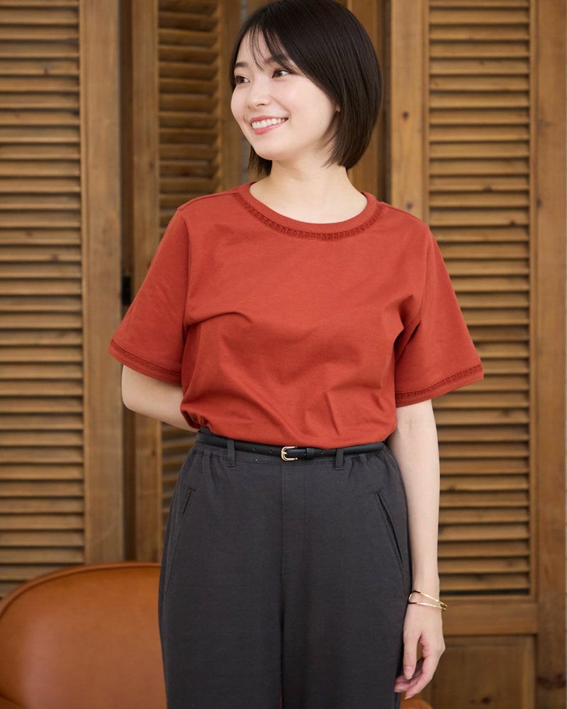 オーガニックコットン100%のシンプルなTシャツです。袖と襟にはしごレースを切り替え、軽さを出しました。裾の枠のくま刺繍がアクセントです。 モデル身長: 162 cm 着用サイズ: M サイズ Golden Bear QUEEN SIZE(WOMEN 大きいサイズ ) カットソー (WOMEN) 同デザイン通常サイズはこちら 【着用アイテム】467R6701 レーヨンリネンストレッチパンツ 467R6712 バルーンパンツ